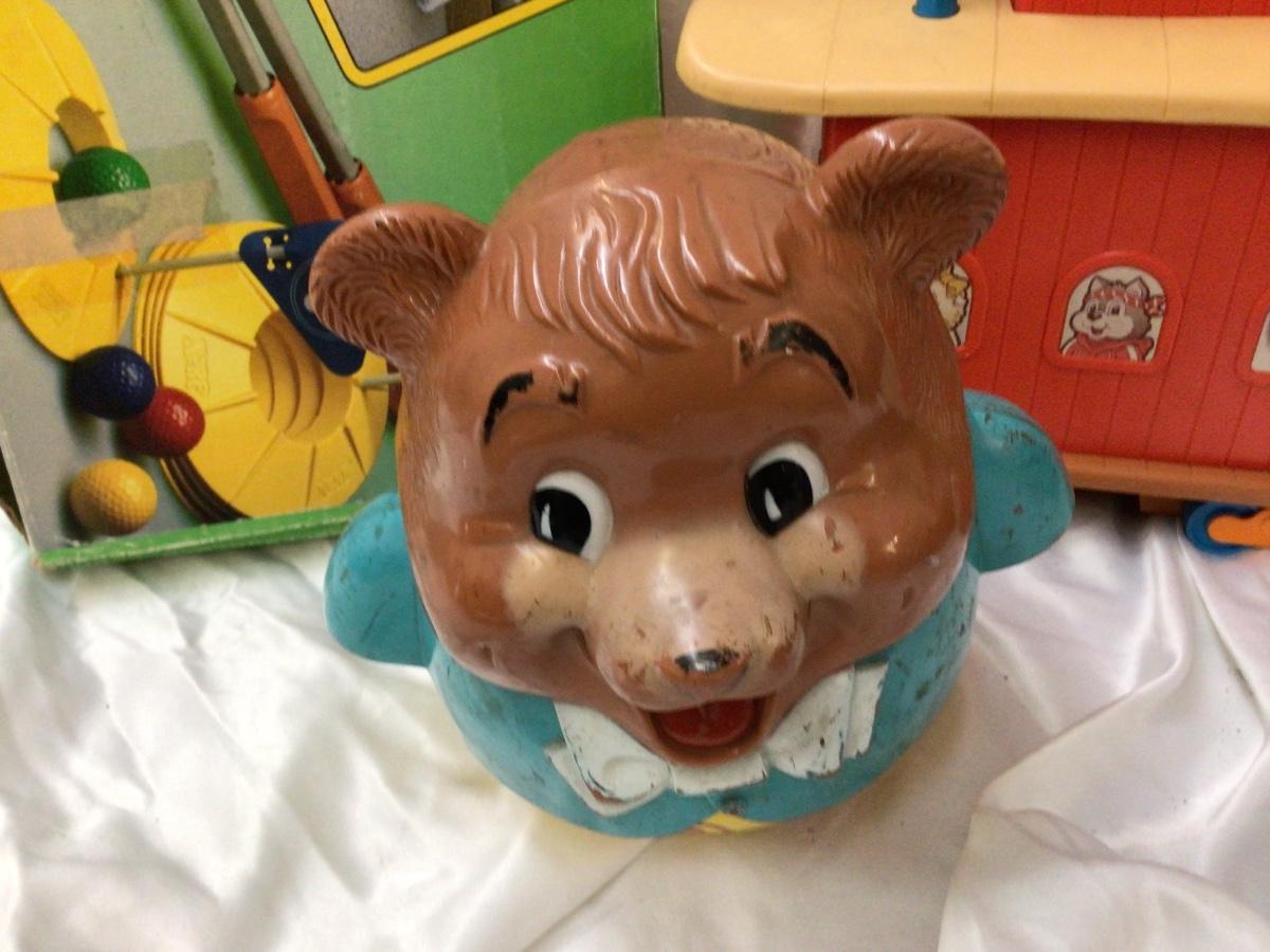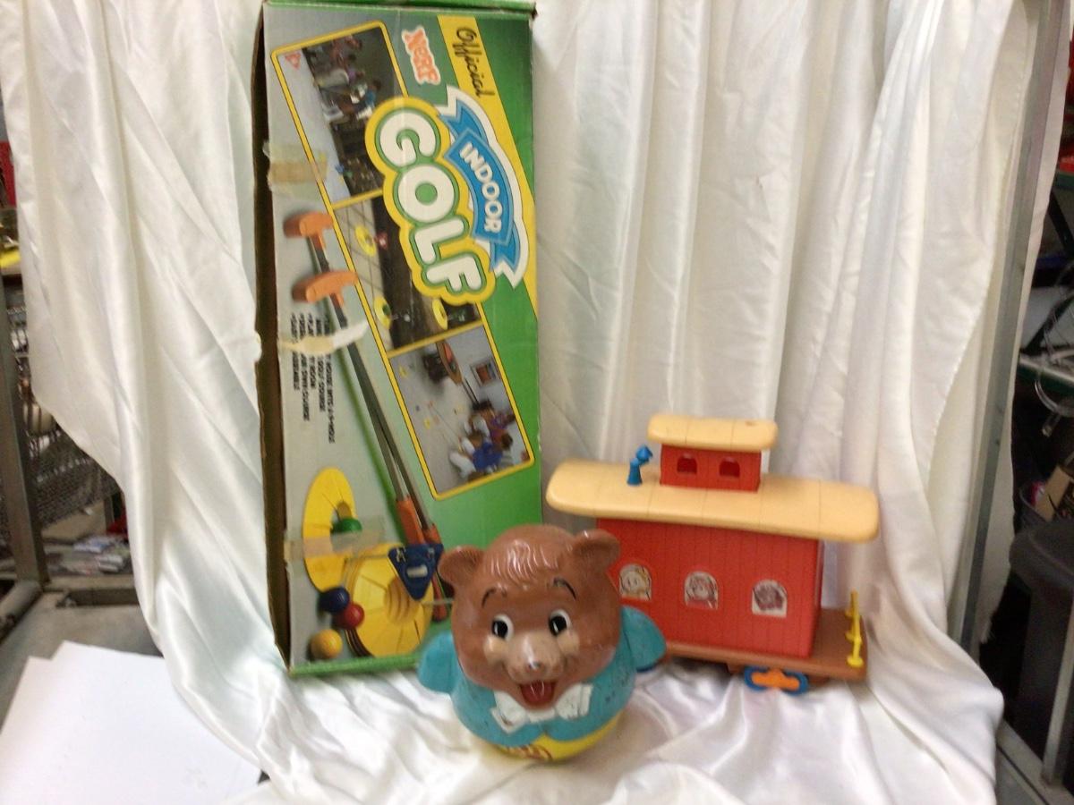 You get three great vintage toys. The ball bear, plastic caboose and Nurf Indoor golf. Golf set has everything, but all are played with.