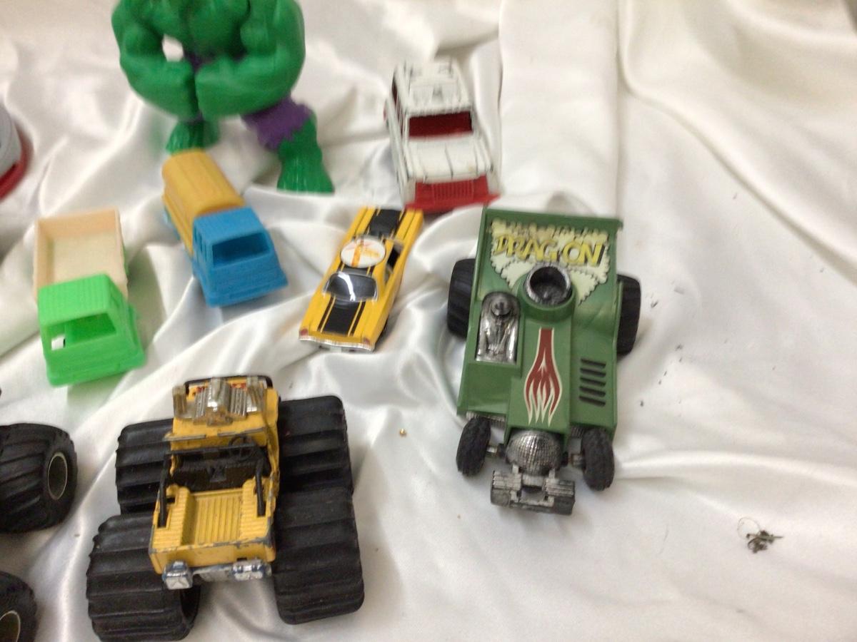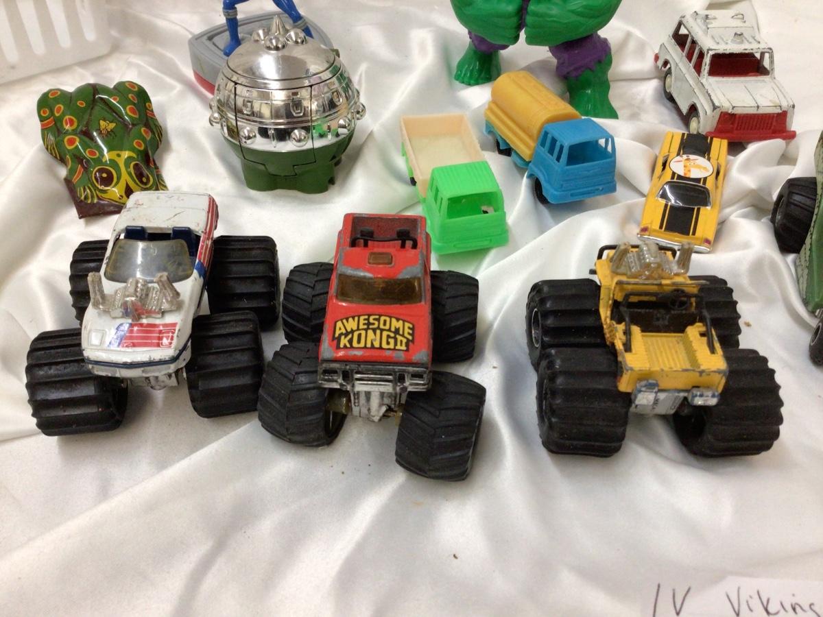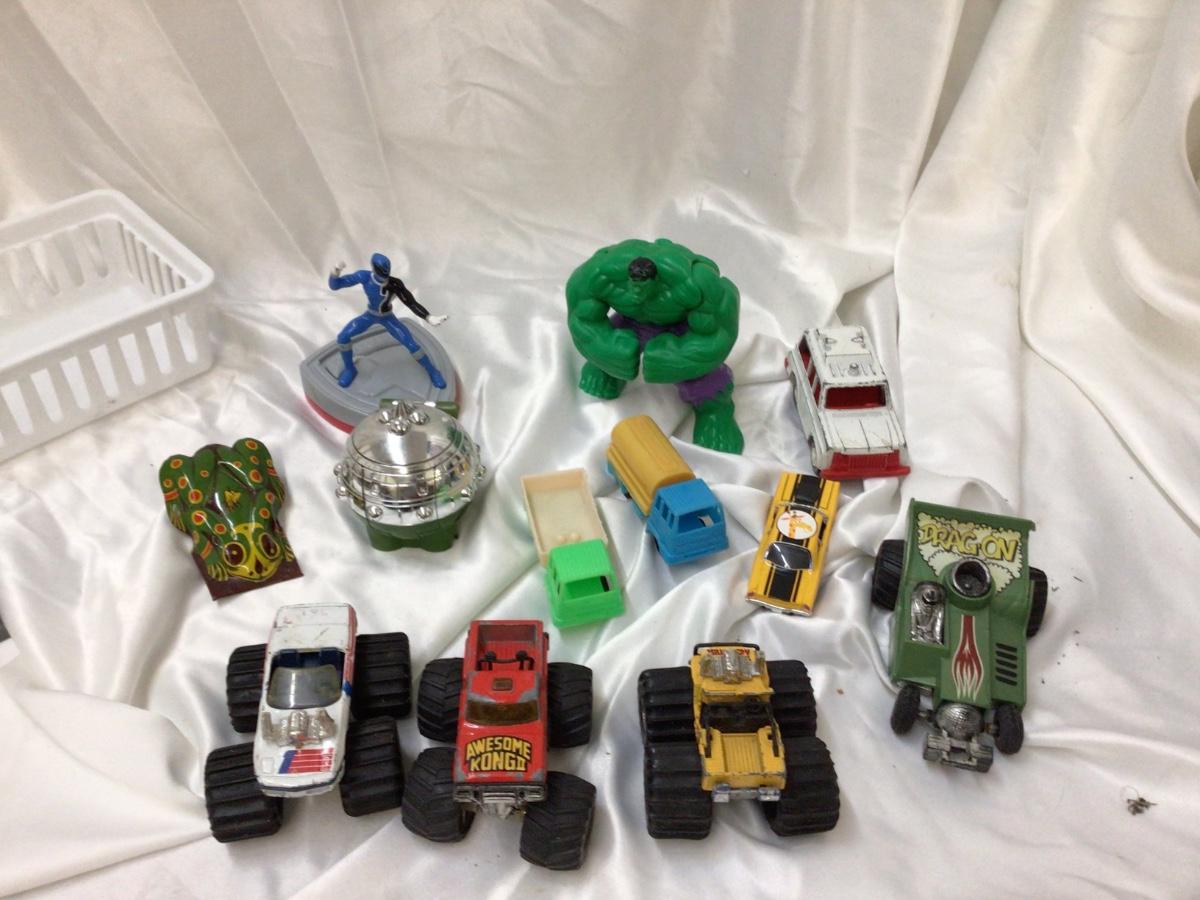 You get a variety of toys 3 Monster trucks, tootsies toy ambulance race car, two plastic trucks one is Shell, Et orb, frog clicker, Race car, Hulk fig, Blue Power Ranger.