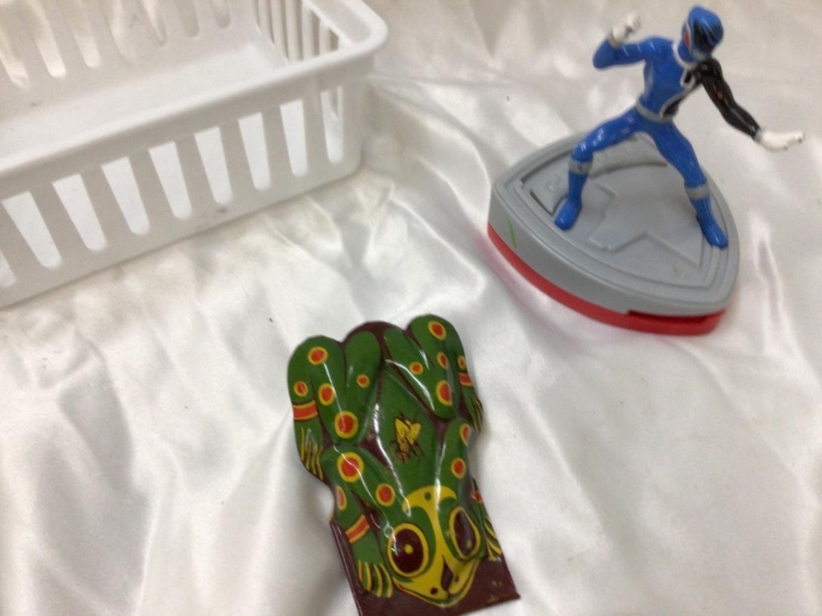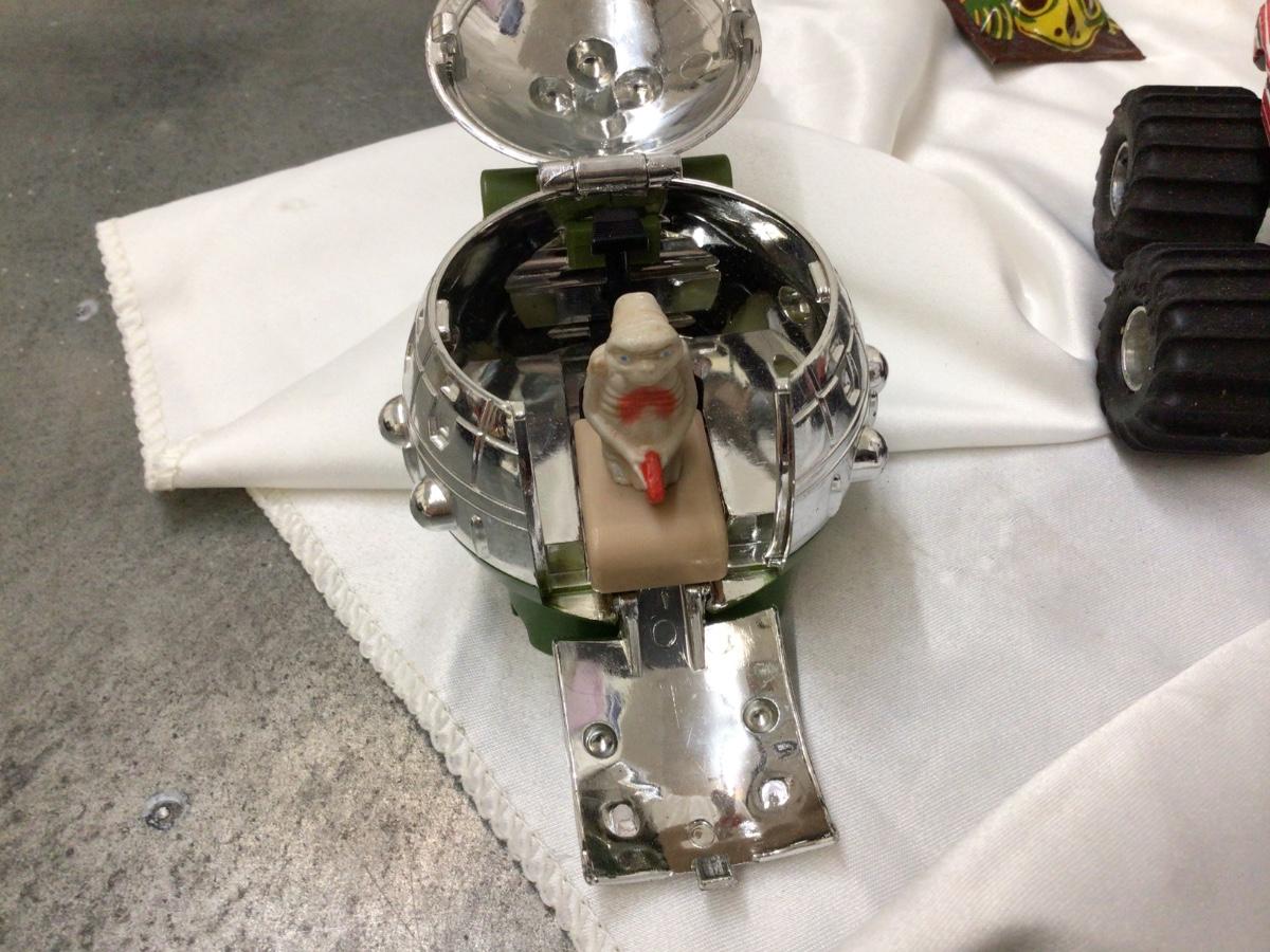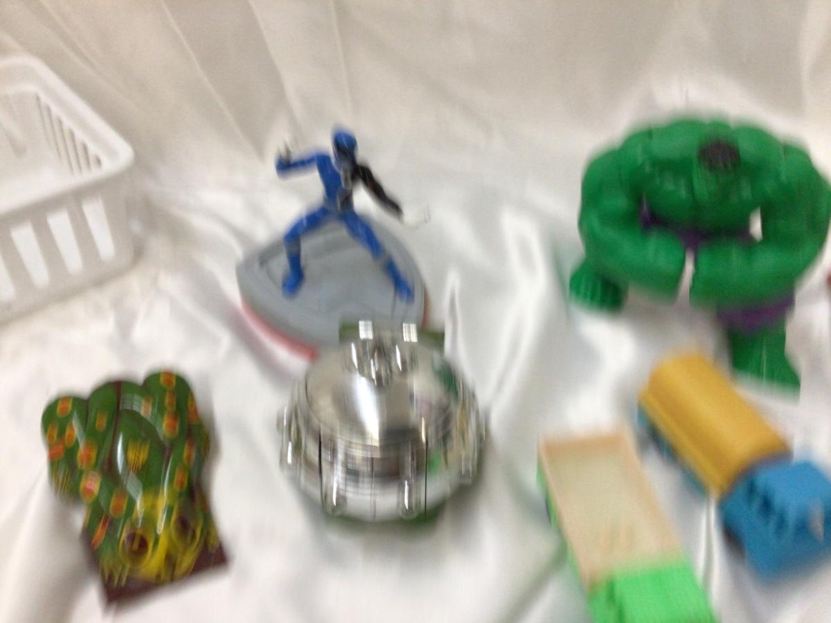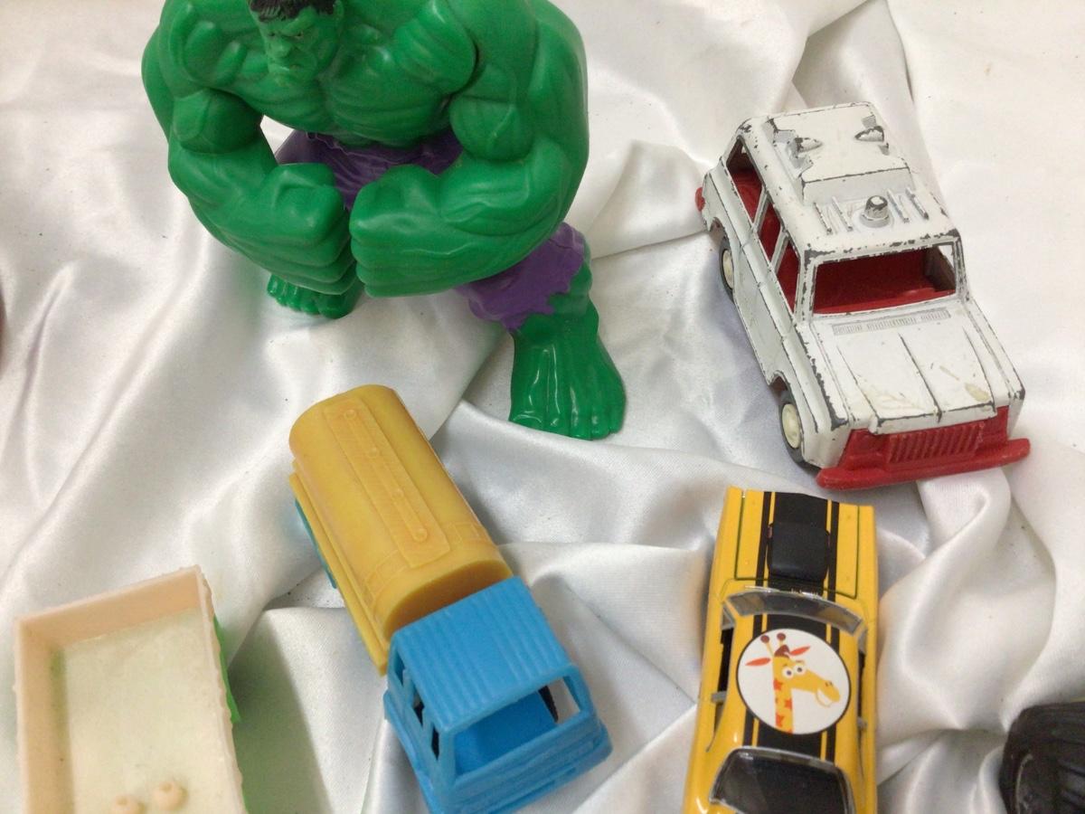 You get a variety of toys 3 Monster trucks, tootsies toy ambulance race car, two plastic trucks one is Shell, Et orb, frog clicker, Race car, Hulk fig, Blue Power Ranger.