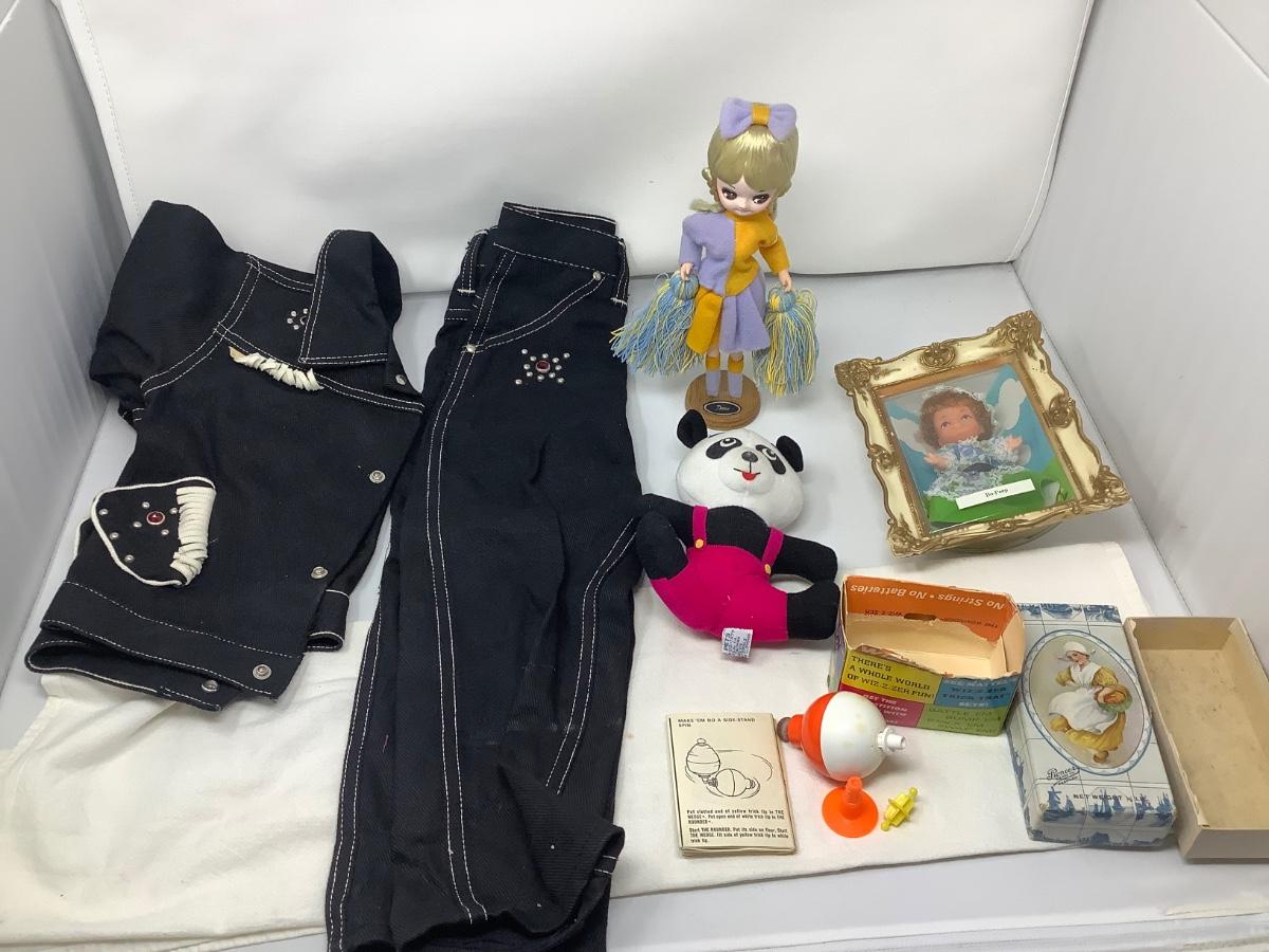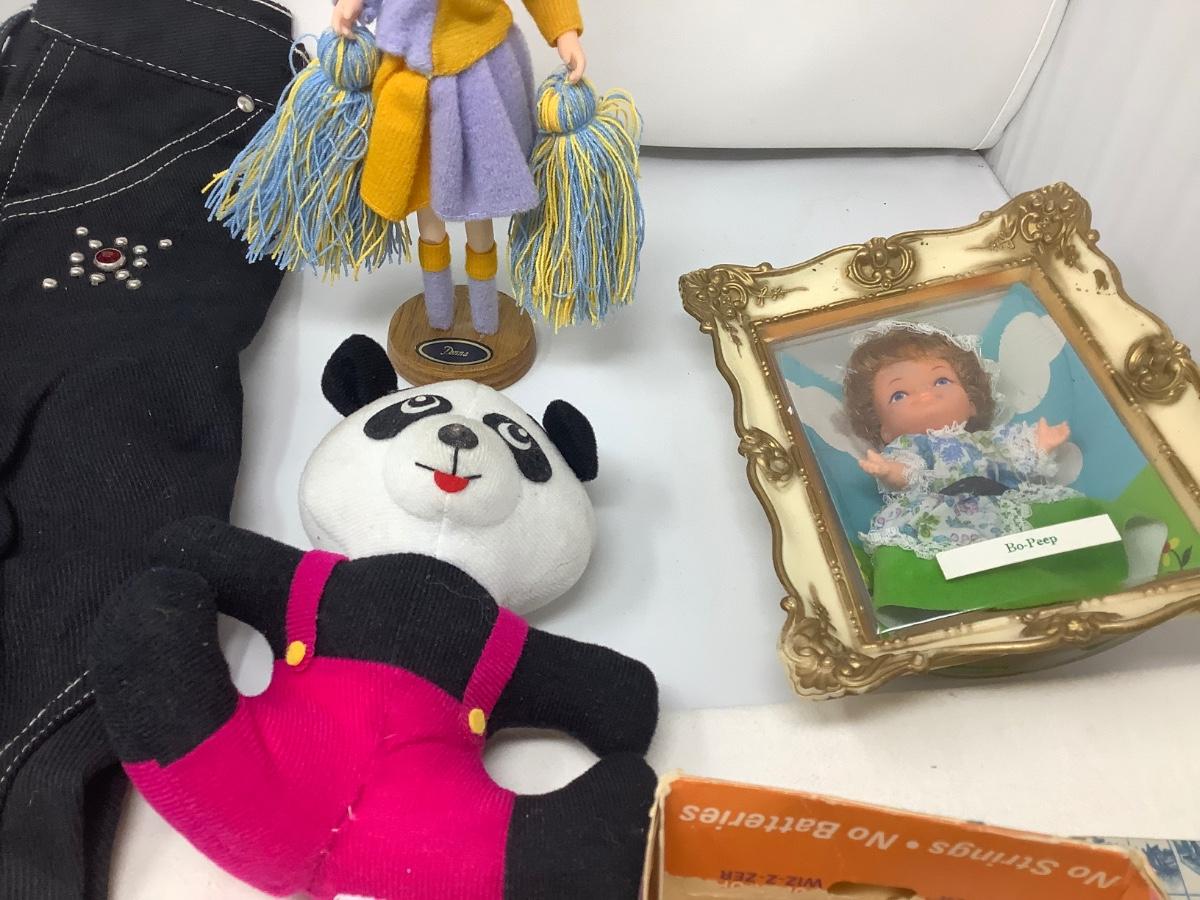 You get a great kids cowboy costume, Bradley Doll, Bo Peep, Panda Plushy, toy top in box and a candy box only.