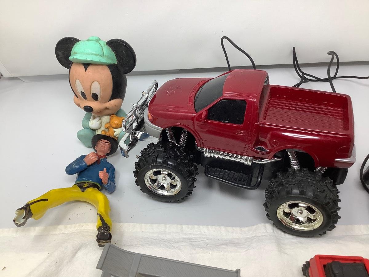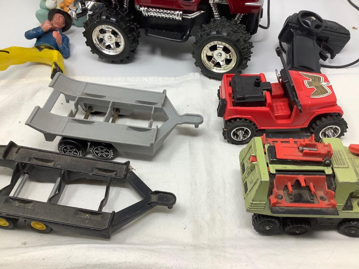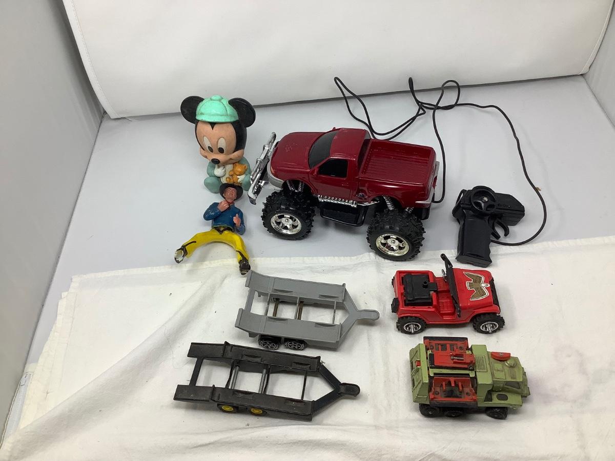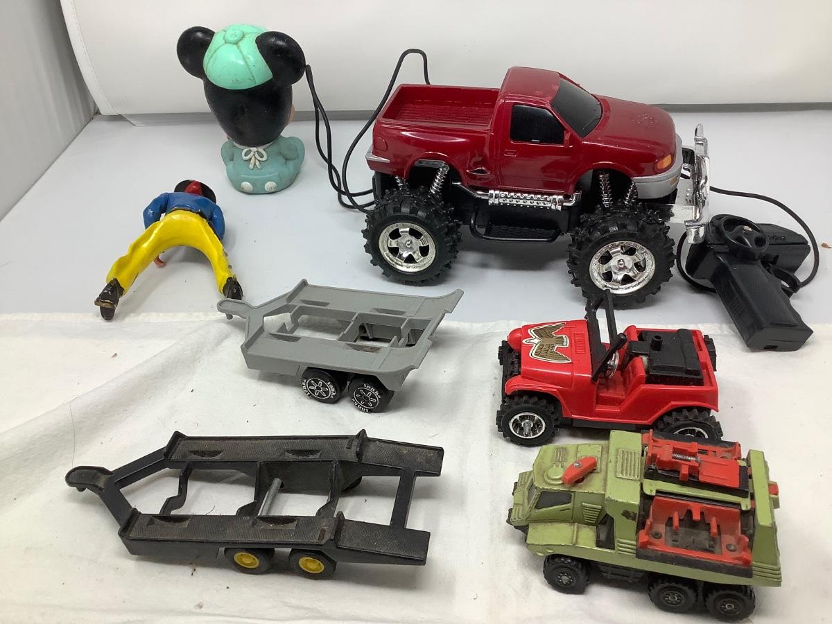 2 Tonka trailers, Jeep, Matchbox Car, Remote control truck, Mickie, Cowboy