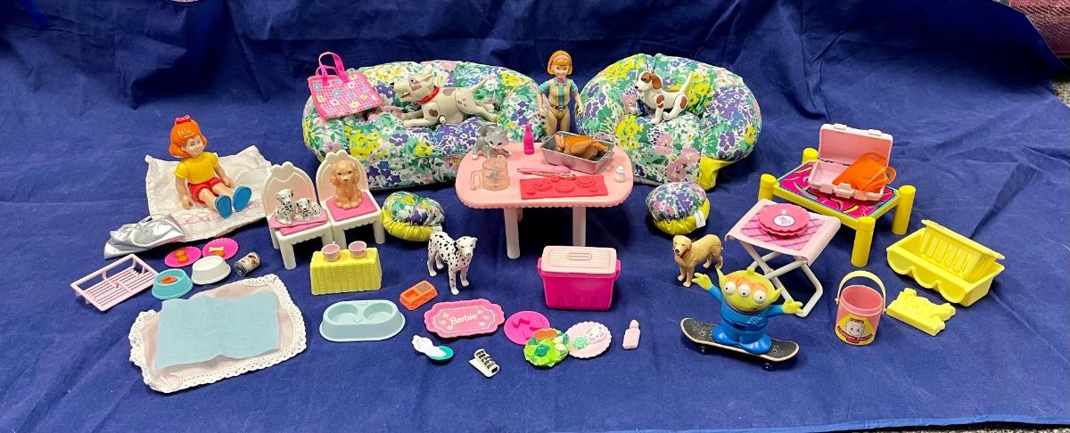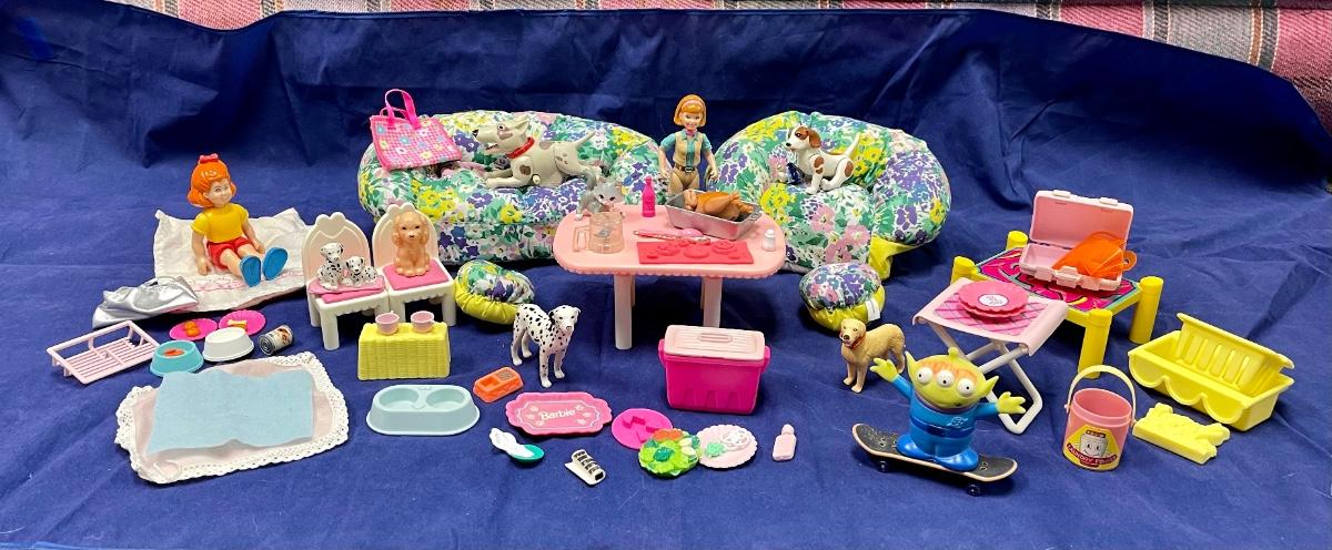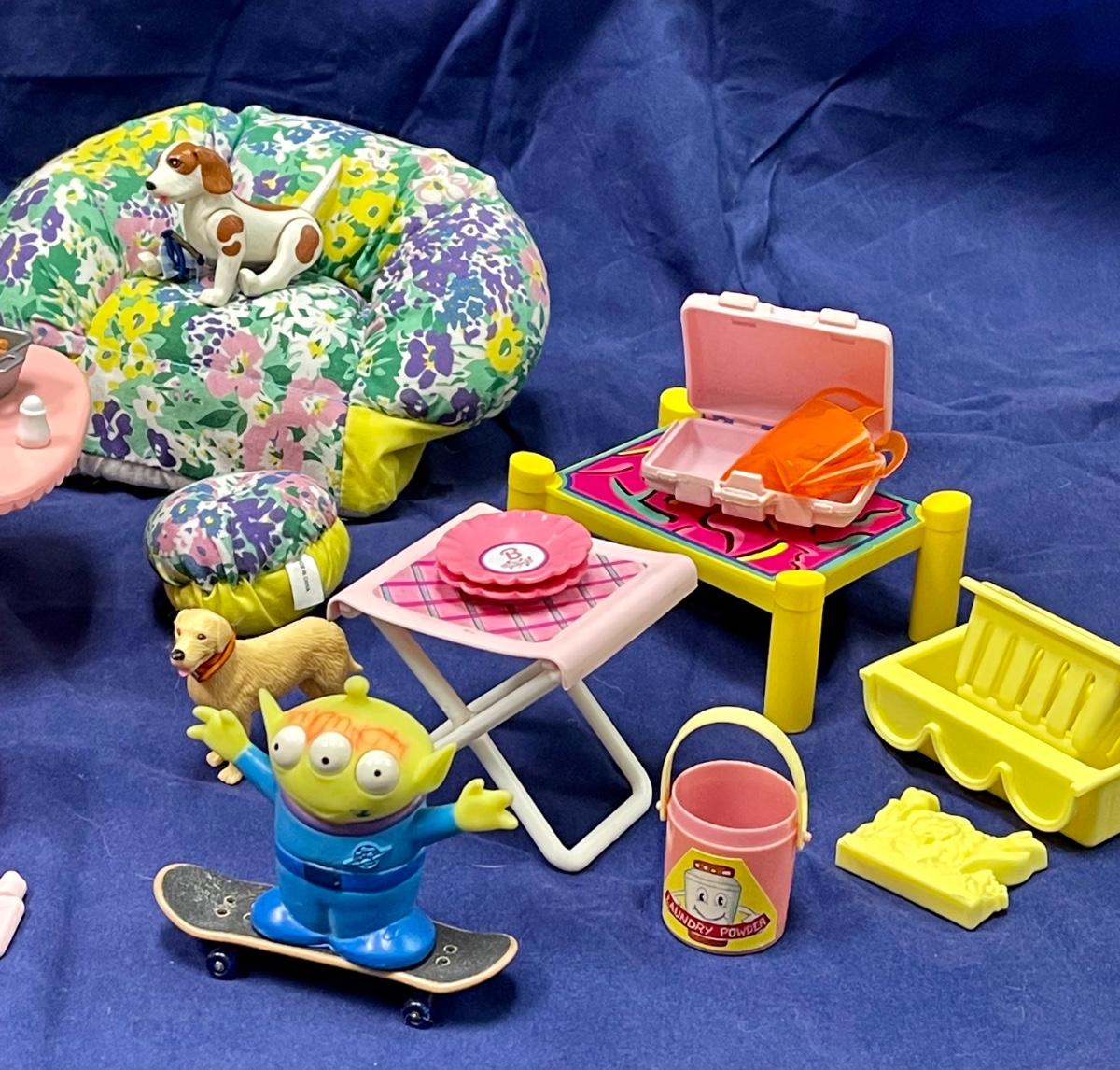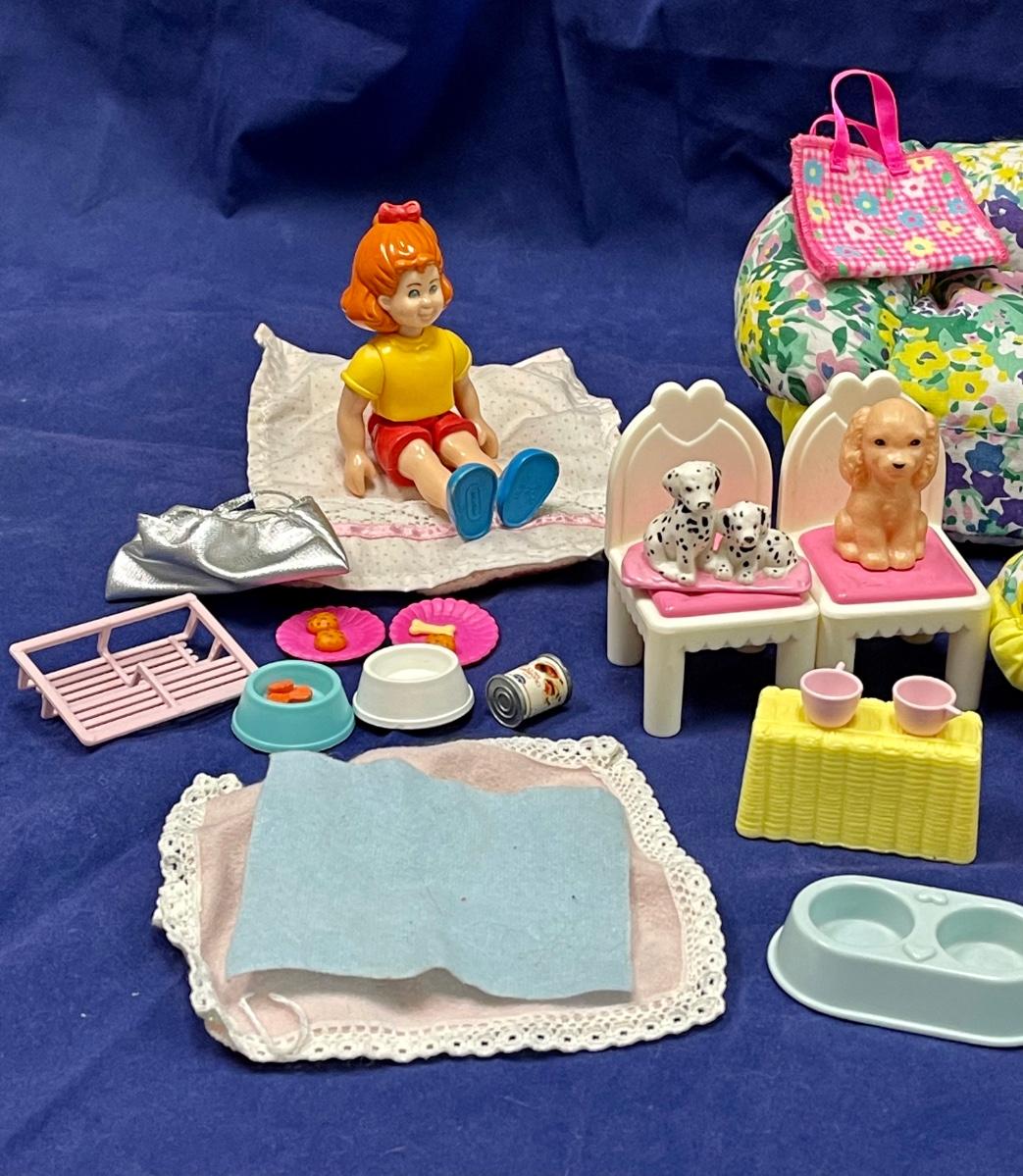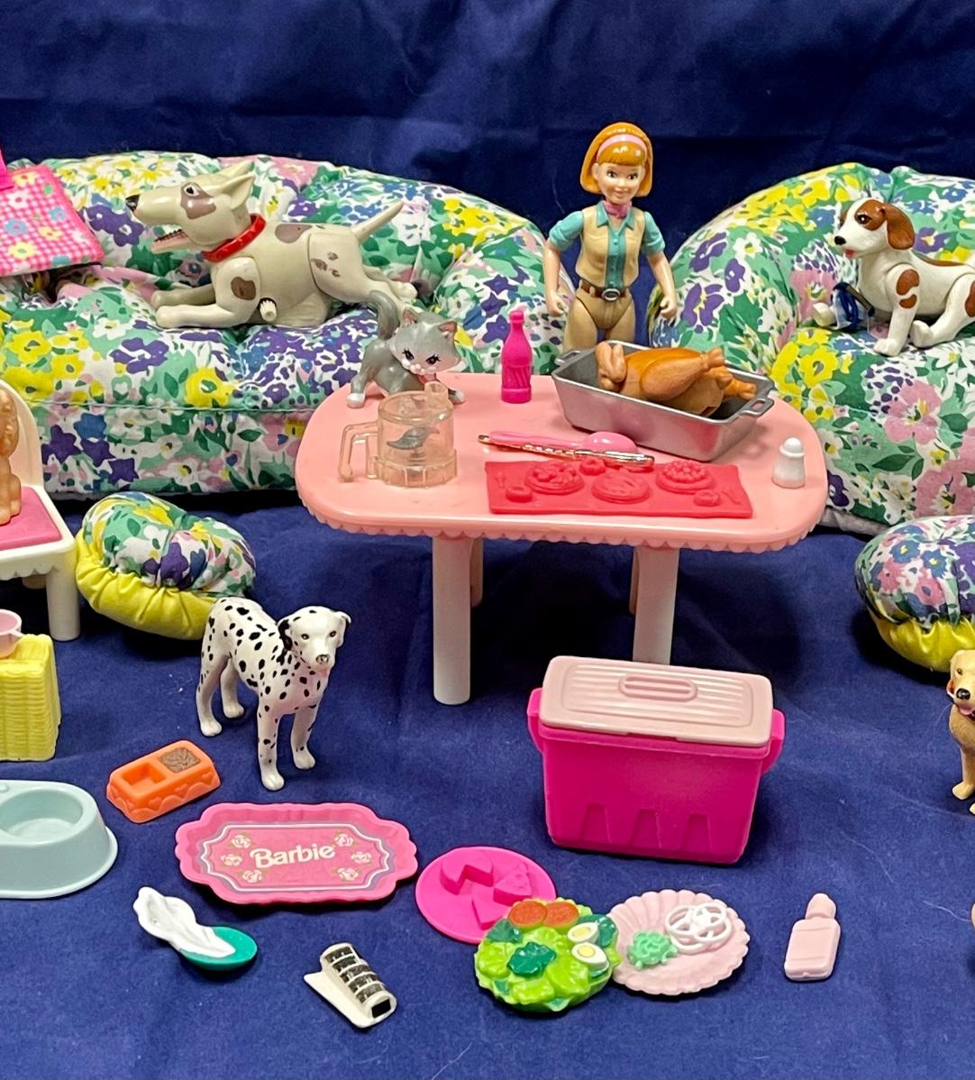 All in good used condition, but some pieces might need a quick wipe down. This is a mix of miniature pretend play items from the early 90's I believe. It includes furniture, picnic supplies, characters, dogs, pet accessories, Turkey Dinner accessories, etc.