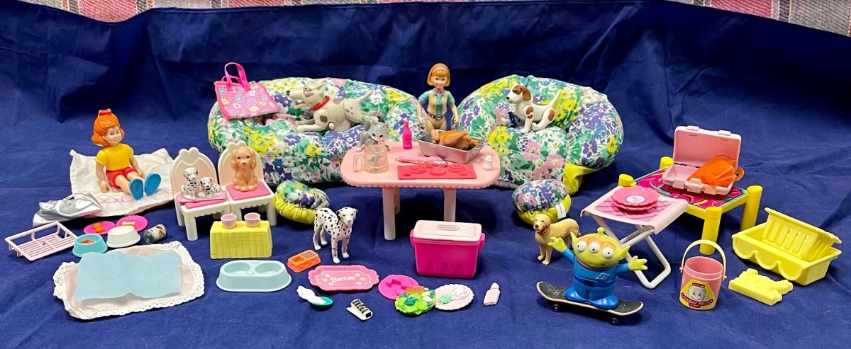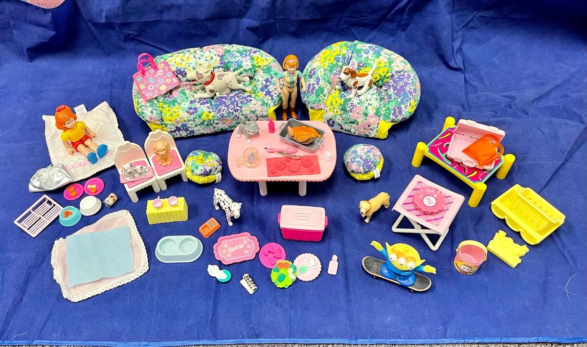 Vintage Toy Lot Playhouse Doll House Miniature Barbie and other playthings approx 70 pieces
