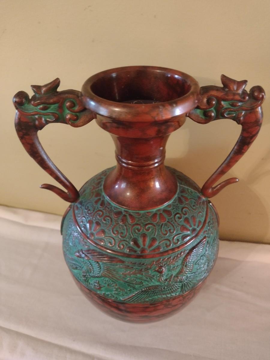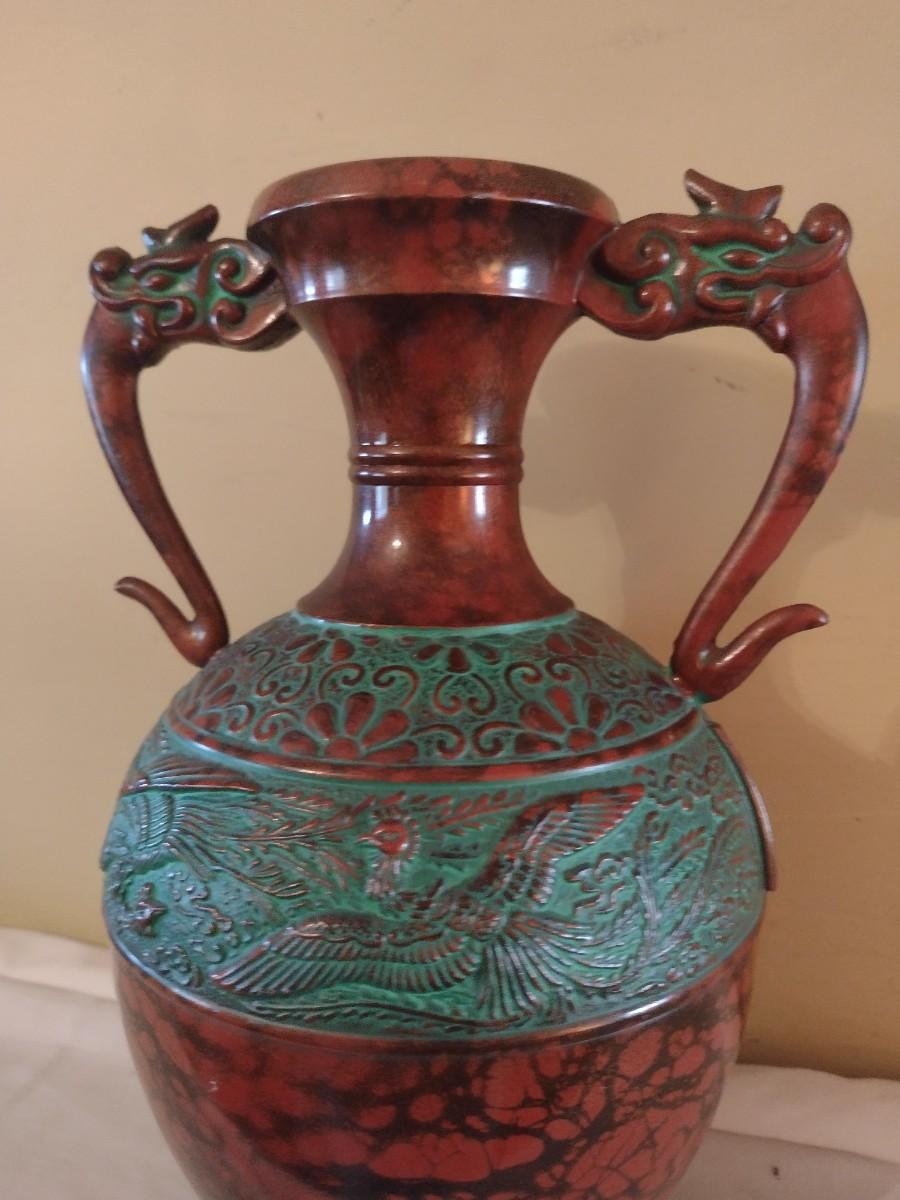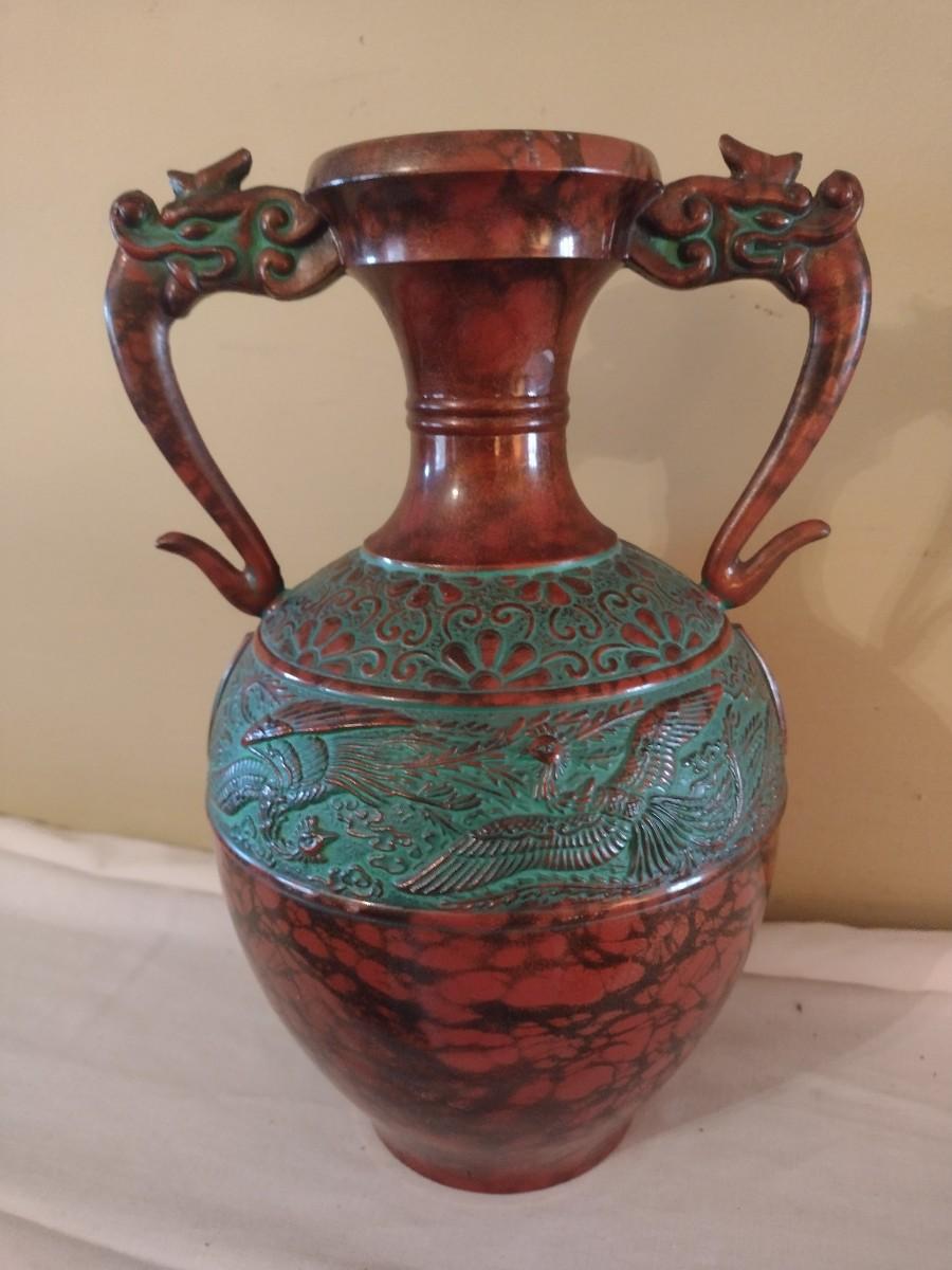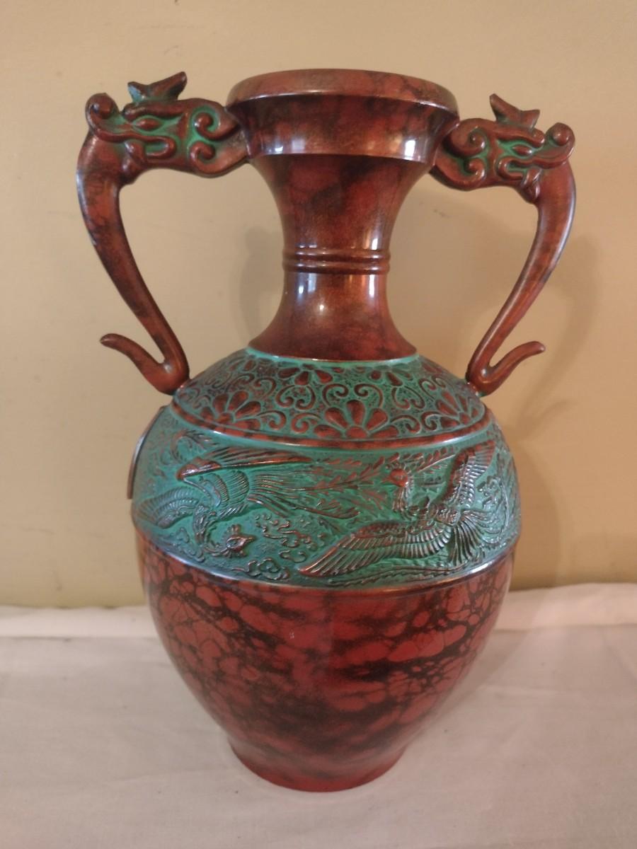 Vintage Toyo Japanese Bronze Finish Vase with Dragon Handles. Approx 10" tall, and 5½" in diameter.