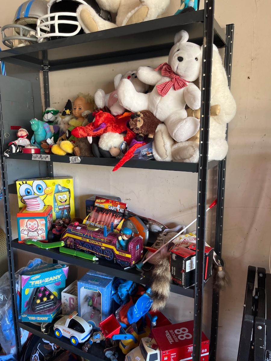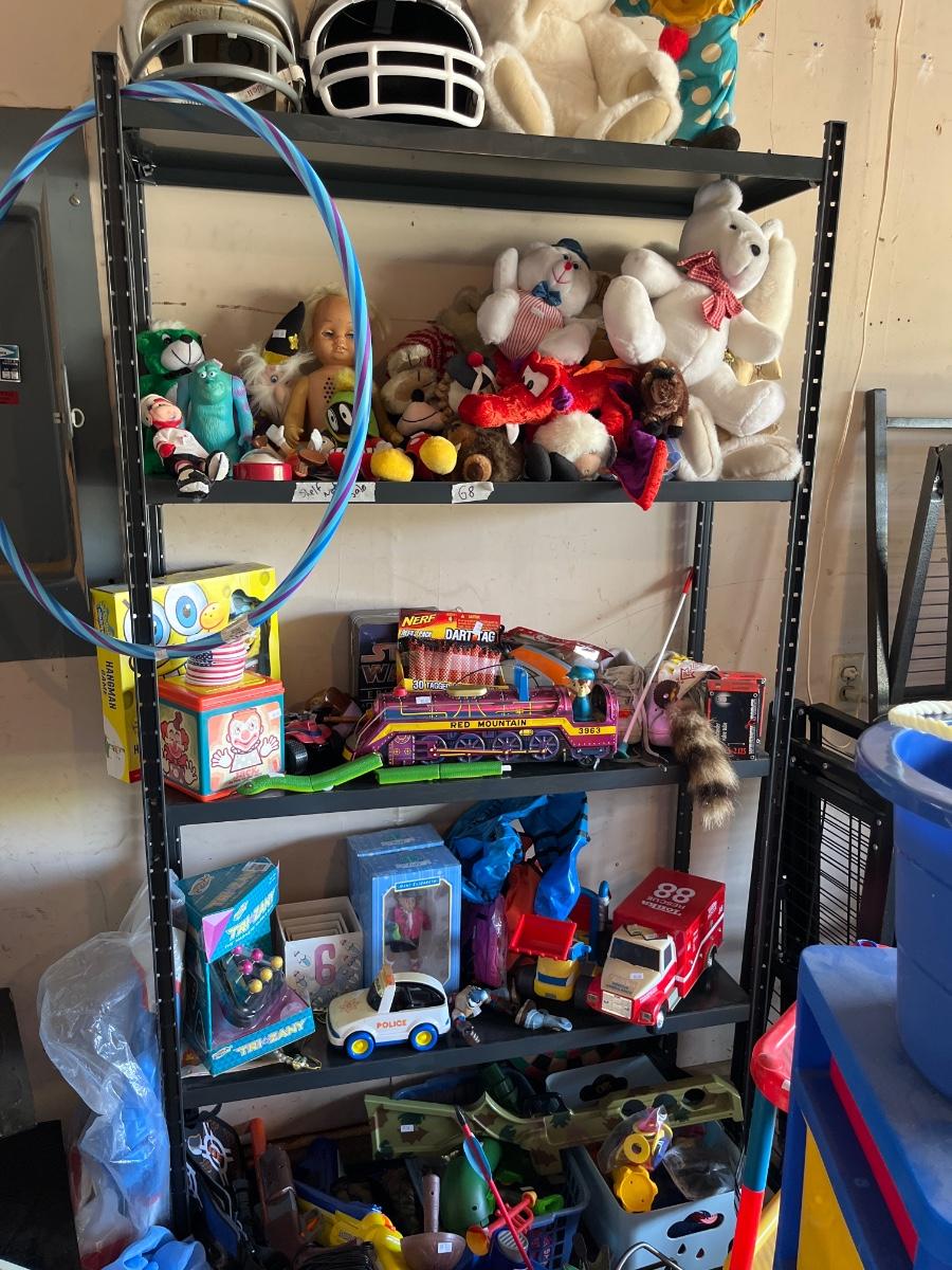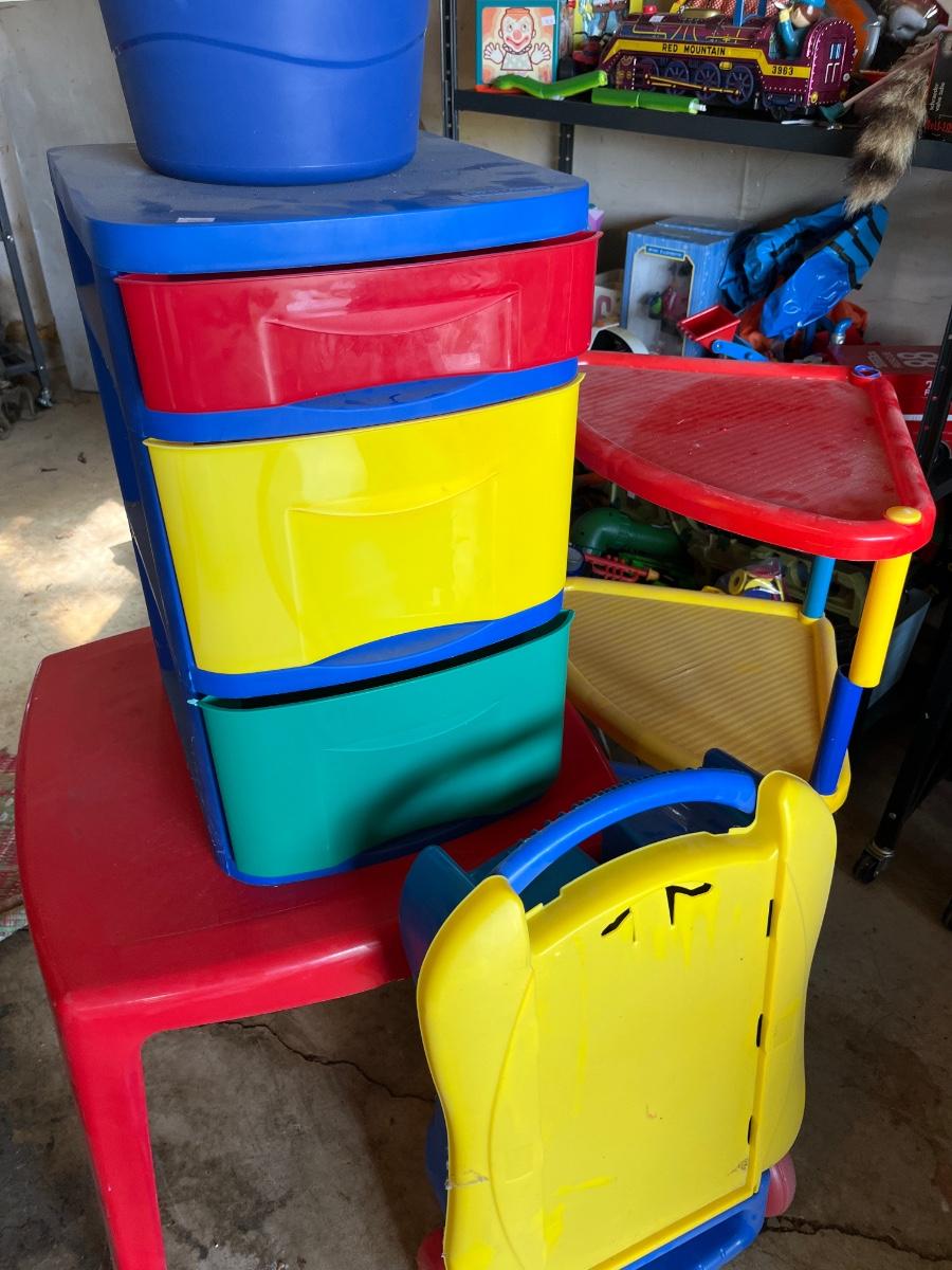 Toys, Stuffed animals, cars, plastic table and storage.