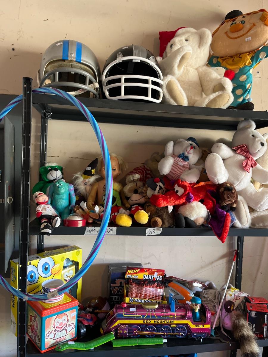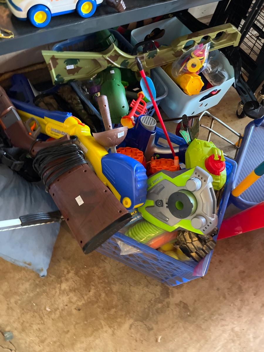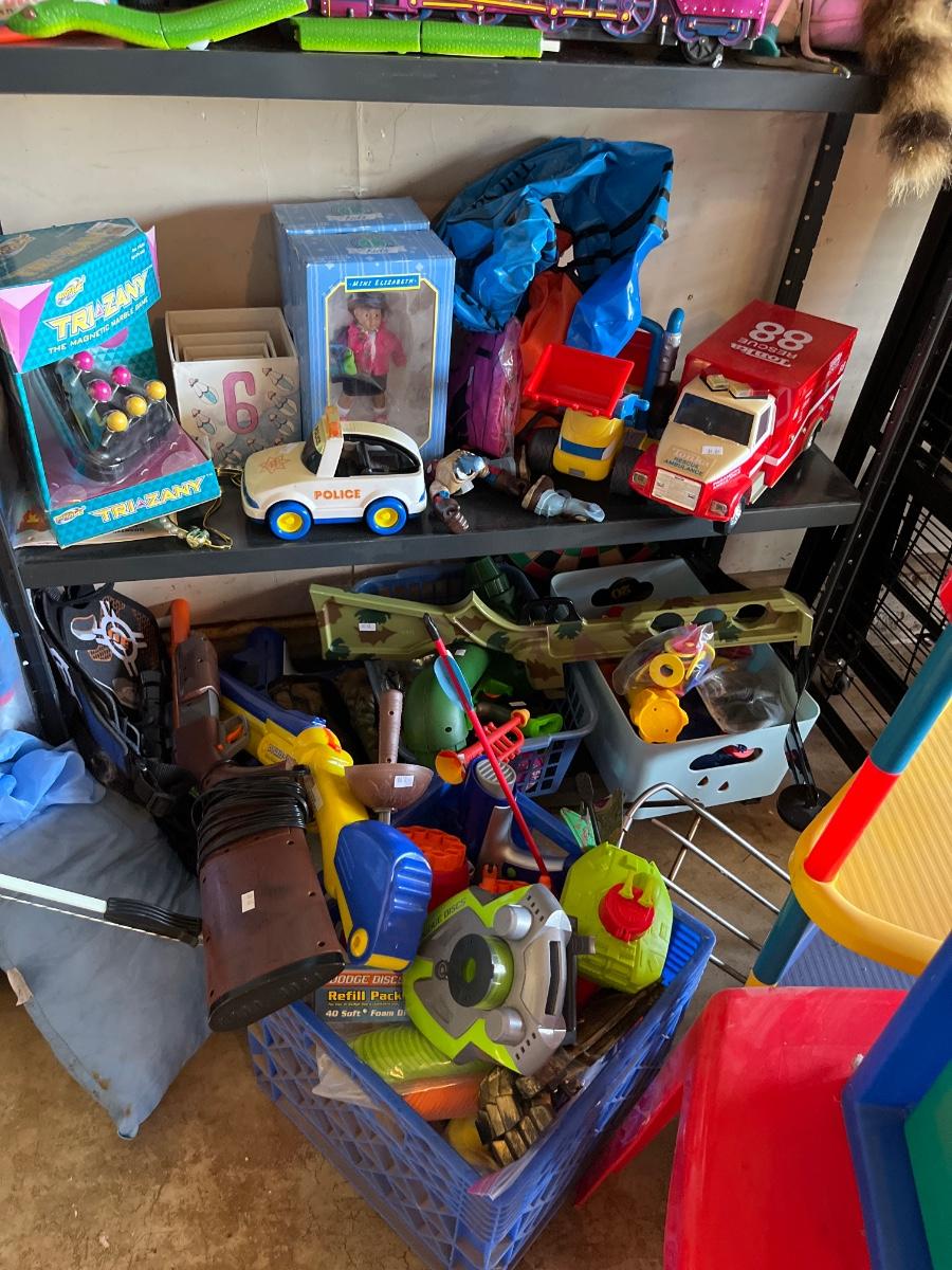 Toys, Stuffed animals, cars, plastic table and storage.