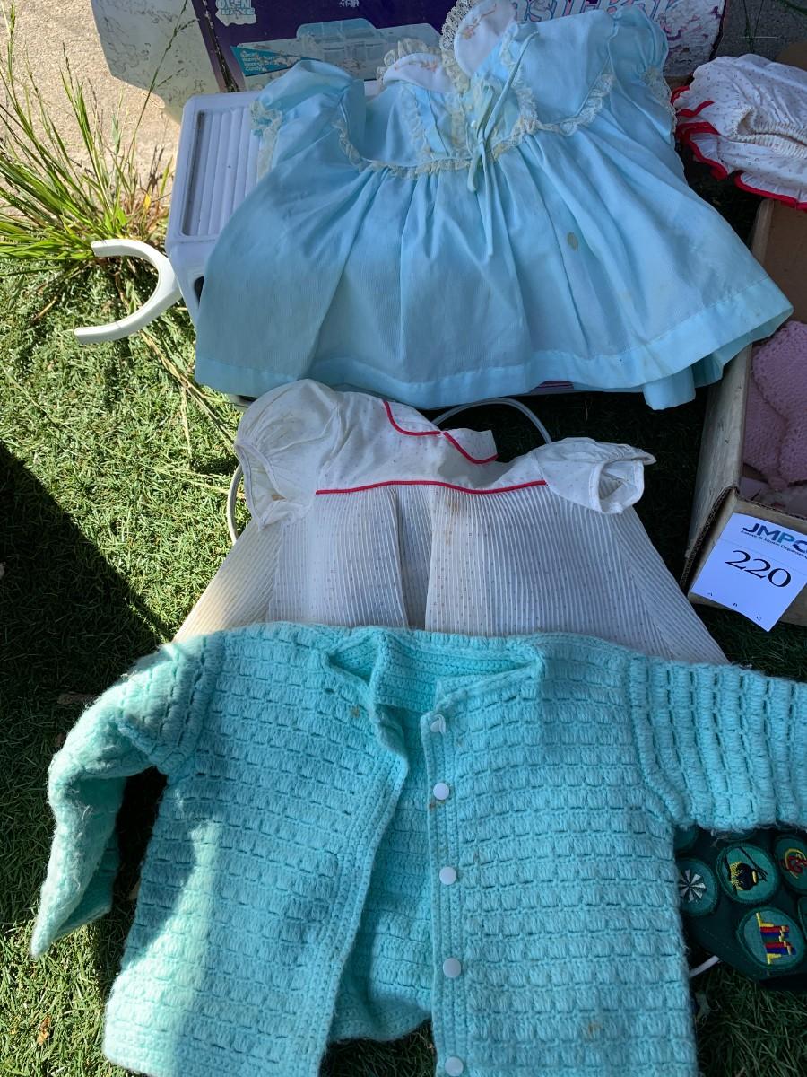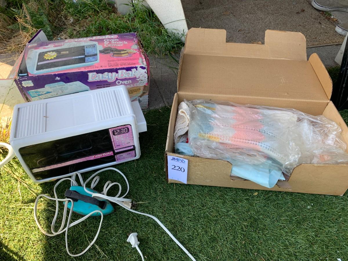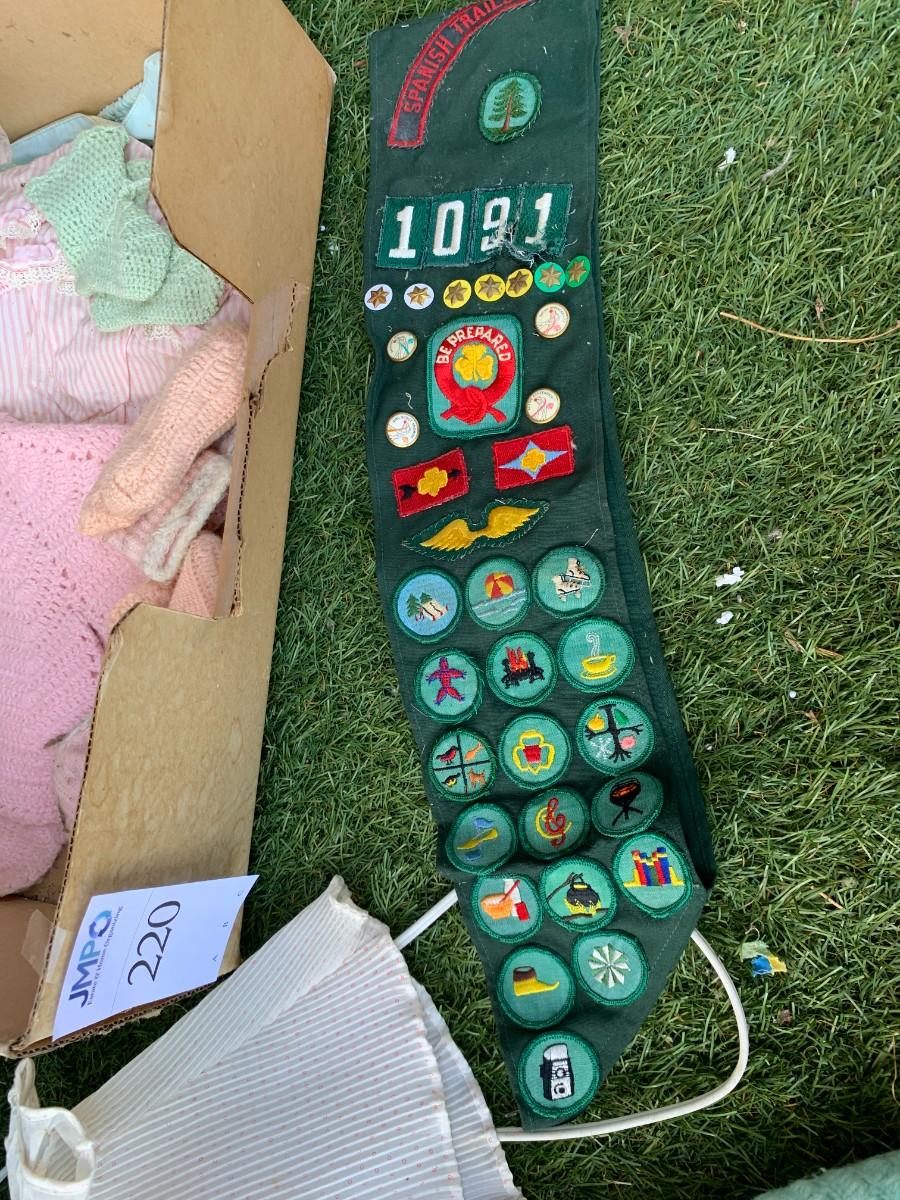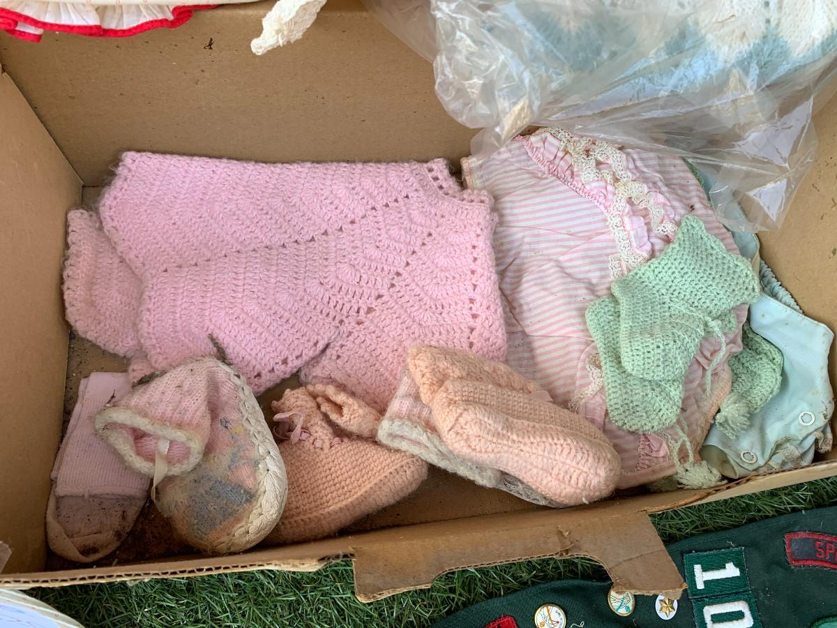 Box of vintage baby clothes, some stained. Vintage Girl Scout sash. Easy Bake oven (original box badly damaged). Play electric iron. None tested.