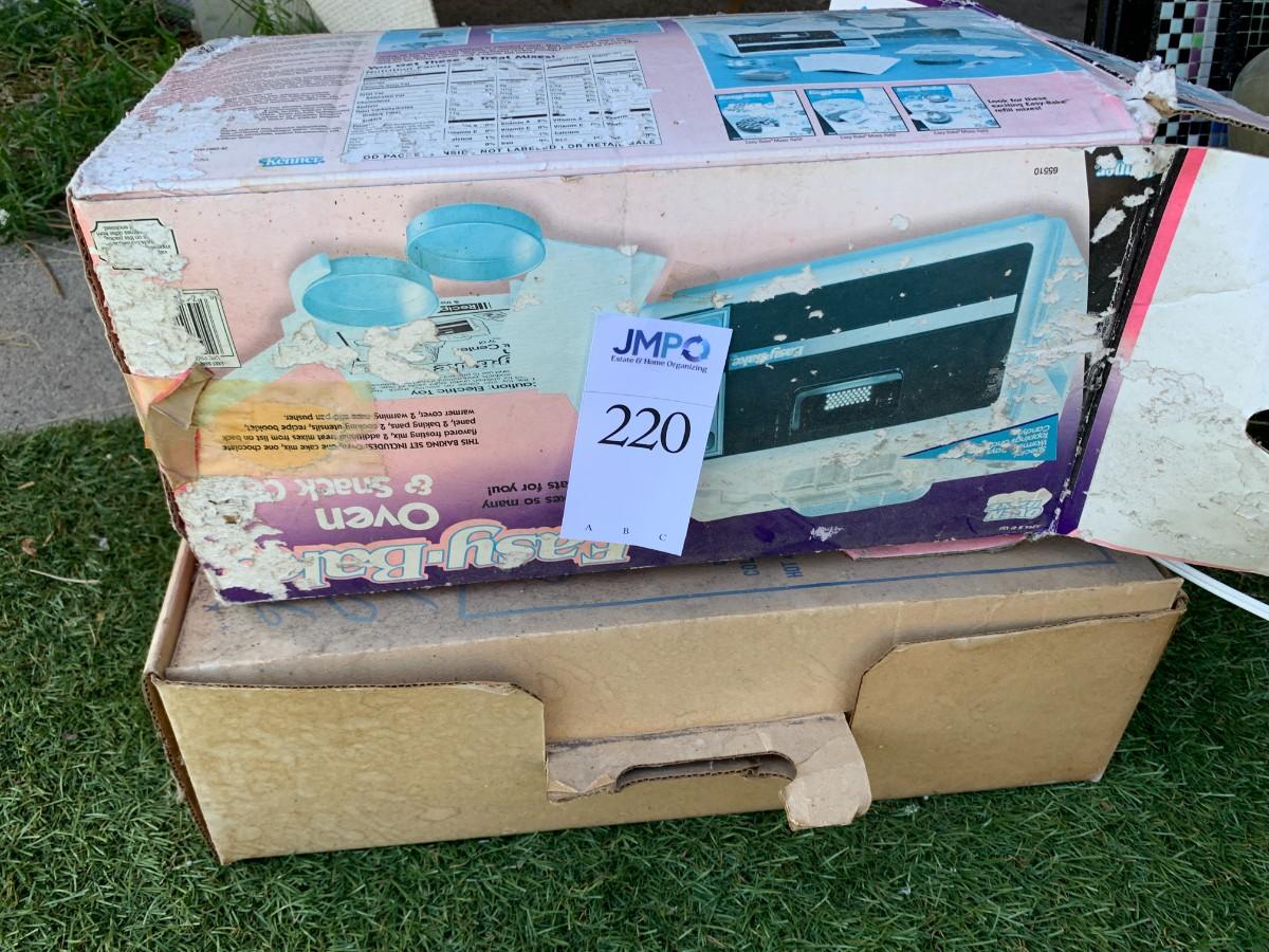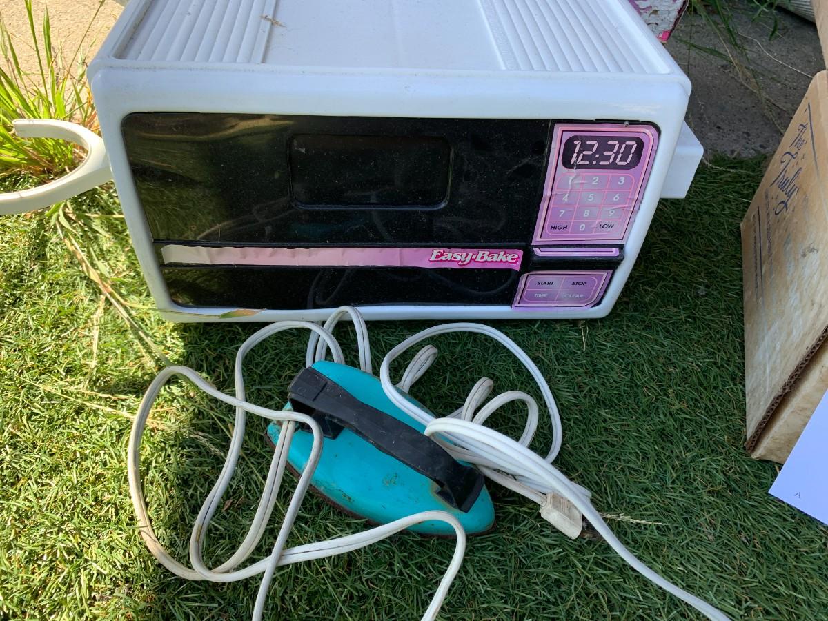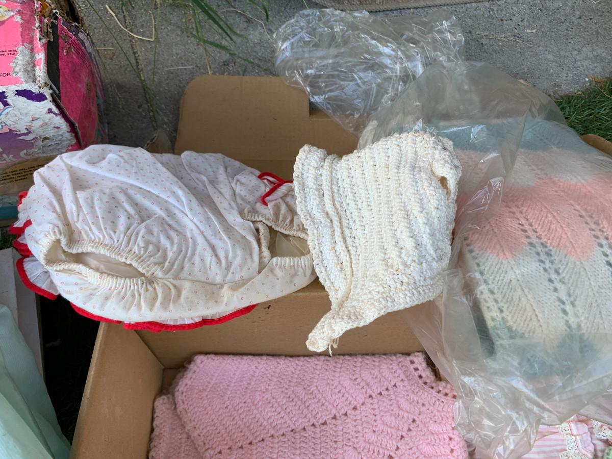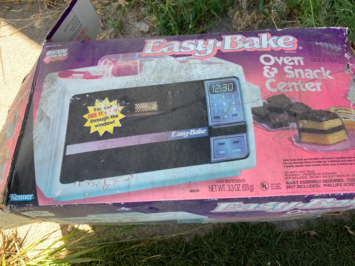 Box of vintage baby clothes, some stained. Vintage Girl Scout sash. Easy Bake oven (original box badly damaged). Play electric iron. None tested.