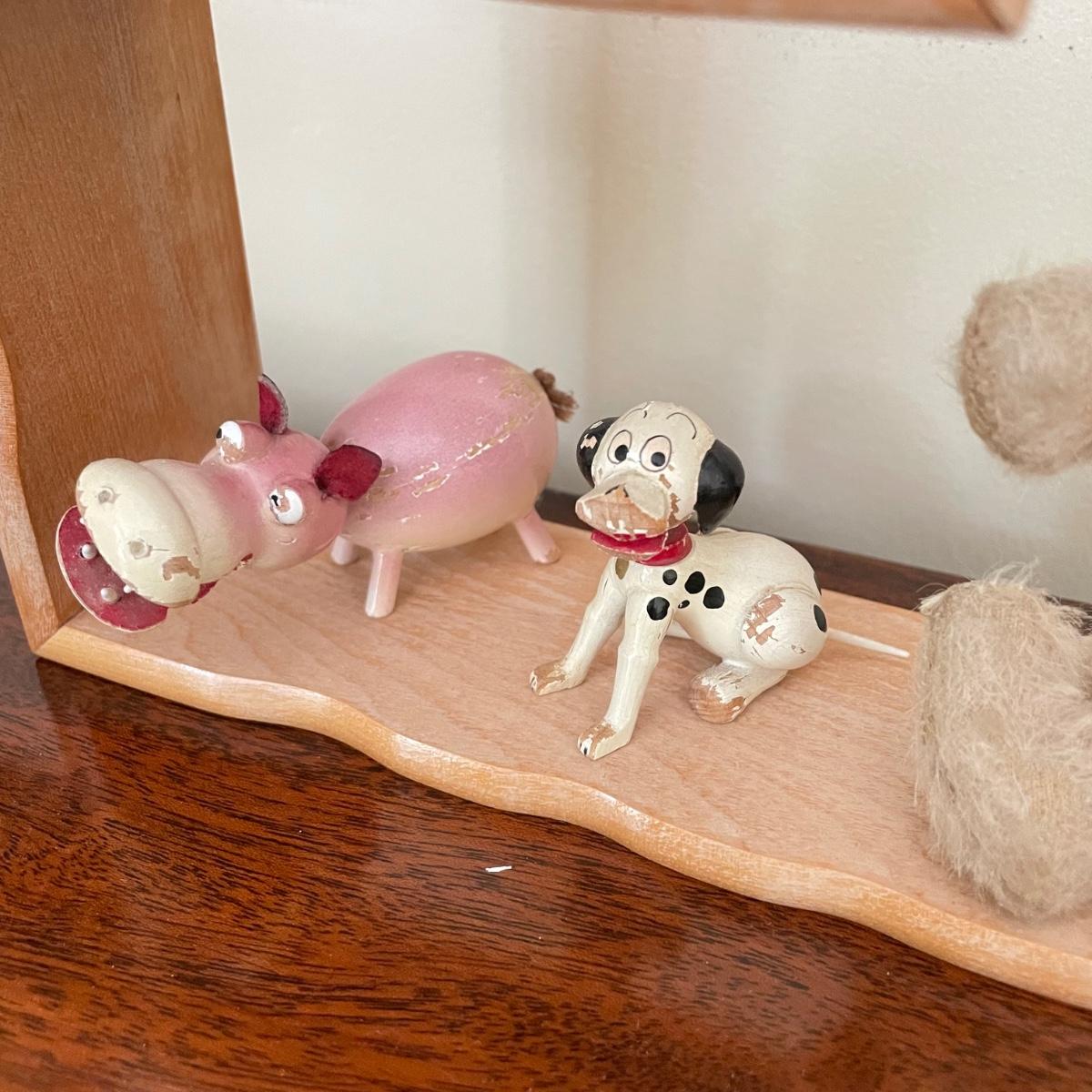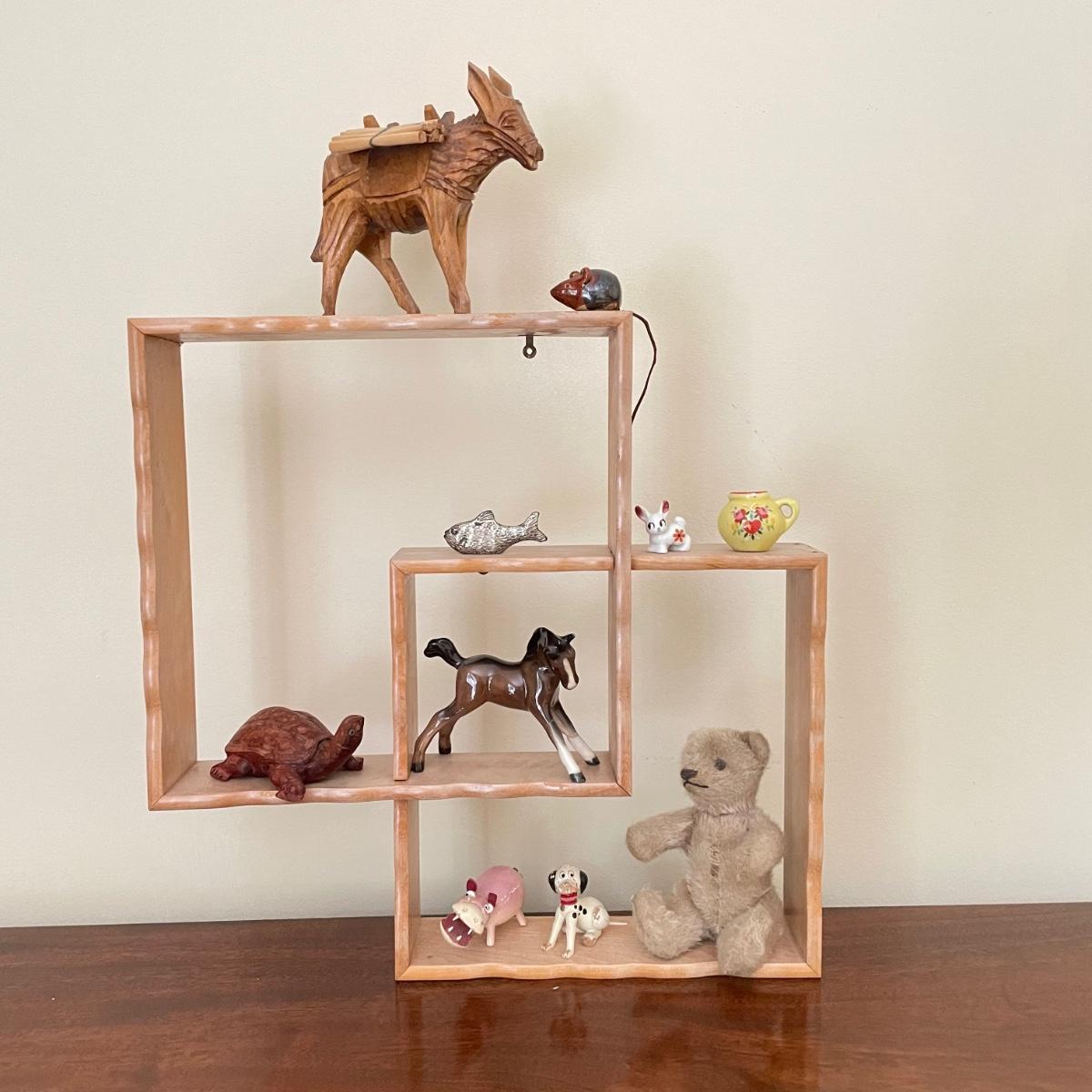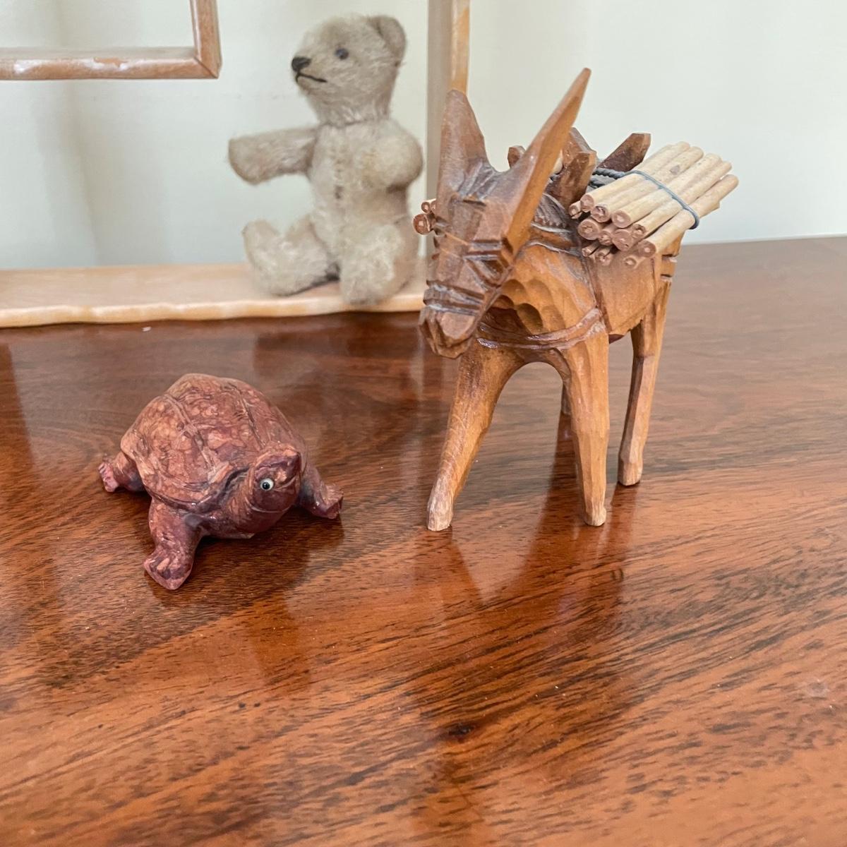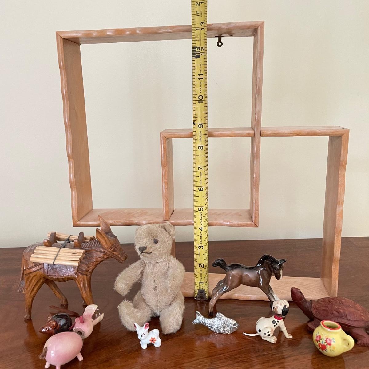 Two adorable vintage tiny bobble heads - the hippo and dog are made of wood, as well as the donkey and turtle. Lot includes a few ceramic pieces like the bunny, pot, English horse, and the mouse with a leather tail. Lot also includes a vintage stuffed bear with posable limbs and a metal fish that appears to be pewter. The horse has two front legs that have been repaired. The display shelf puzzles into itself and measures 13” x 13.5”. See images. Shipping available.