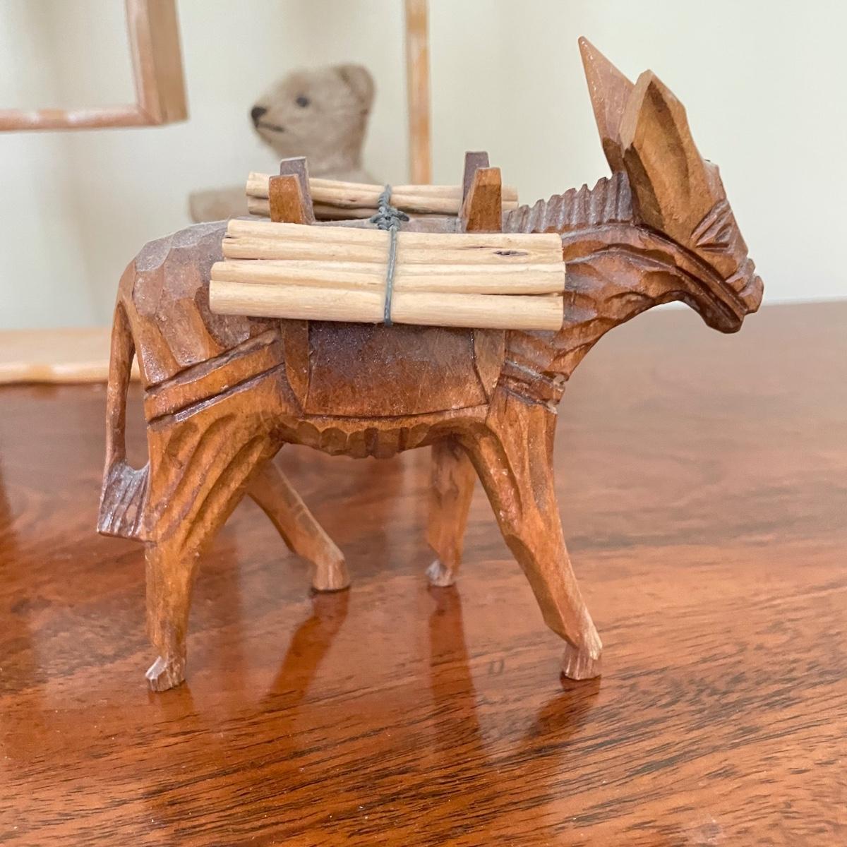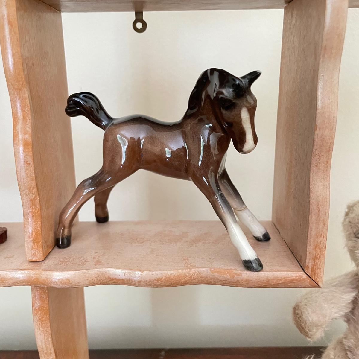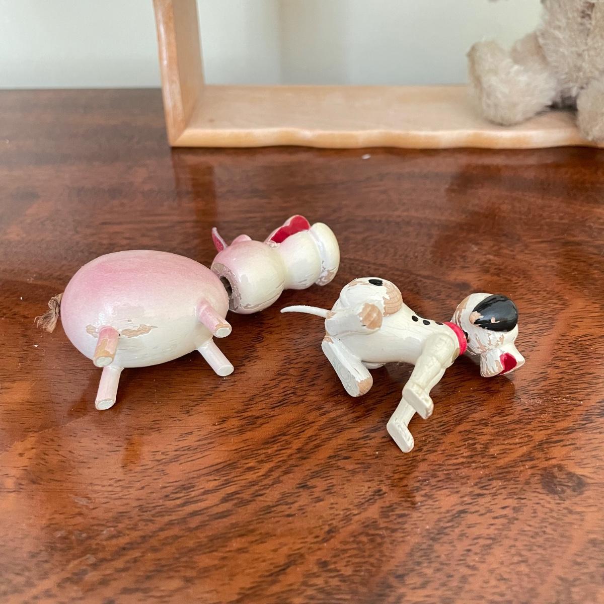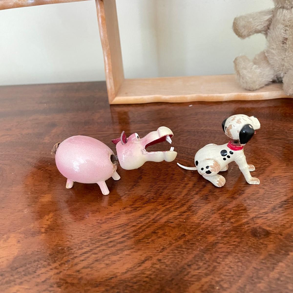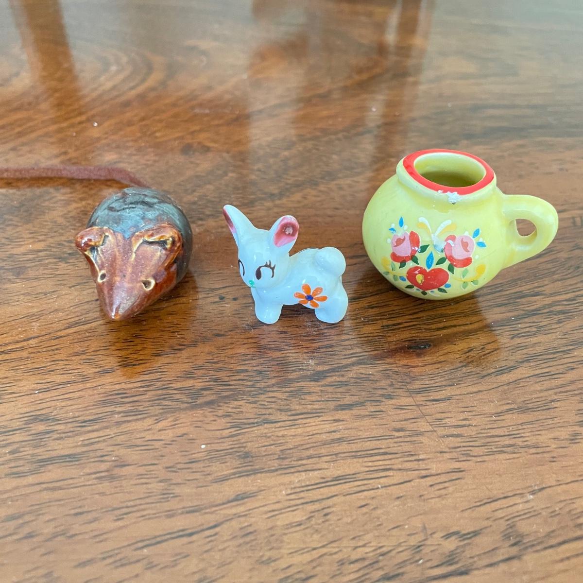 Two adorable vintage tiny bobble heads - the hippo and dog are made of wood, as well as the donkey and turtle. Lot includes a few ceramic pieces like the bunny, pot, English horse, and the mouse with a leather tail. Lot also includes a vintage stuffed bear with posable limbs and a metal fish that appears to be pewter. The horse has two front legs that have been repaired. The display shelf puzzles into itself and measures 13” x 13.5”. See images. Shipping available.