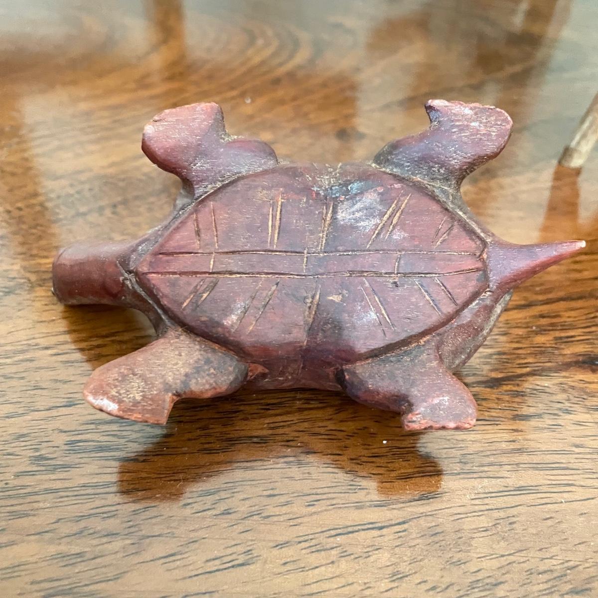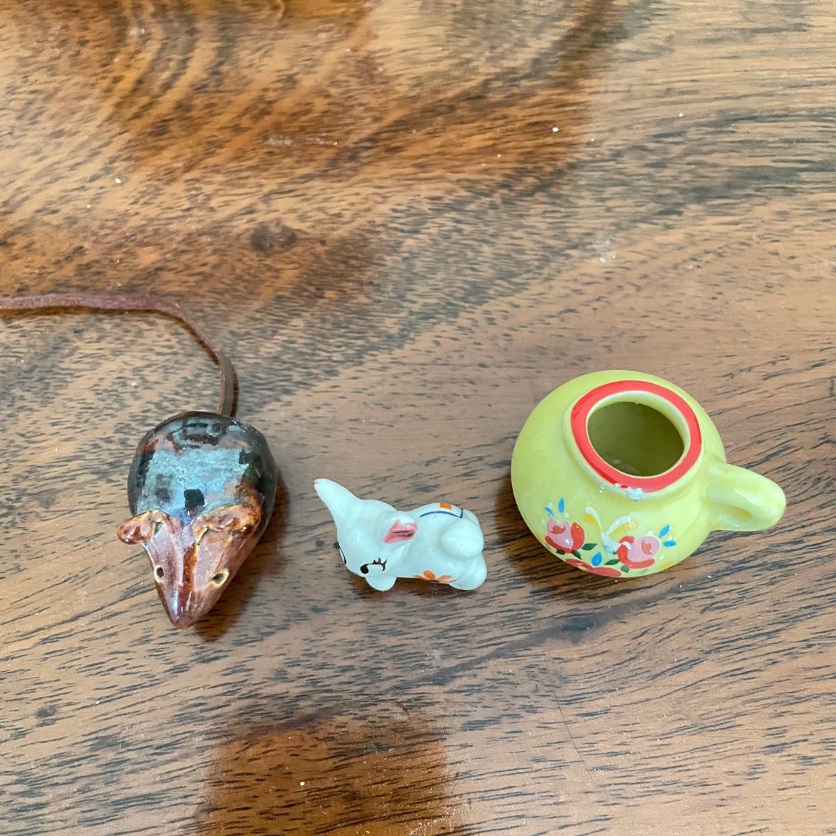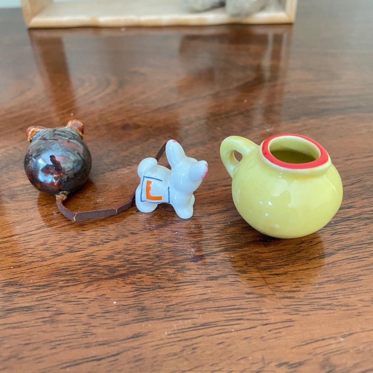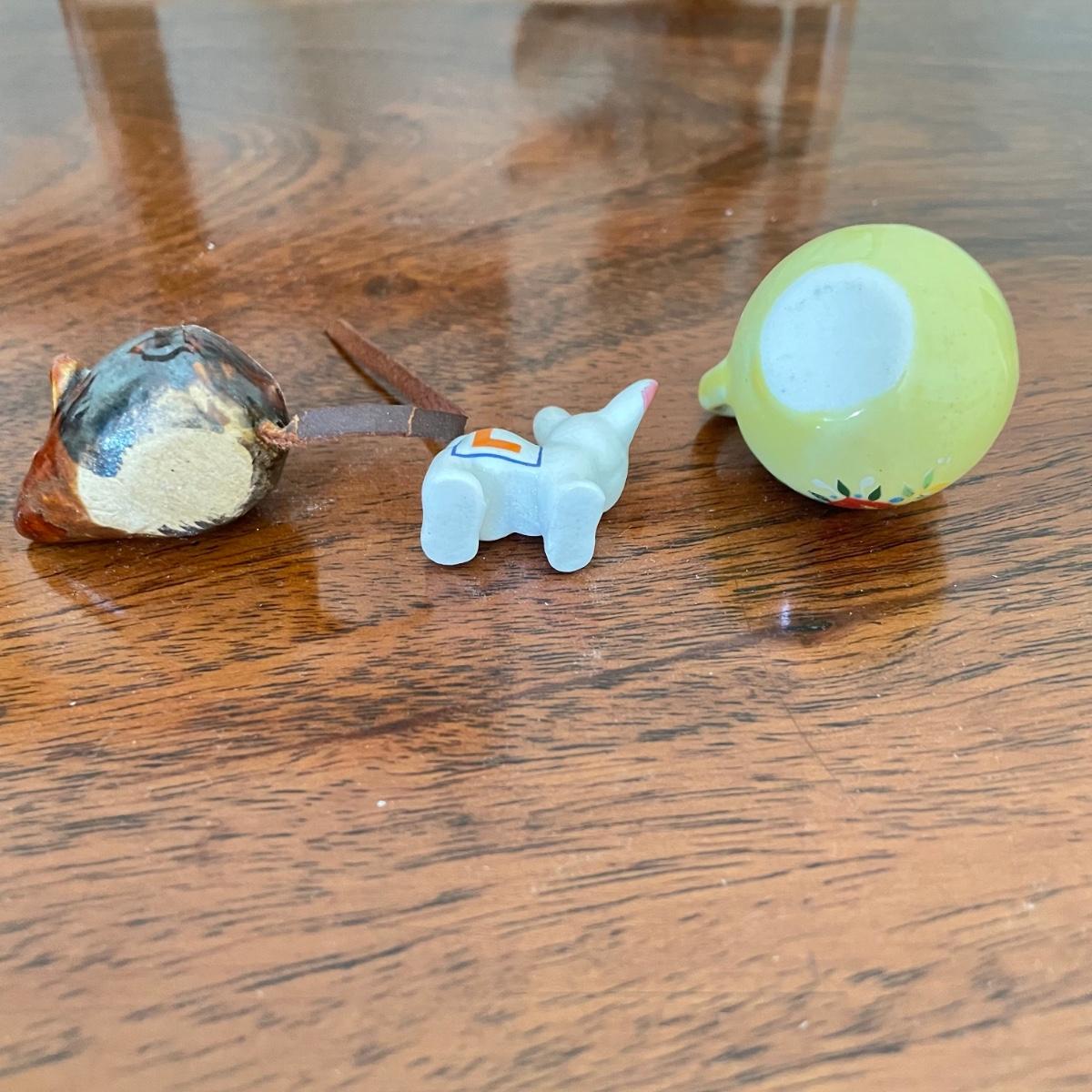 Two adorable vintage tiny bobble heads - the hippo and dog are made of wood, as well as the donkey and turtle. Lot includes a few ceramic pieces like the bunny, pot, English horse, and the mouse with a leather tail. Lot also includes a vintage stuffed bear with posable limbs and a metal fish that appears to be pewter. The horse has two front legs that have been repaired. The display shelf puzzles into itself and measures 13” x 13.5”. See images. Shipping available.