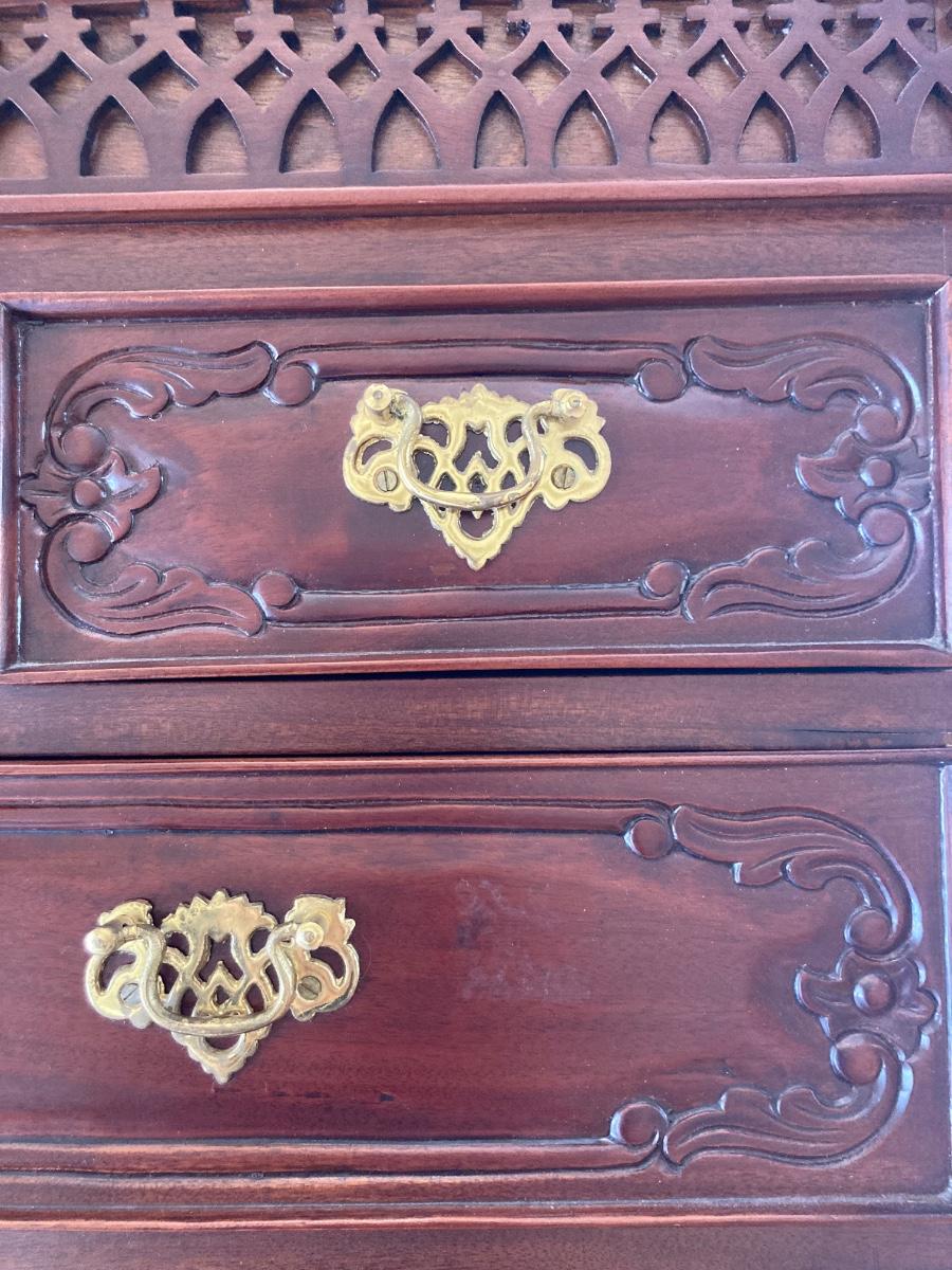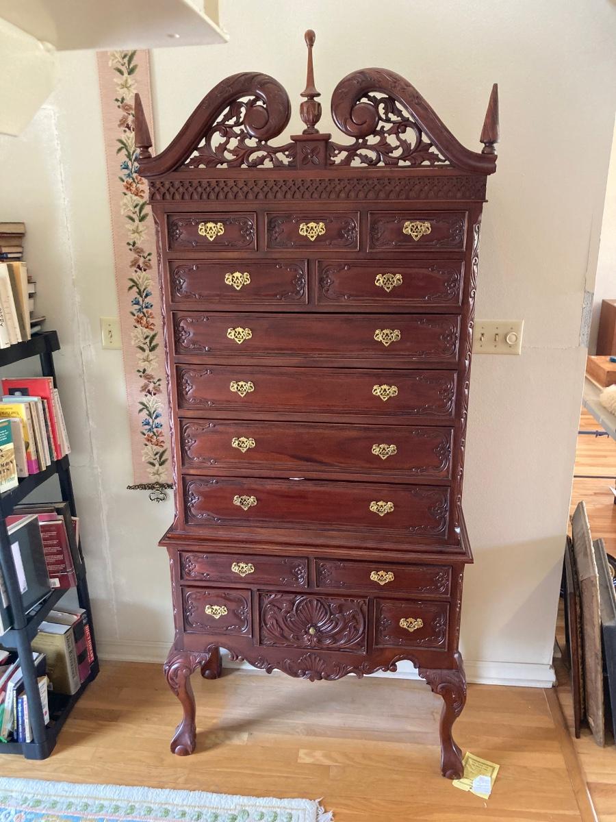 Vintage traditional style highboy chest on chest - #M-100. All wood dovetail drawers. Two of the legs have damage that has been repaired, otherwise, in very good condition. 37w X 16d X 85h