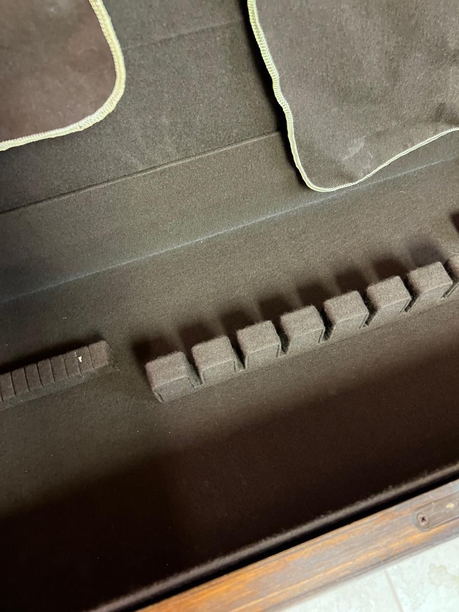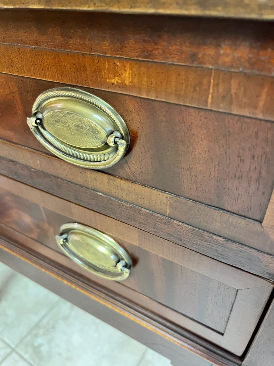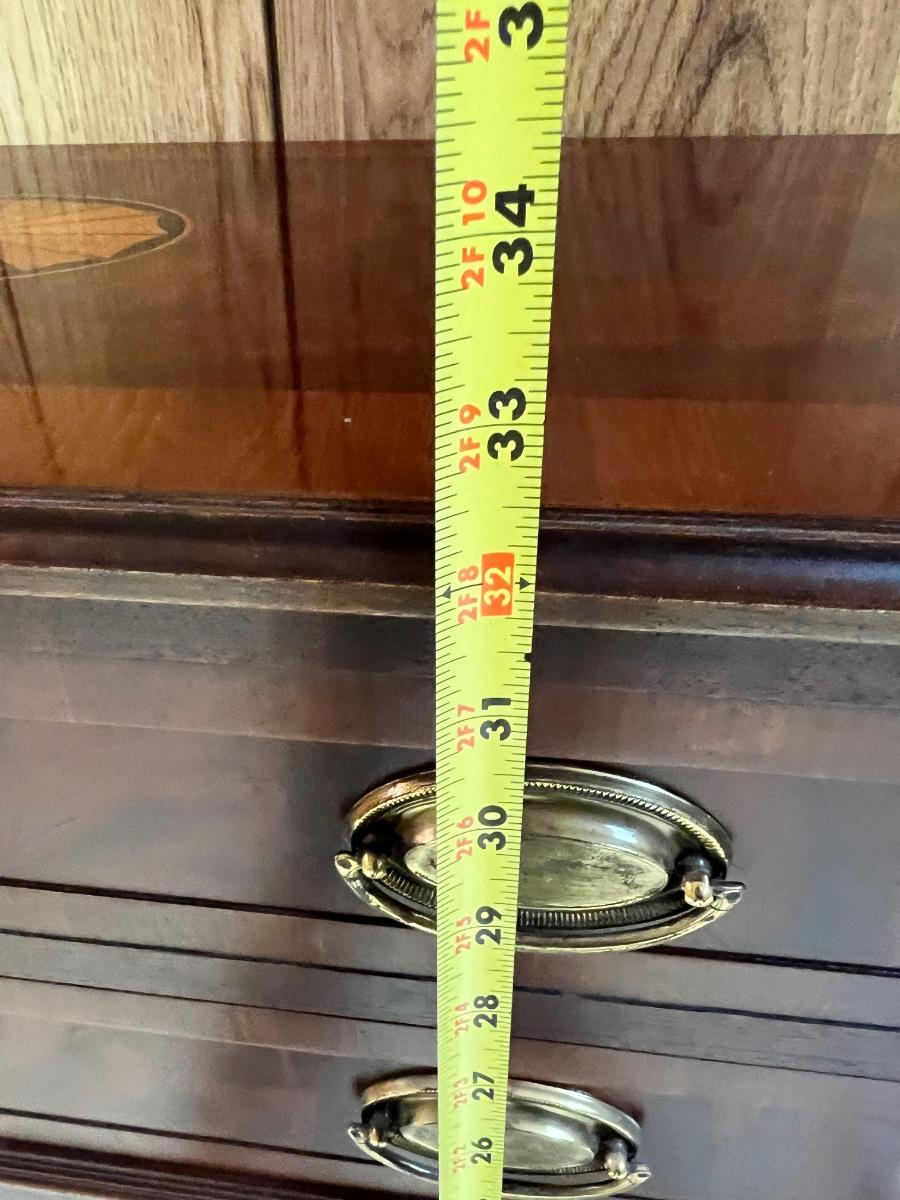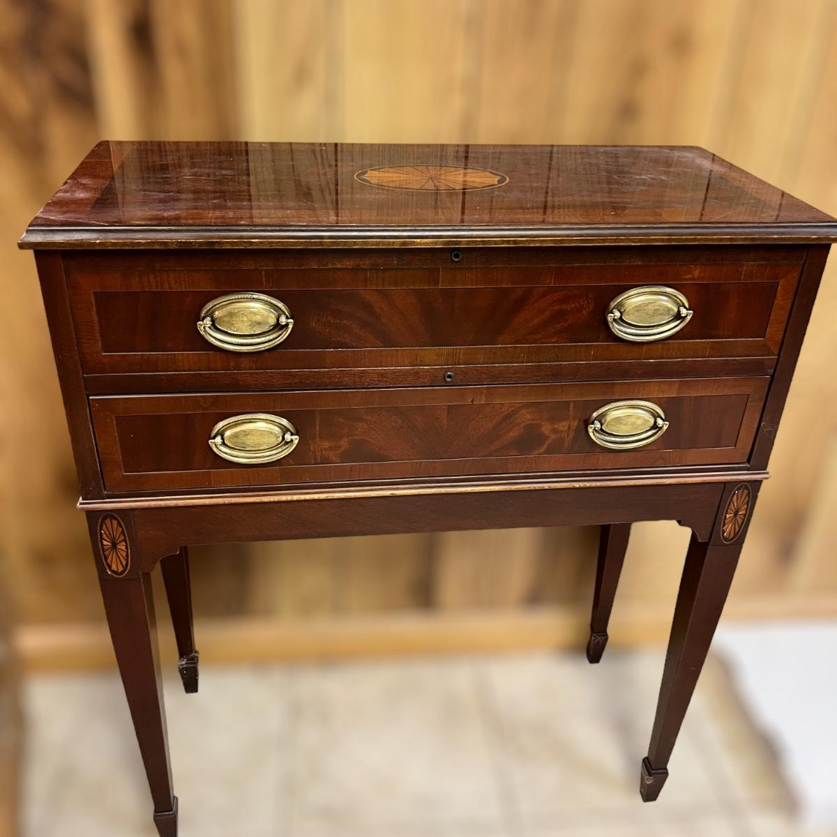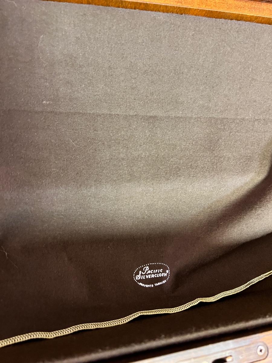 Hekman wood inlaid silver chest. Top opens to sectioned utensils storage lines with Pacific Silver cloth to prevent tarnishing. Plus one front drawer. Comes with working key. We have an identical one up for auction as well auction #346. NOTE: PICK UP ONLY IN DUNKIRK MD.