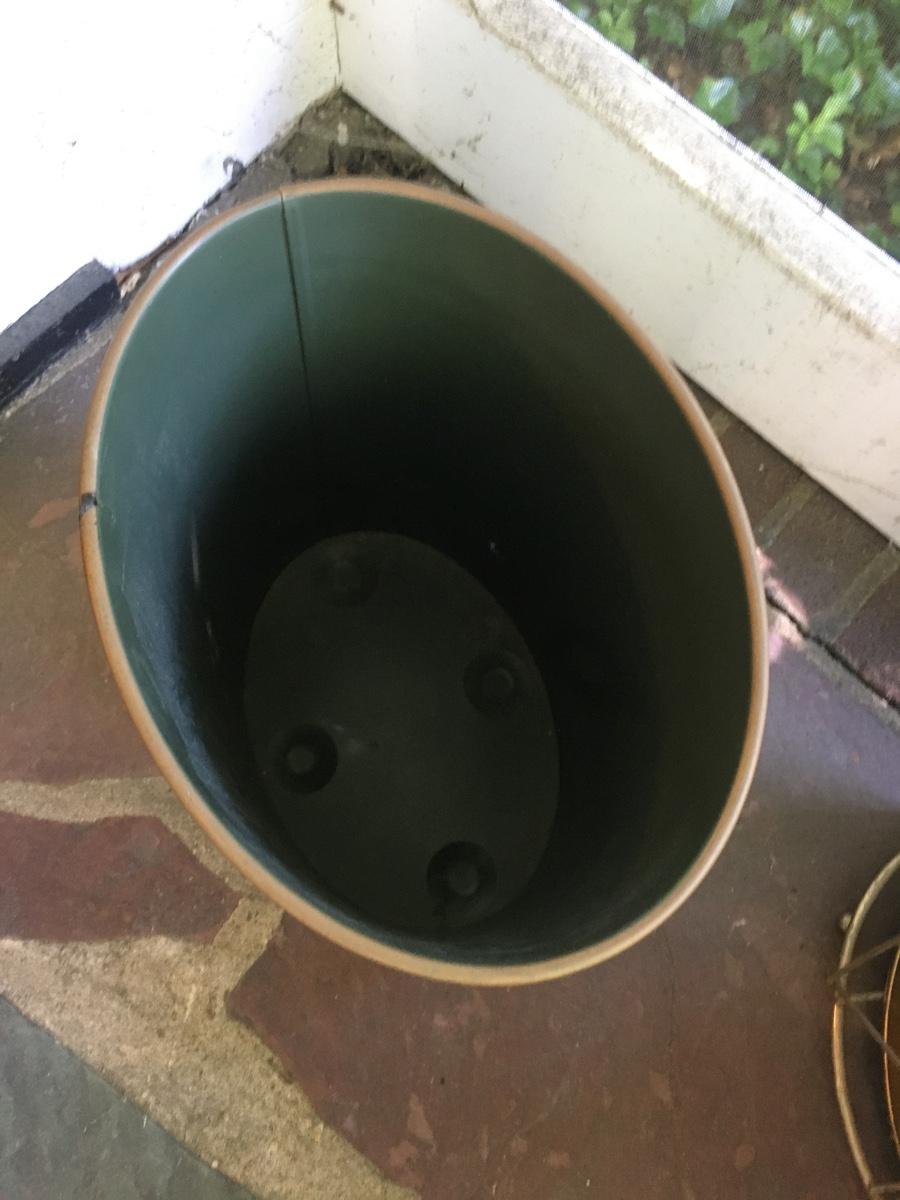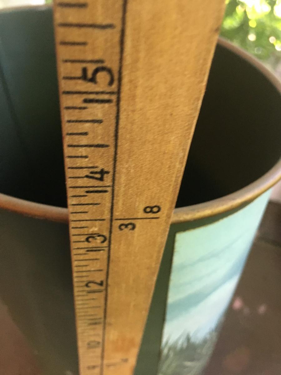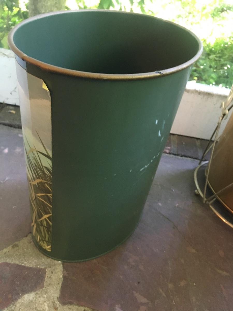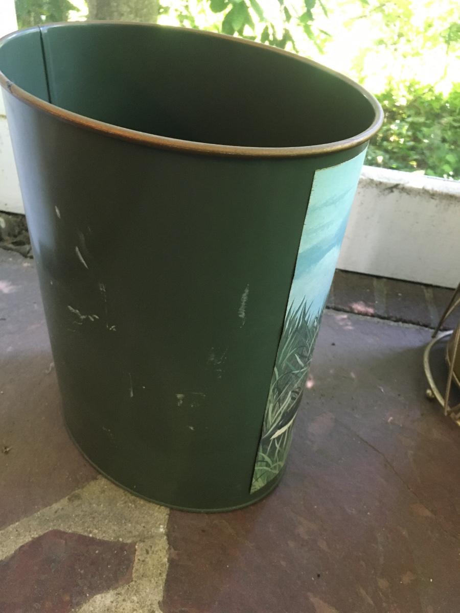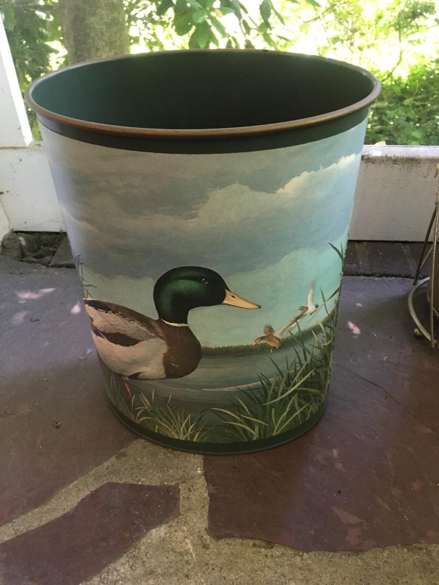 Vintage metal trashcan. Has mallard design affixed. Peeling slightly in one corner. For the duck lover in our life.