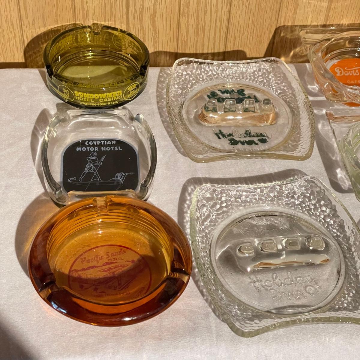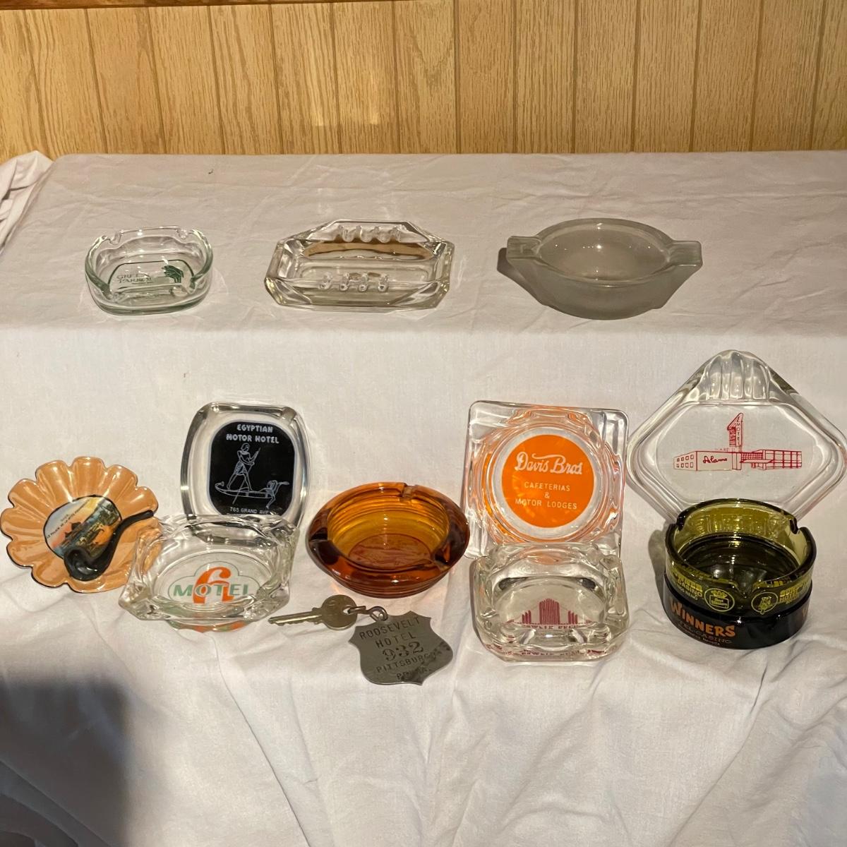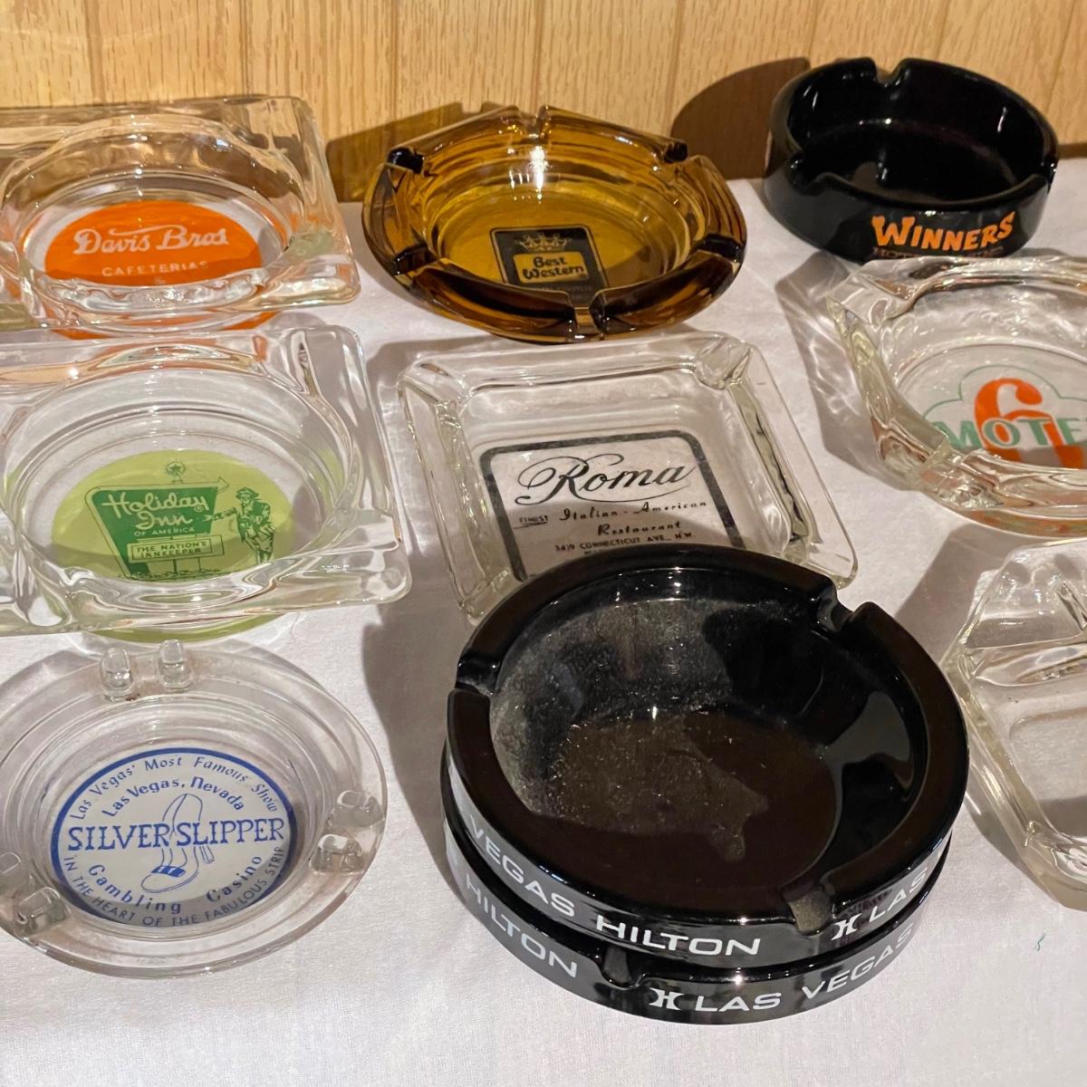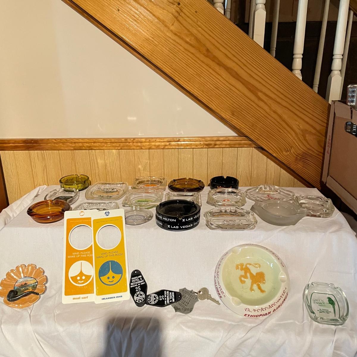 Over twenty vintage ashtrays advertising casinos, lodging and travel. Lot also holds two plastic hotel door hangers and old Roosevelt hotel metal key. The largest ashtray is handmade in Greece for Ethiopian Airlines, it’s almost 7”d. The Glass slipper is the smallest ashtray at 3.75”d. See images. Shipping available.