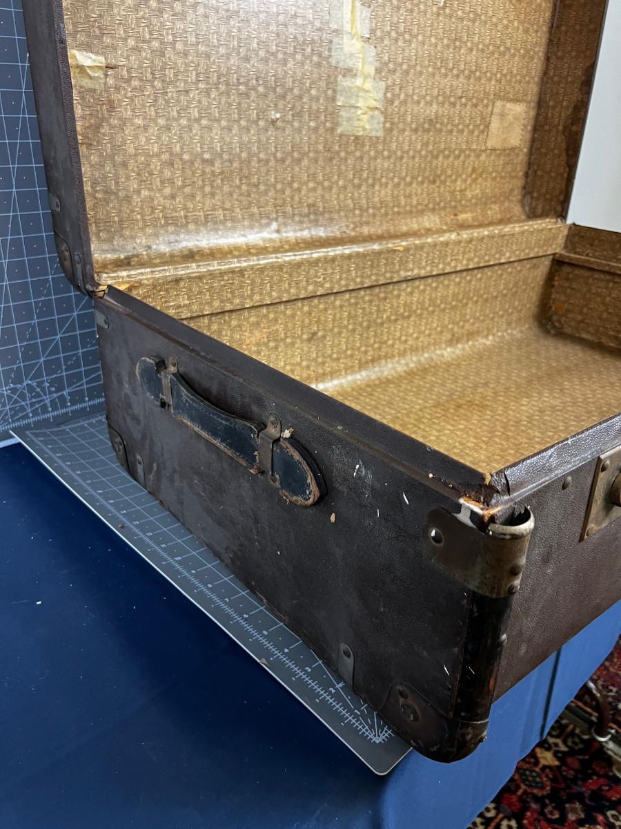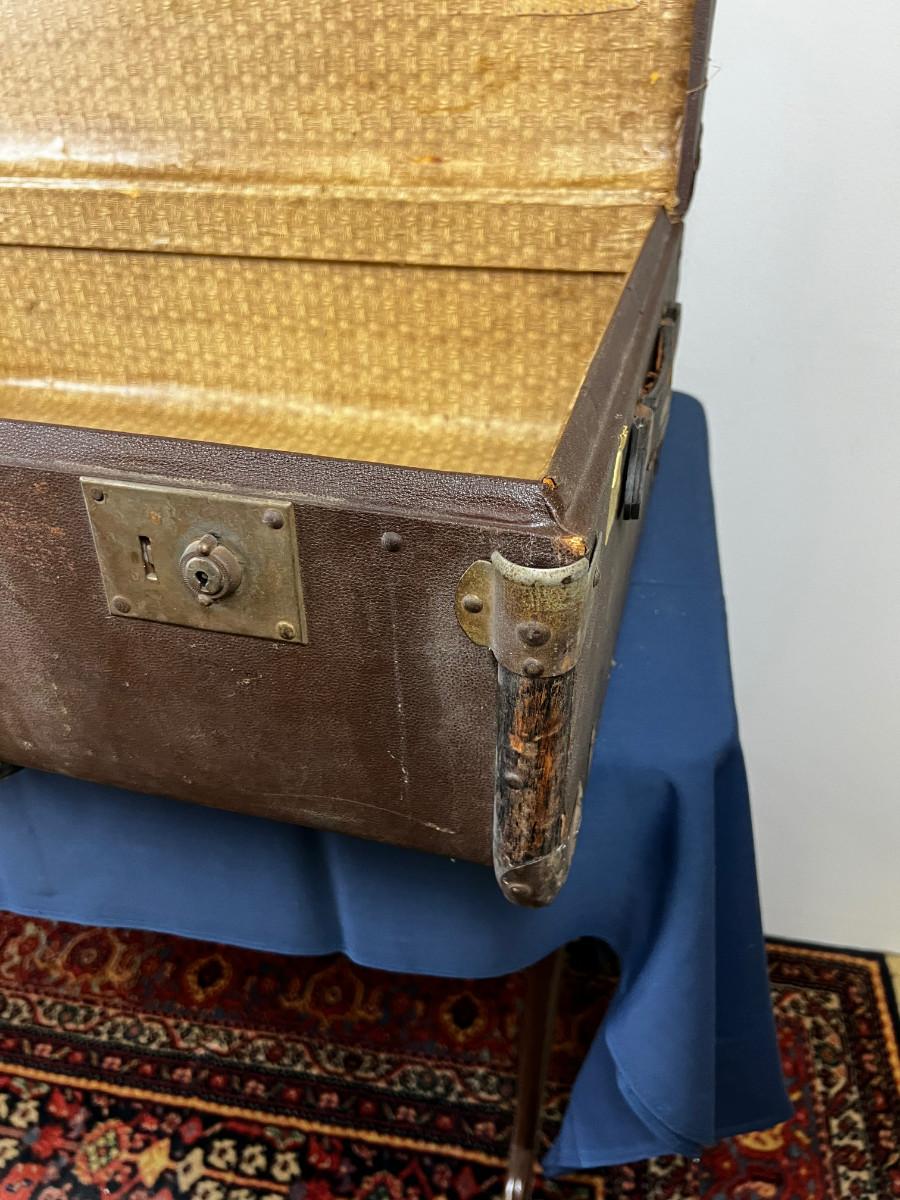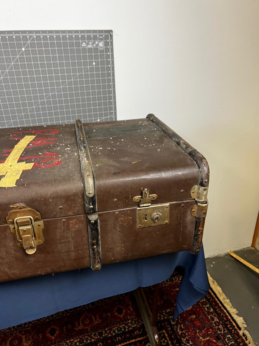 Used Good Condition! Looks similar to Louis Vuitton. Leather with Wood and Metal Trim. It would be an Awesome Coffee Table project. 36" X 21" X 13"