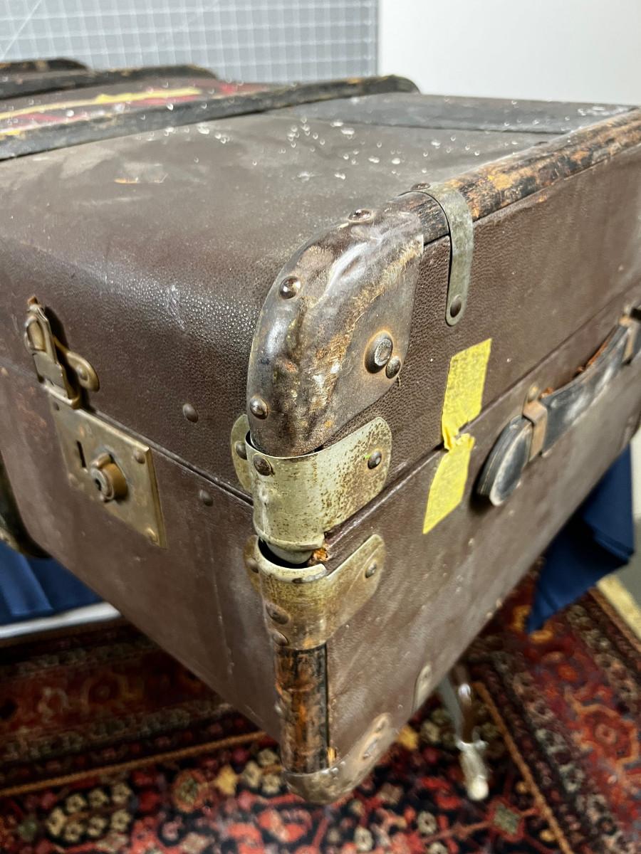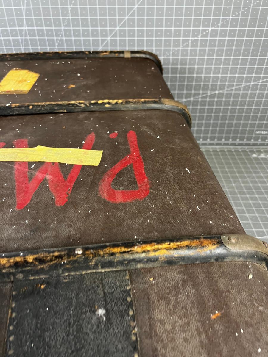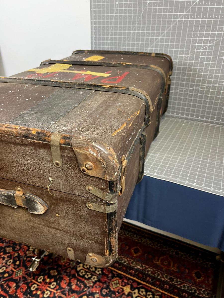Used Good Condition! Looks similar to Louis Vuitton. Leather with Wood and Metal Trim. It would be an Awesome Coffee Table project. 36" X 21" X 13"