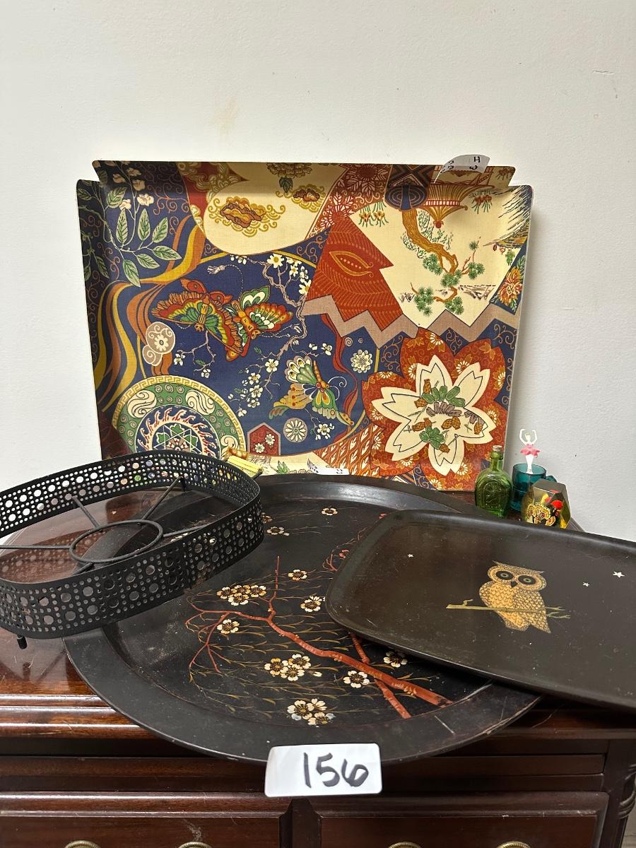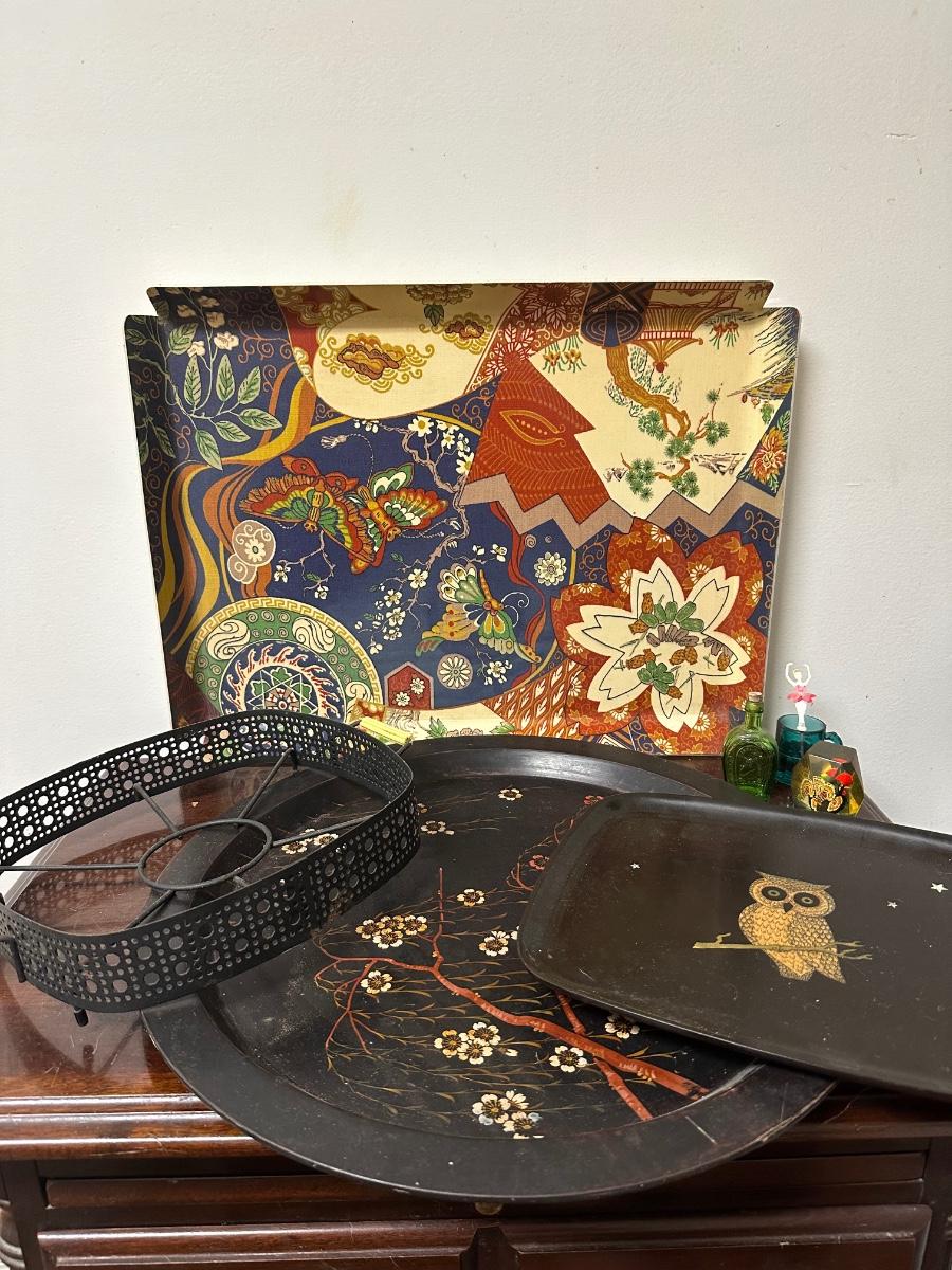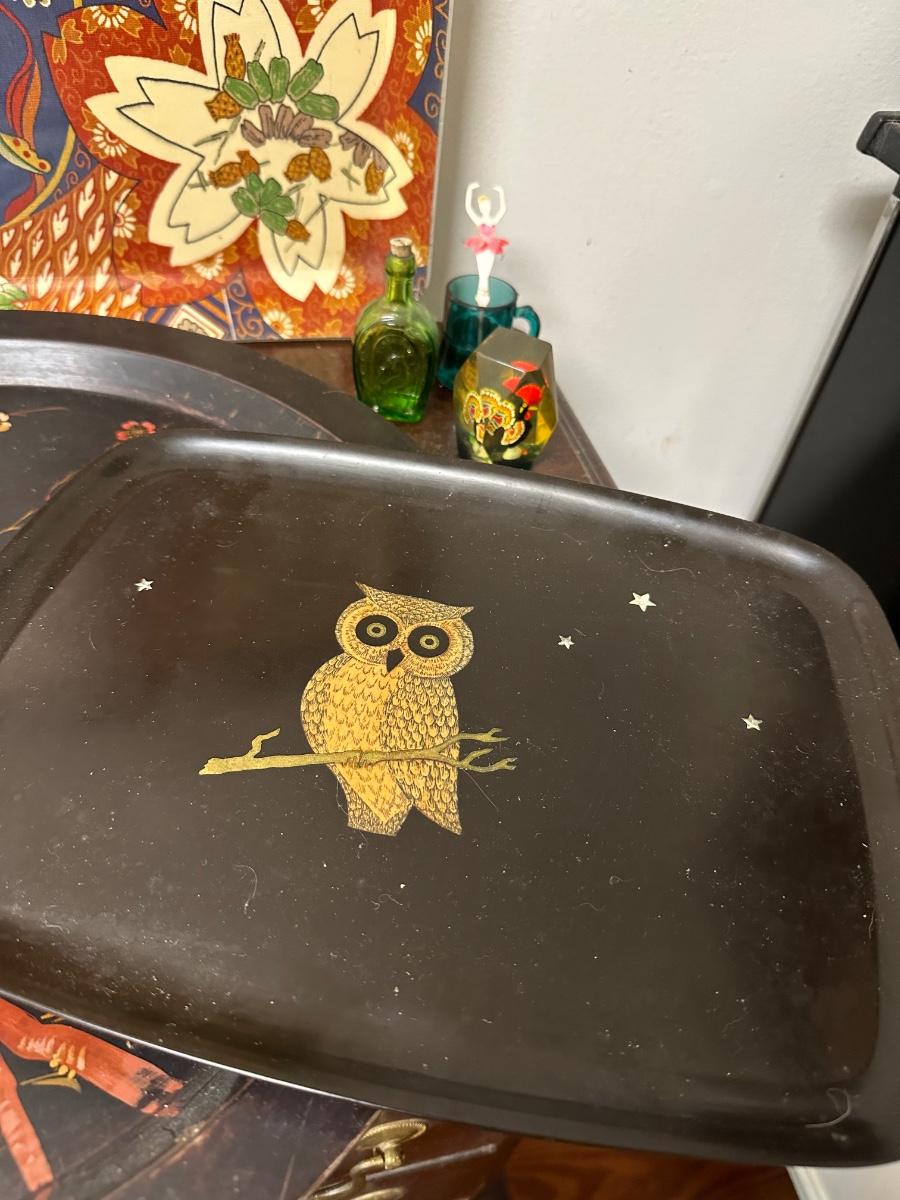 VINTAGE TRAYS, OWL TRAAY HAS CHIP, BOTTLE, TOOTHPICK HOLDER & PAPERWEIGHT