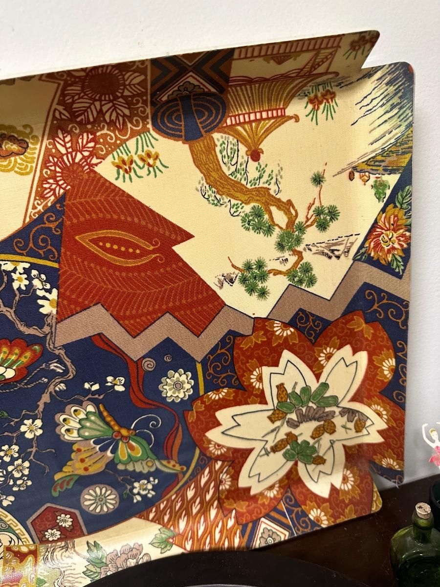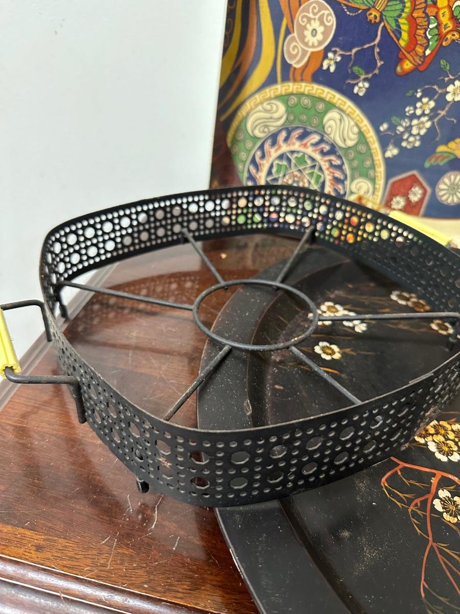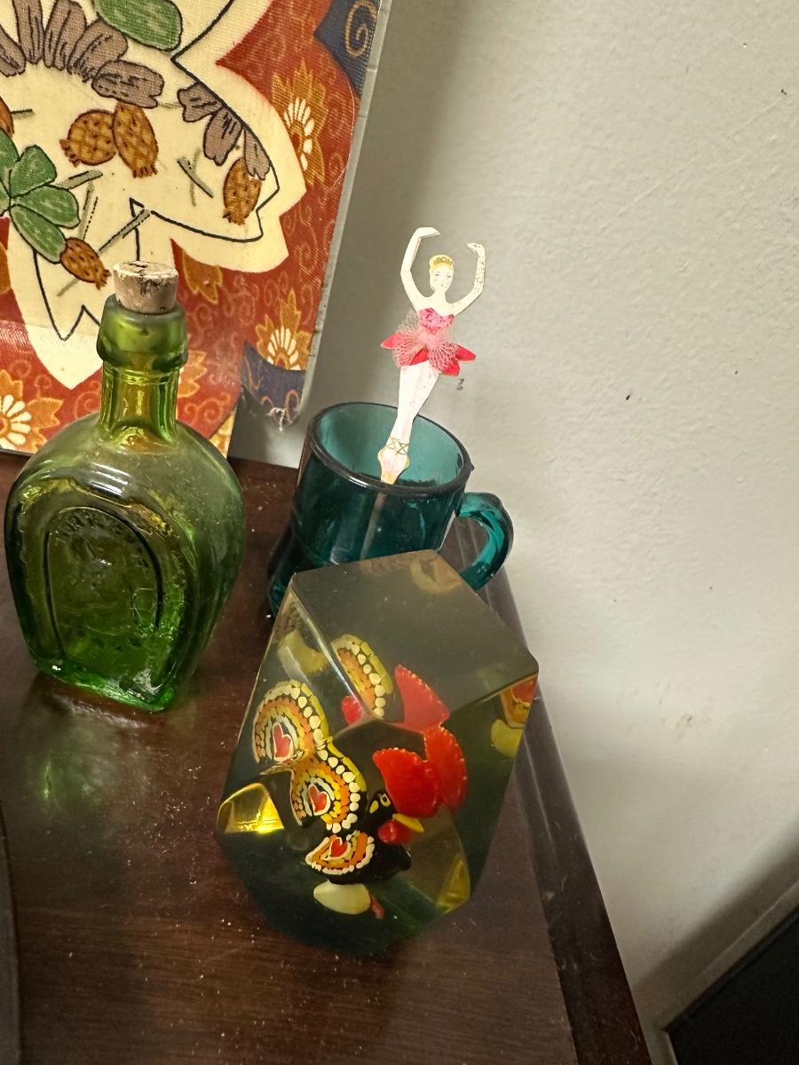 VINTAGE TRAYS, OWL TRAAY HAS CHIP, BOTTLE, TOOTHPICK HOLDER & PAPERWEIGHT