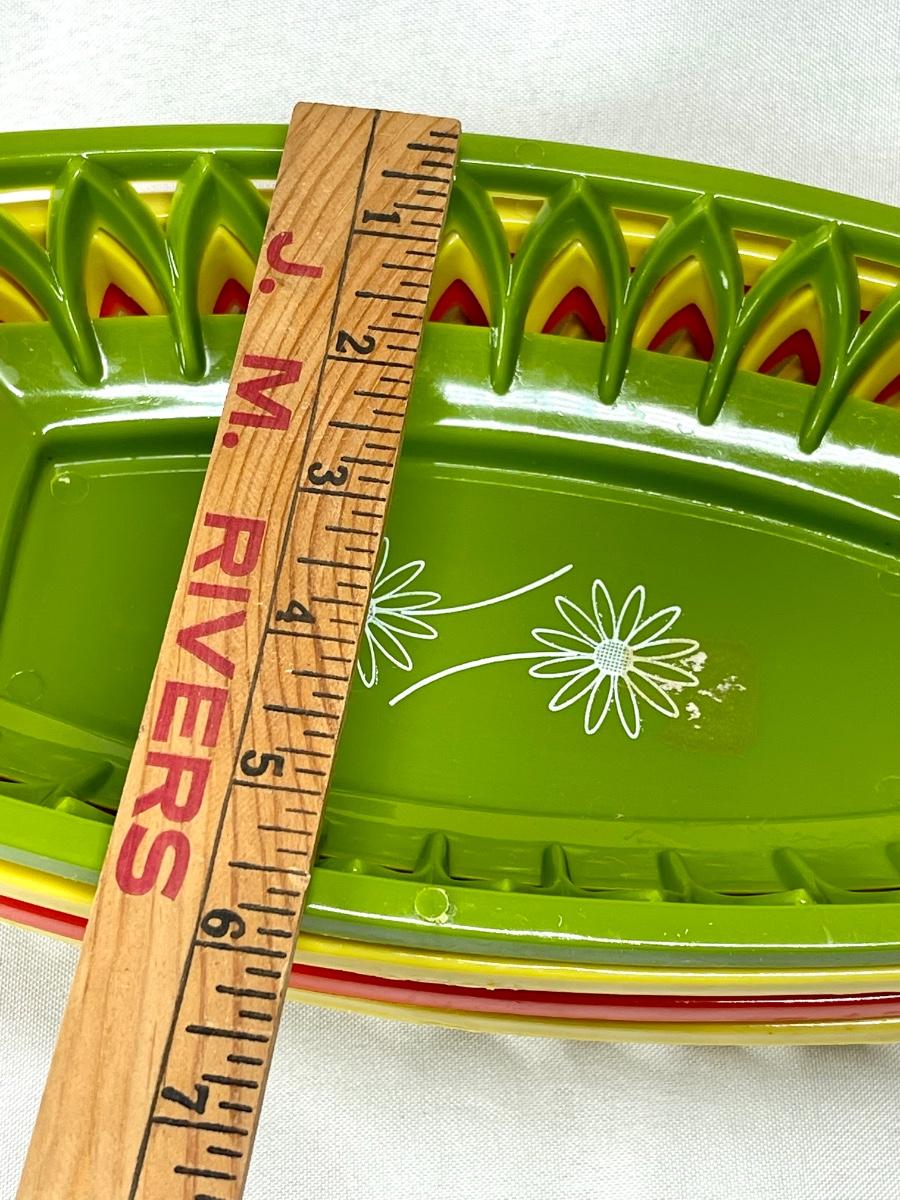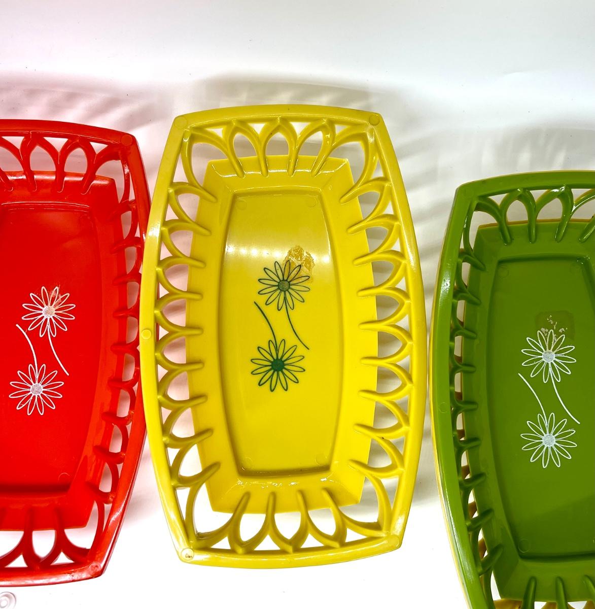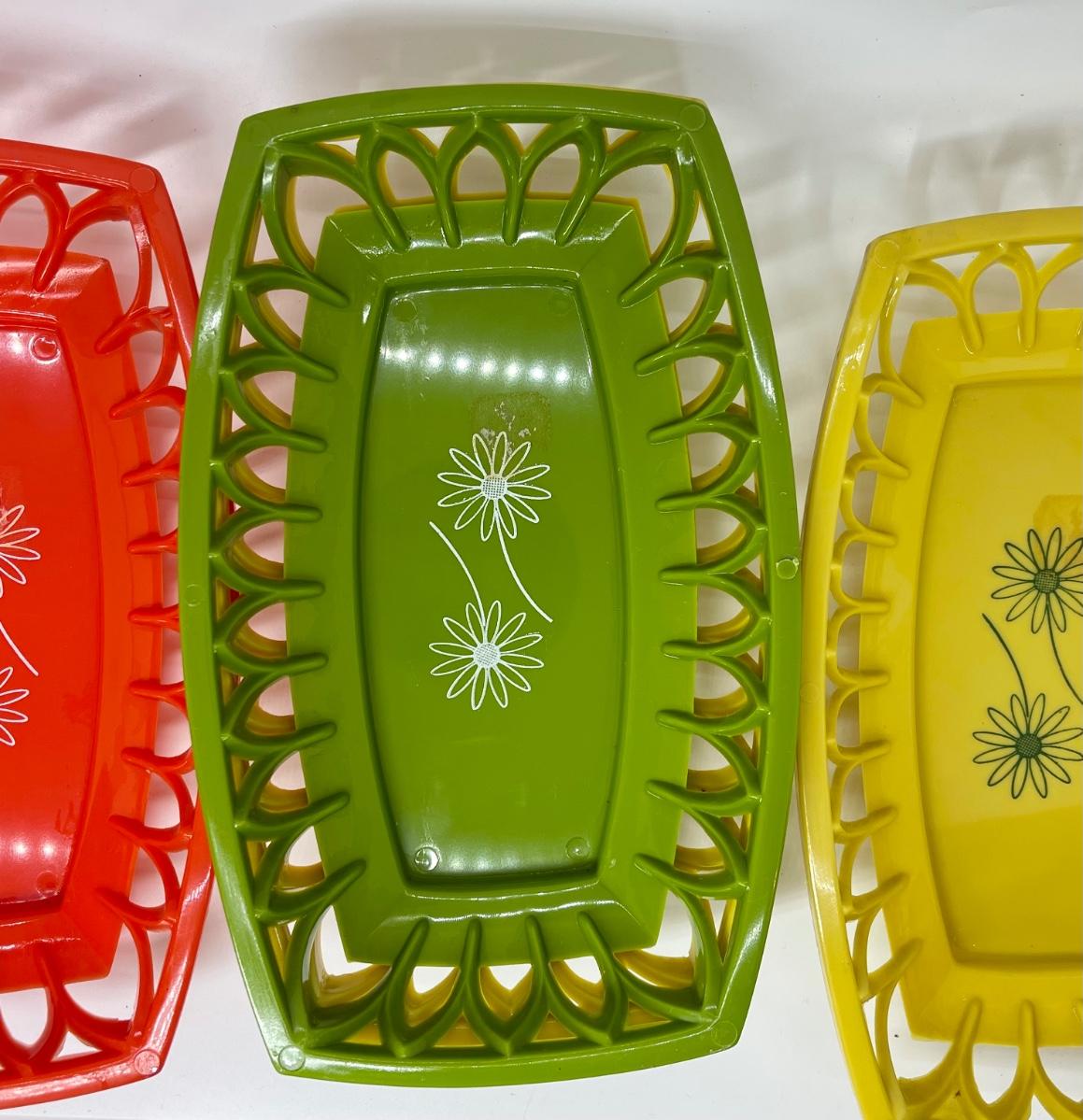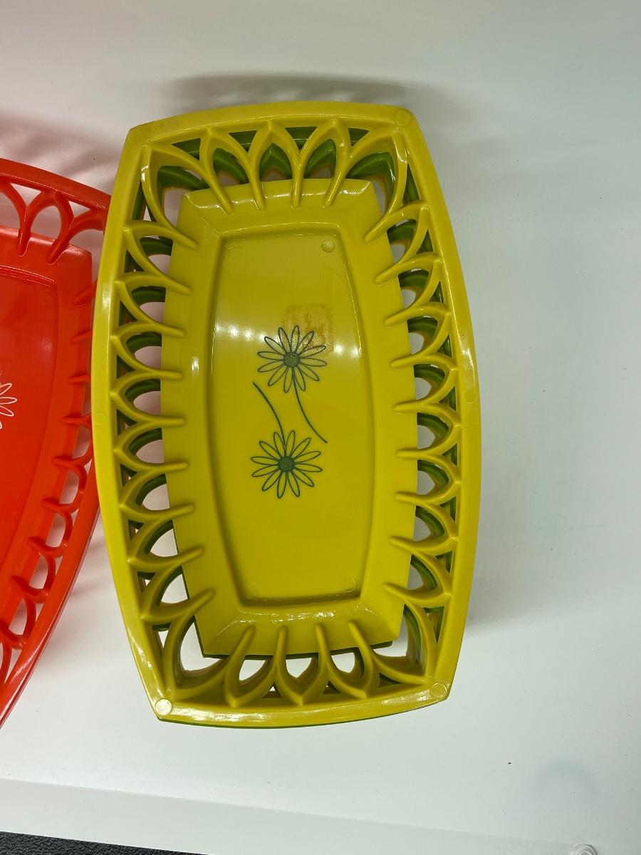 These cute trays are super 70s! I do not believe they’ve ever been used. The price tags were in them but because of the heat in storage some of the stickers are a bit baked on. Buyer will need to clean those areas. Super cool for the vintage kitchen!