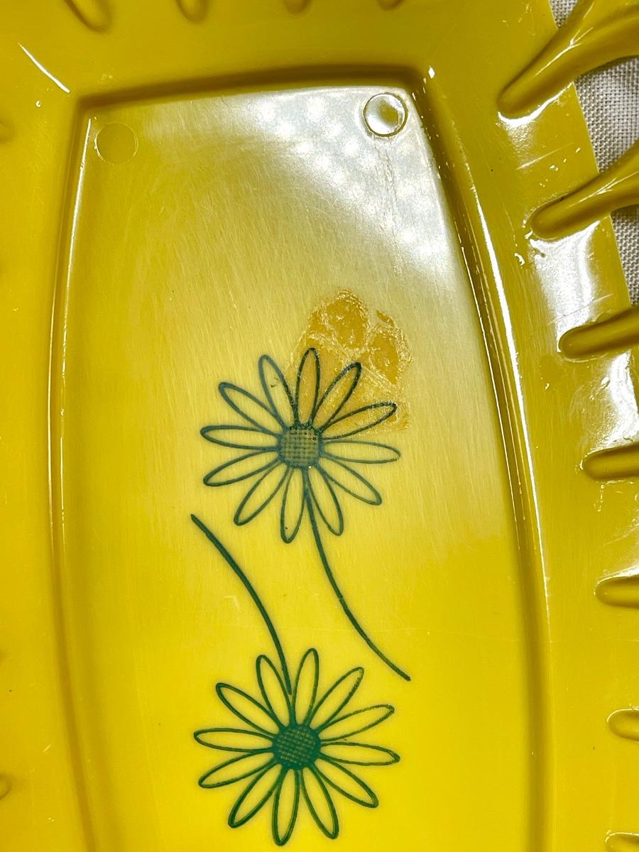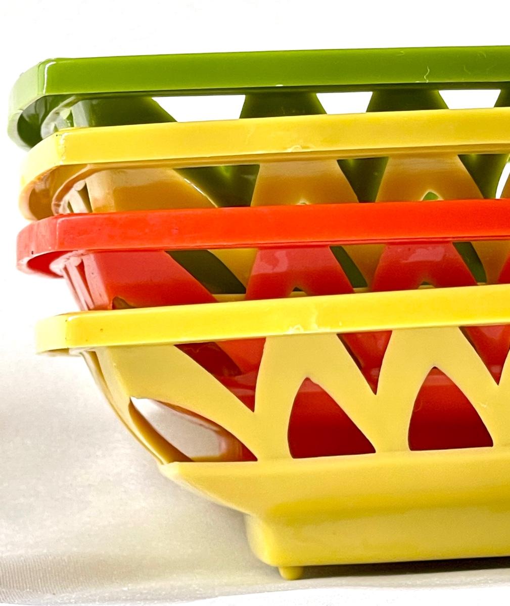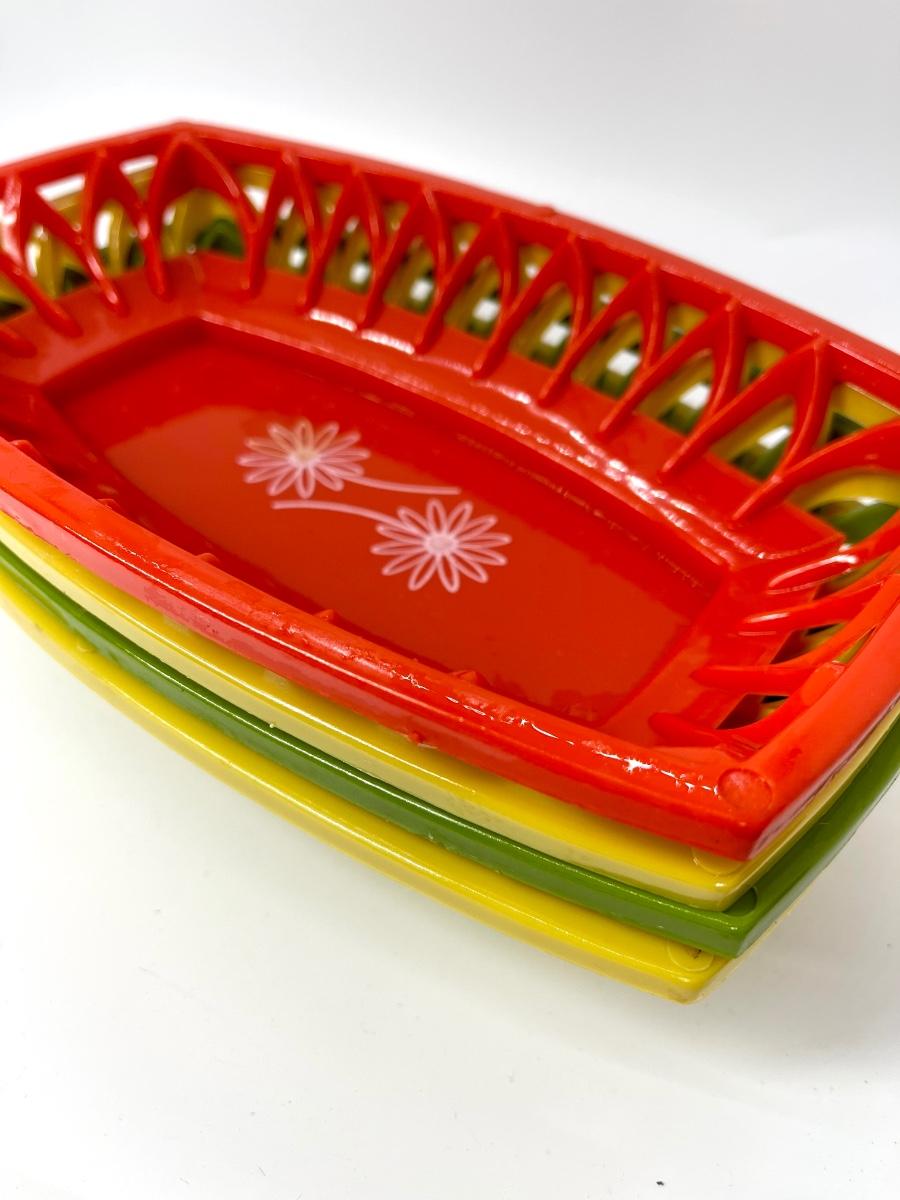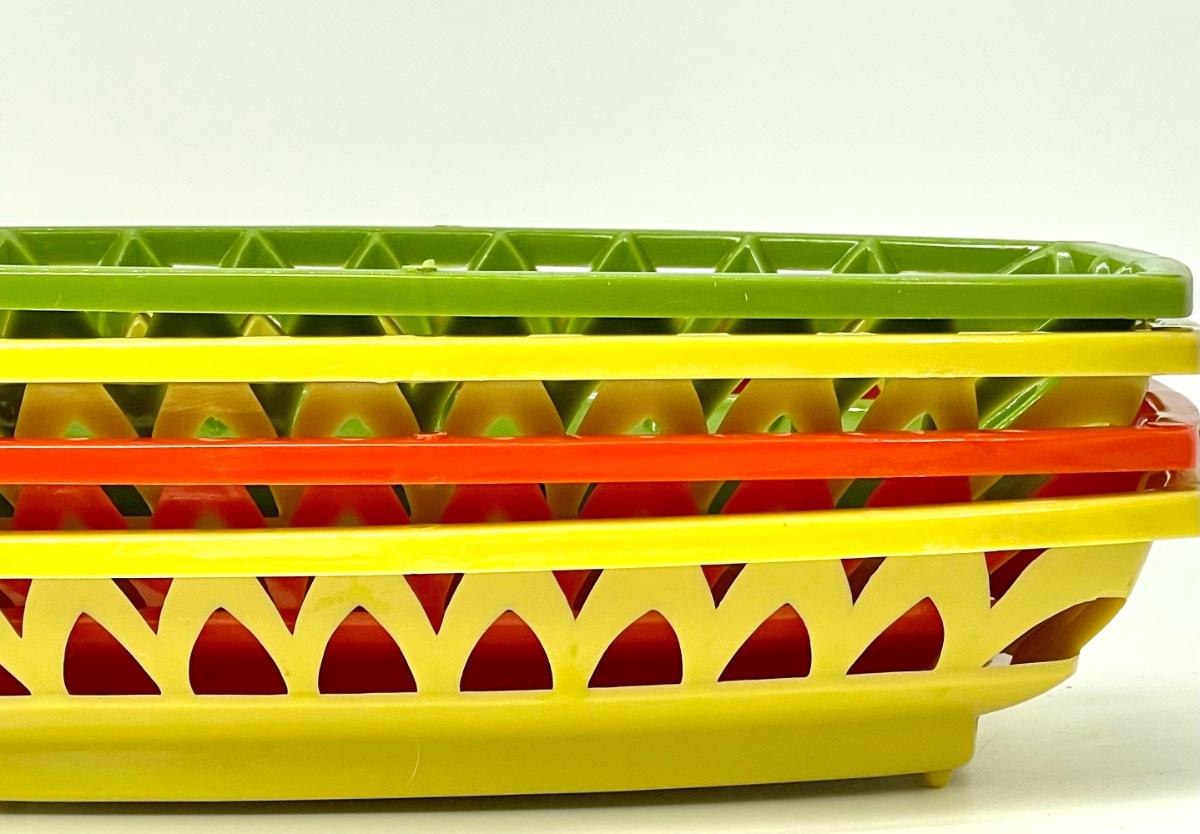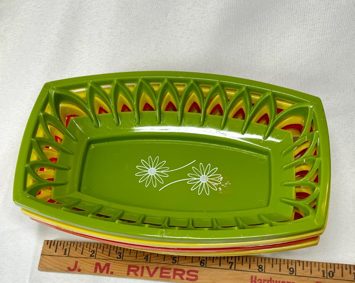 These cute trays are super 70s! I do not believe they’ve ever been used. The price tags were in them but because of the heat in storage some of the stickers are a bit baked on. Buyer will need to clean those areas. Super cool for the vintage kitchen!