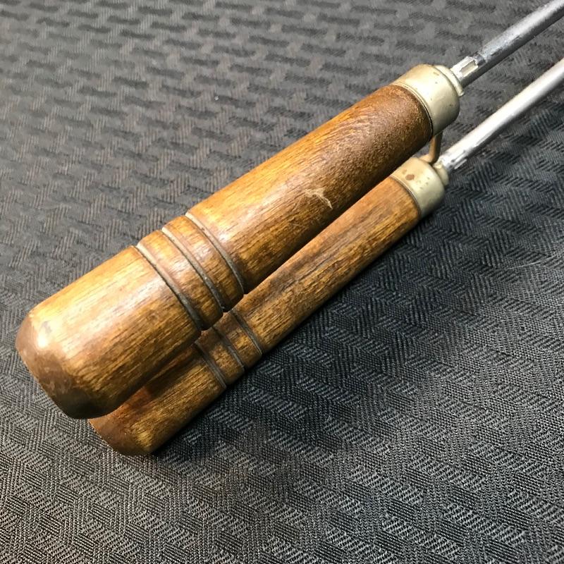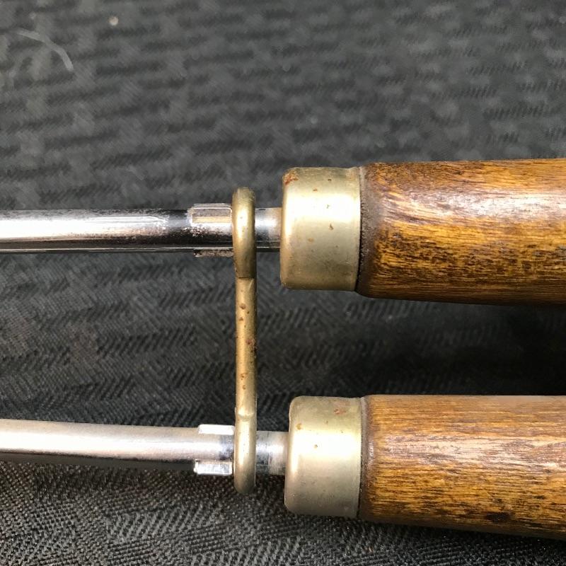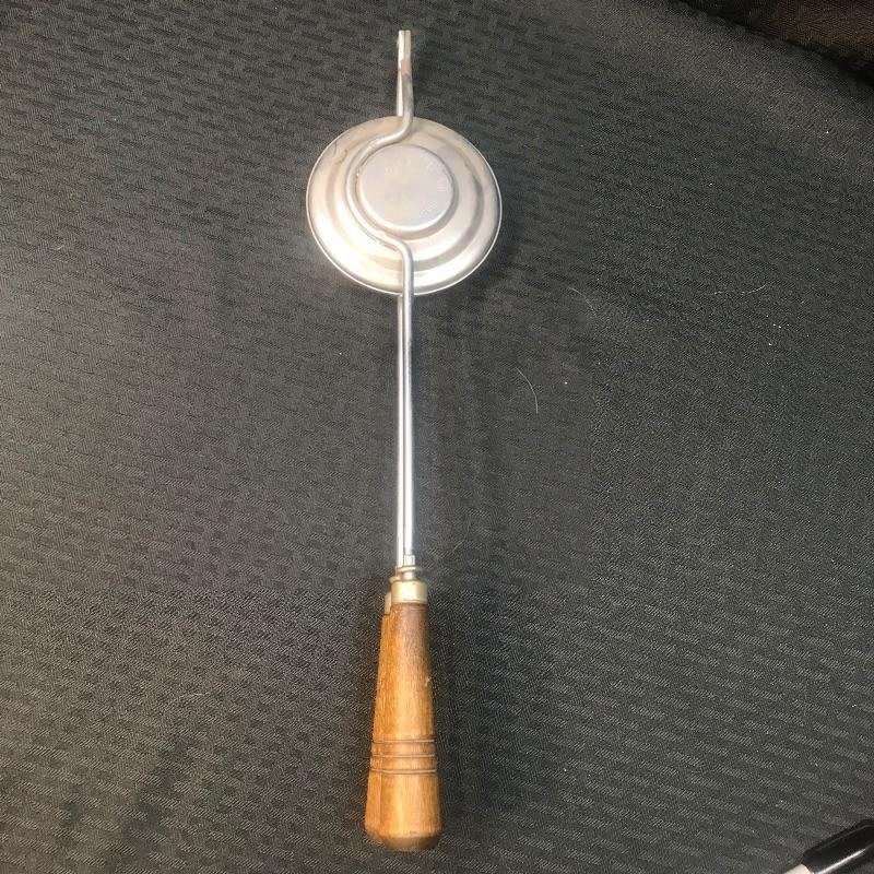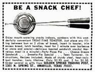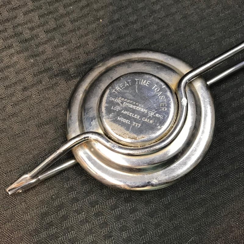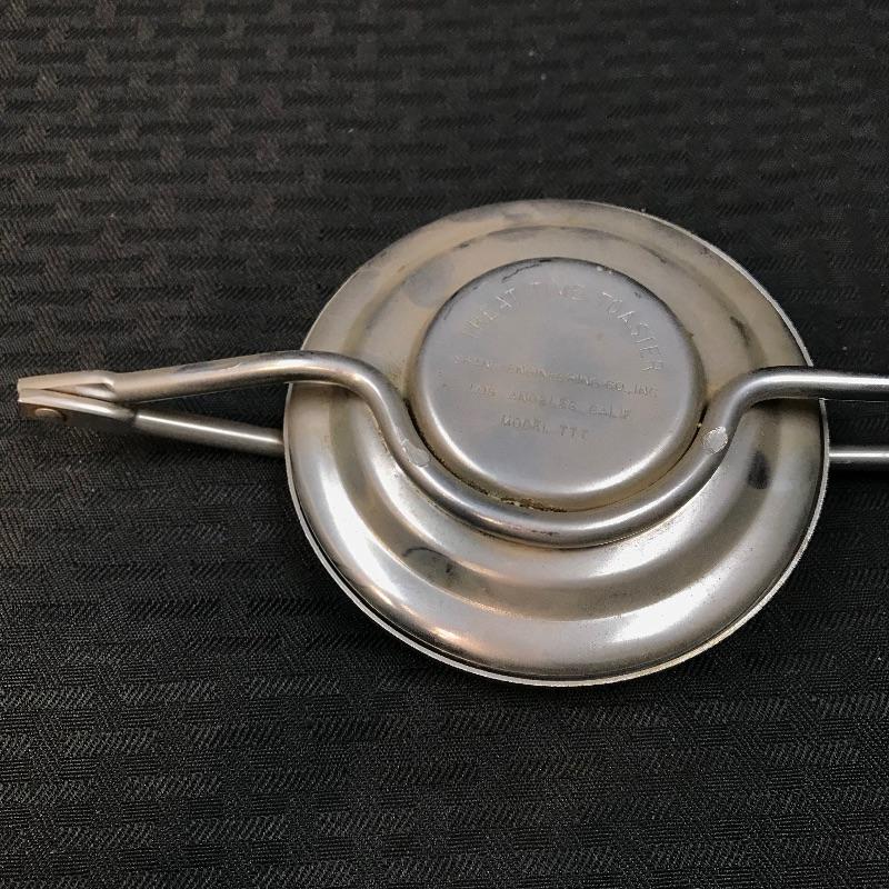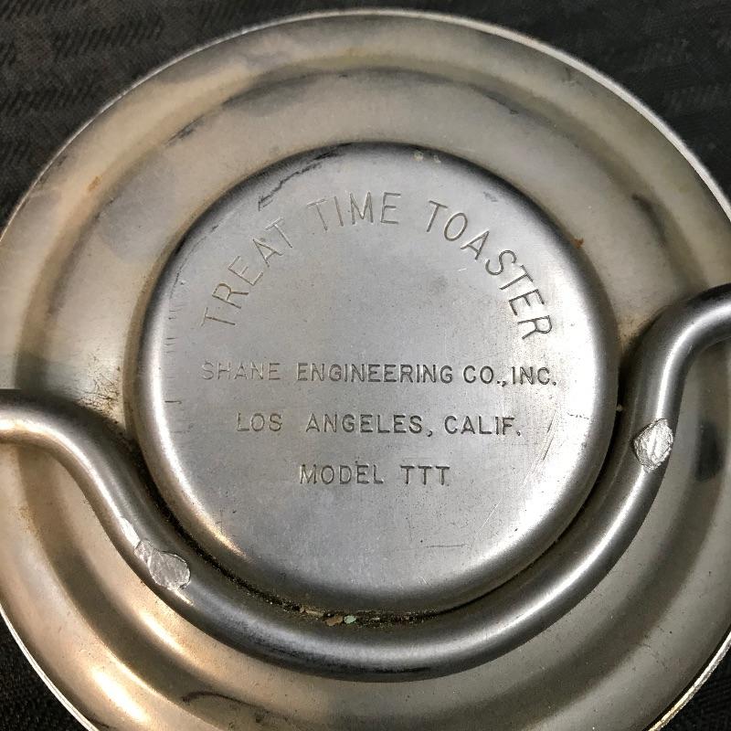 Overall in good condition. There is some corrosion on the hook portion as well as on one of the bottom plates. The main joint at the top has a slight bit of wobble to it. Appears to be made of stainless steel with handles of varnished wood. This contraption closes with a hook fastener. The overall length is 16“ and the round sandwich makers are approx. 4" in daimeter. The press is marked-both plates: TREAT-TIME TOASTER, Shane Engineering Co., Inc., Los Angeles, Calif. Model TTT.