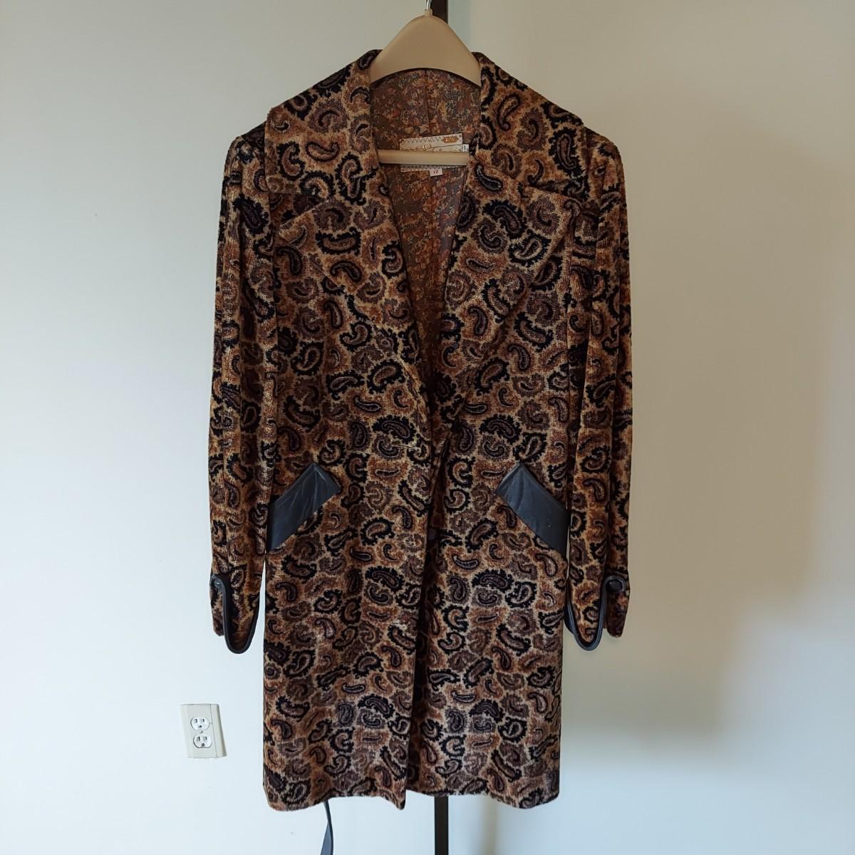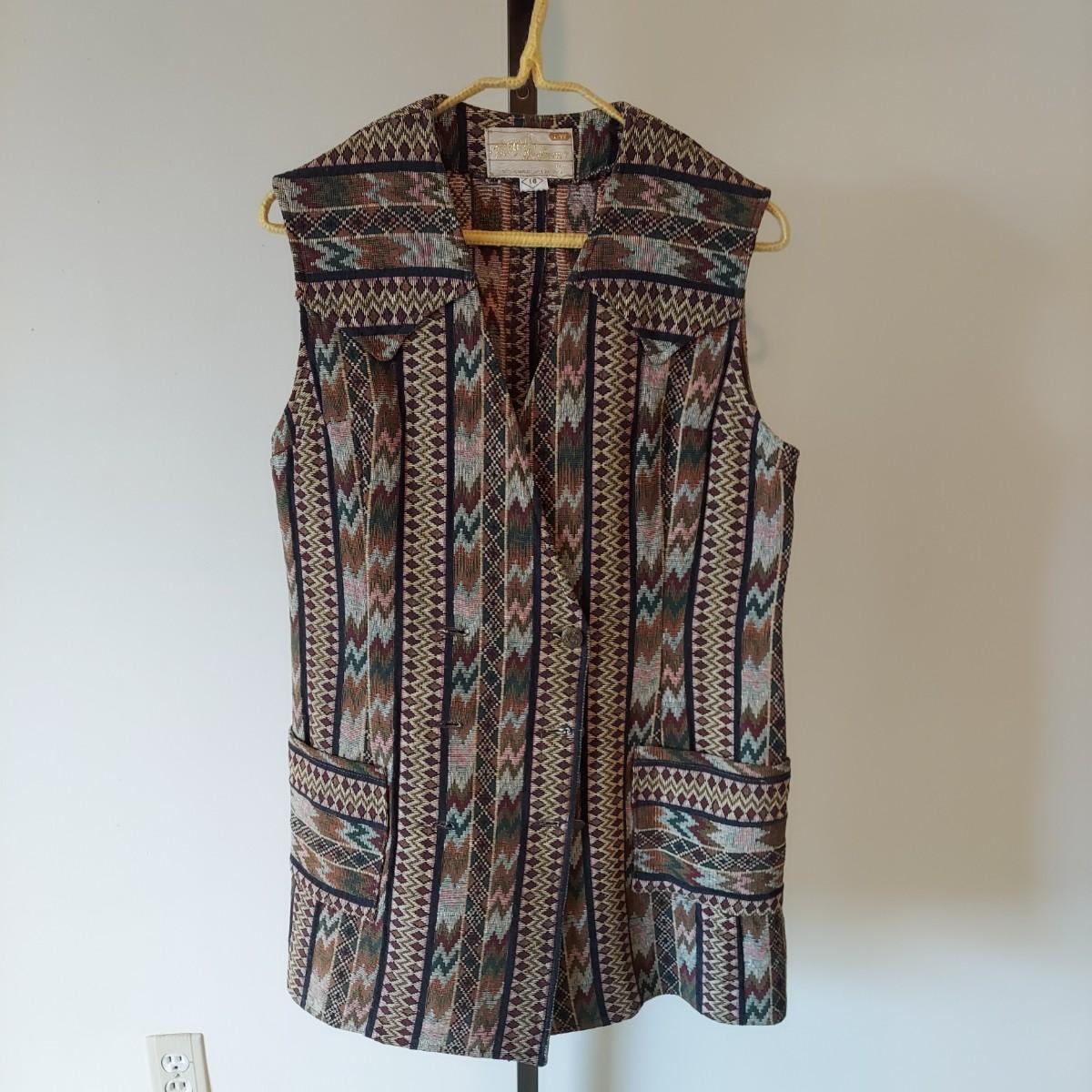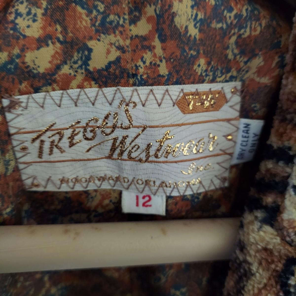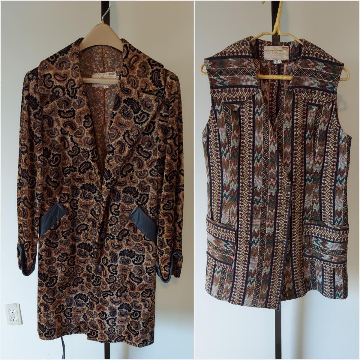 Two pieces of vintage clothing by Trego's Westwear Inc. See images for sizes. Paisley print carpet style jacket has leather accents. Woven upholstery style print vest is double breasted and has metal buttons. Please see photos for details. Shipping available. Clothing racks are props and are not included in the auction!
