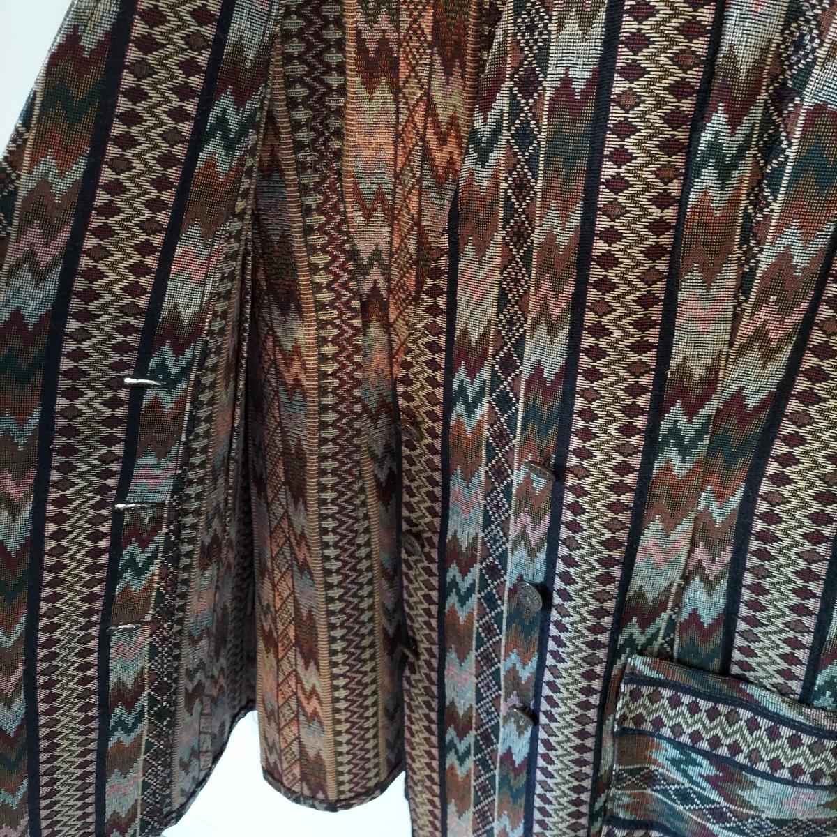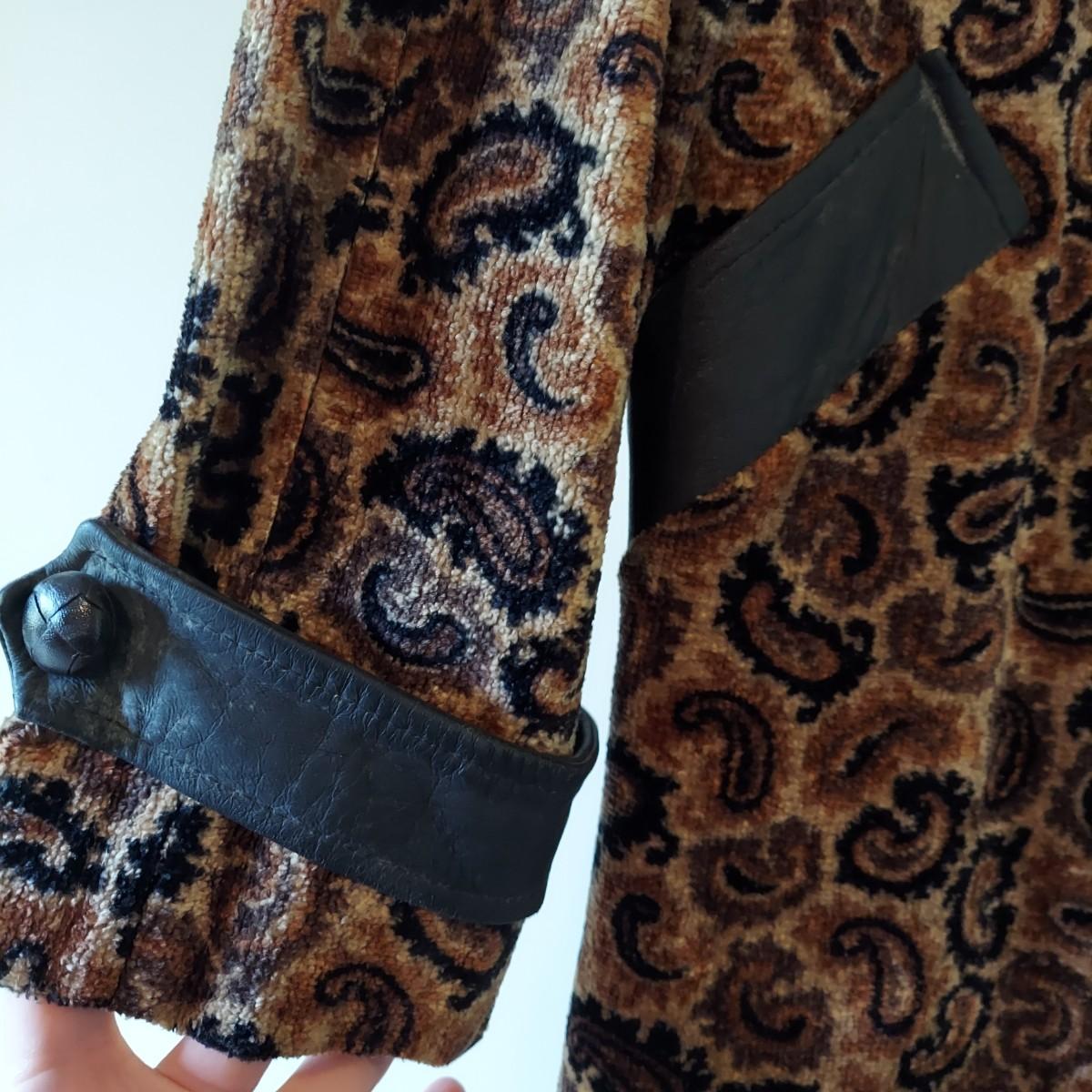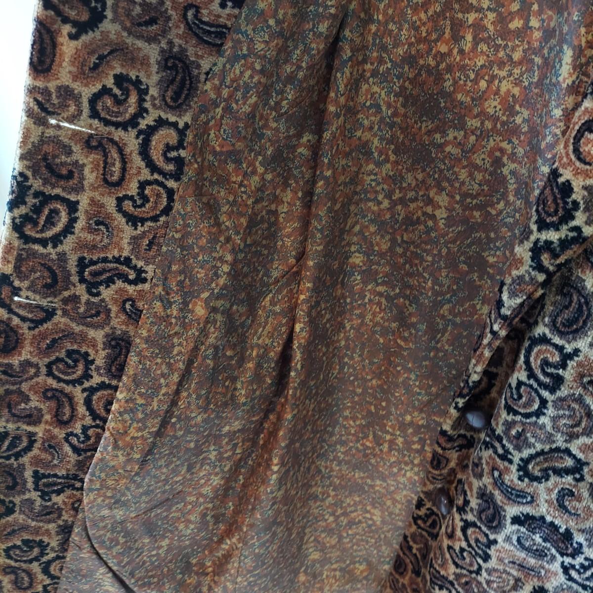 Two pieces of vintage clothing by Trego's Westwear Inc. See images for sizes. Paisley print carpet style jacket has leather accents. Woven upholstery style print vest is double breasted and has metal buttons. Please see photos for details. Shipping available. Clothing racks are props and are not included in the auction!