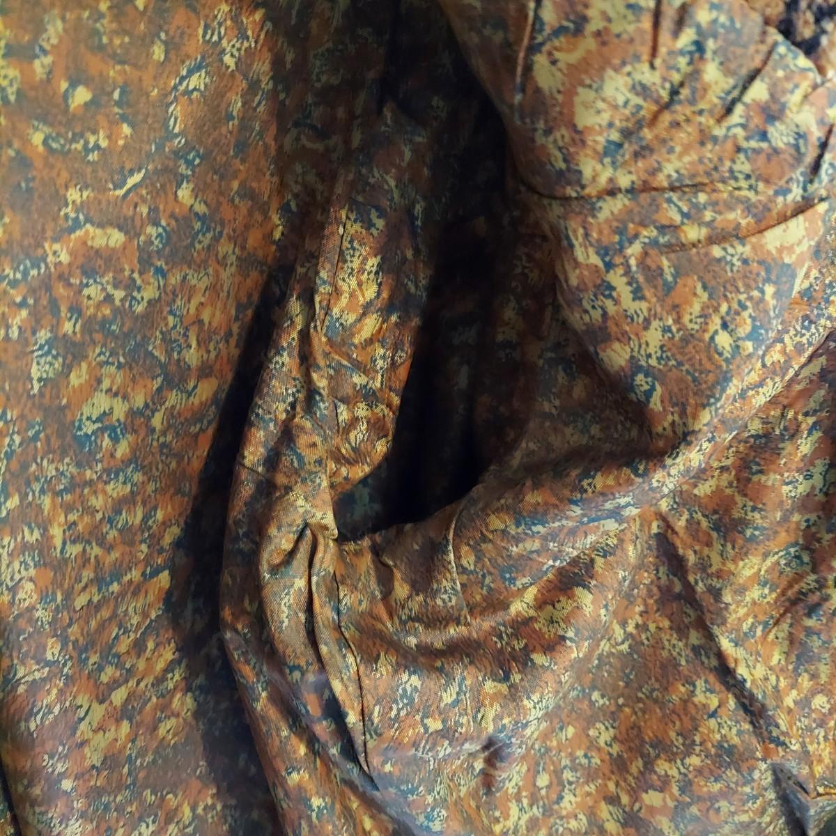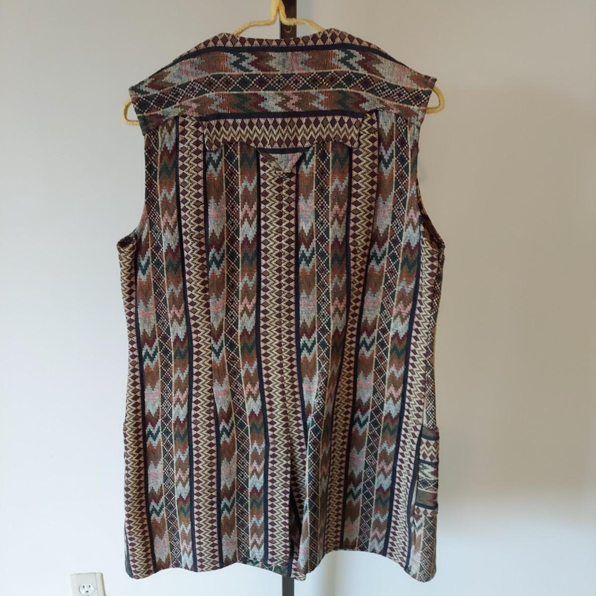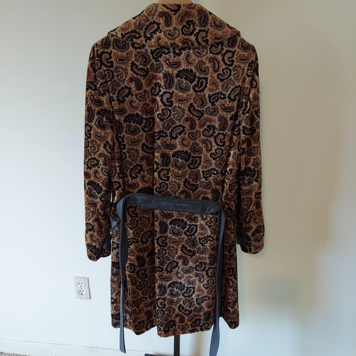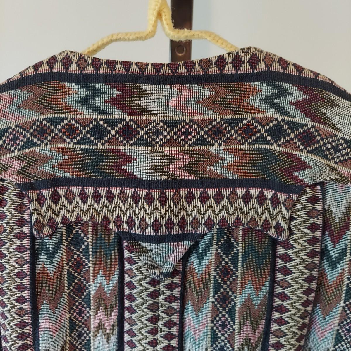 Two pieces of vintage clothing by Trego's Westwear Inc. See images for sizes. Paisley print carpet style jacket has leather accents. Woven upholstery style print vest is double breasted and has metal buttons. Please see photos for details. Shipping available. Clothing racks are props and are not included in the auction!