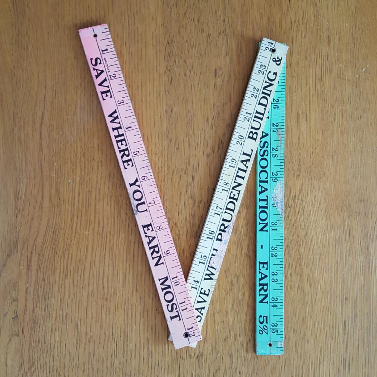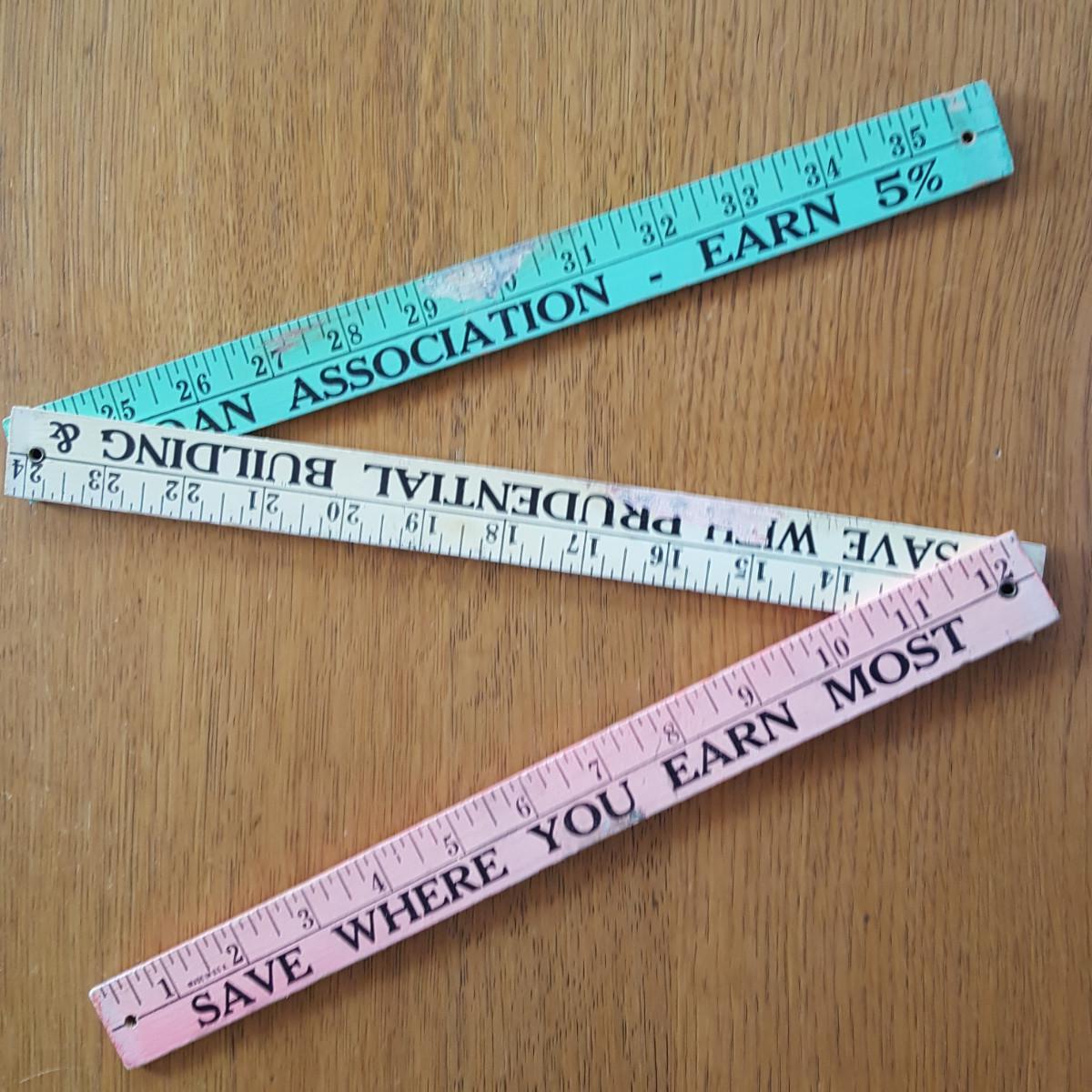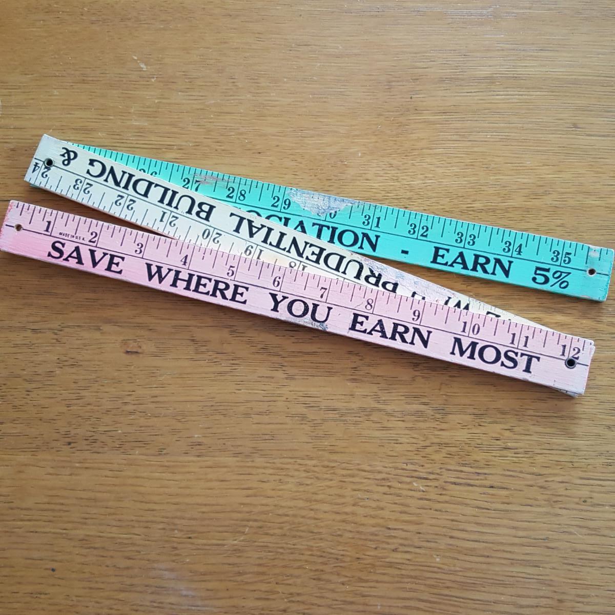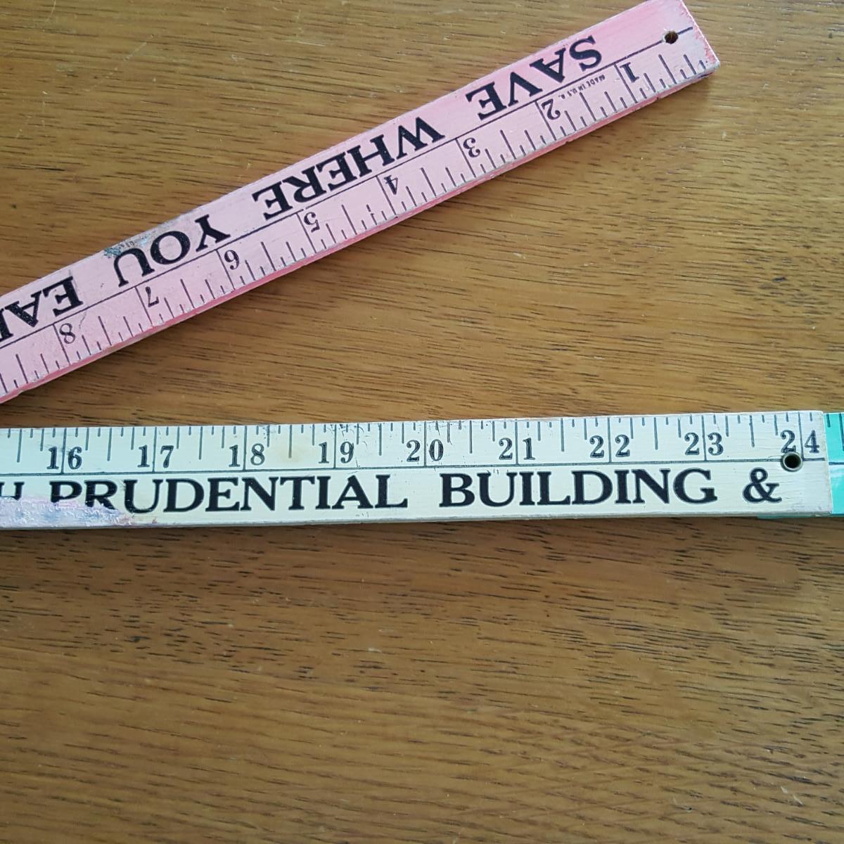This auction lot is for a Vintage Tri-Fold Prudential Yardstick. This yardstick is an advertisement for the old Louisville, KY Prudential Savings and Loan Association. Many local folks lost much money when this business went bust - it was before laws changed and businesses like this became insured. It's a small measure of local history.