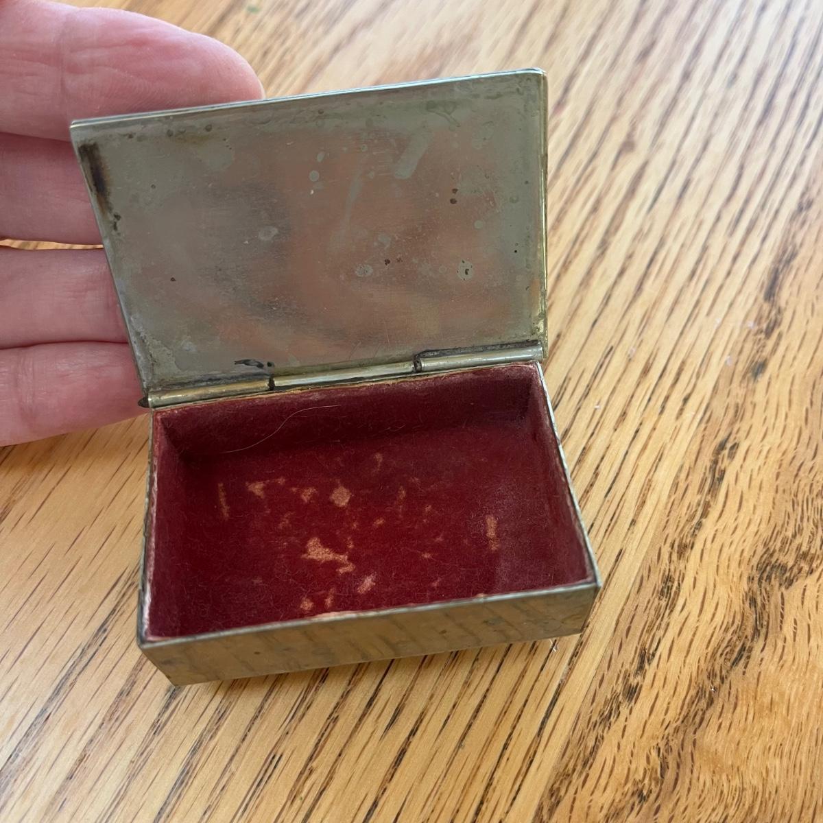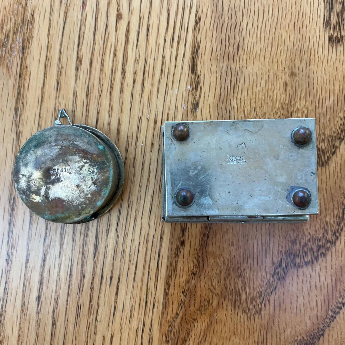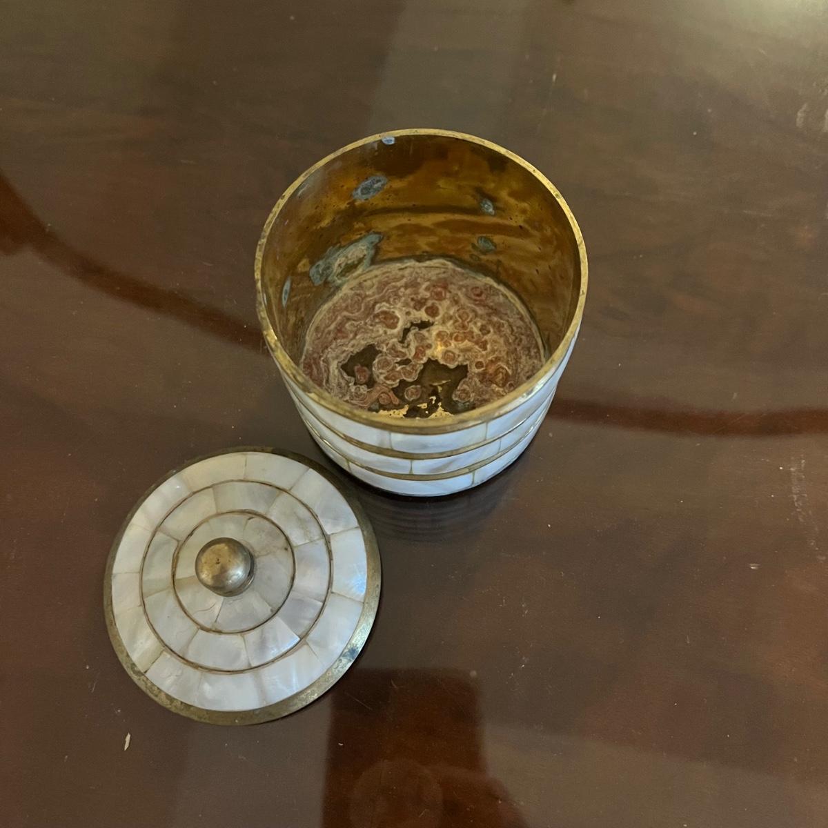 Four lovely trinket boxes in various sizes are included. The largest is a Chinese porcelain trinket box measuring 4.75”D x 2.75”H. Note that there is an hairline crack in the lid on this one. Also a brass and mother of pearl keepsake box, and two smaller trinket boxes with decorative inlaid lids.