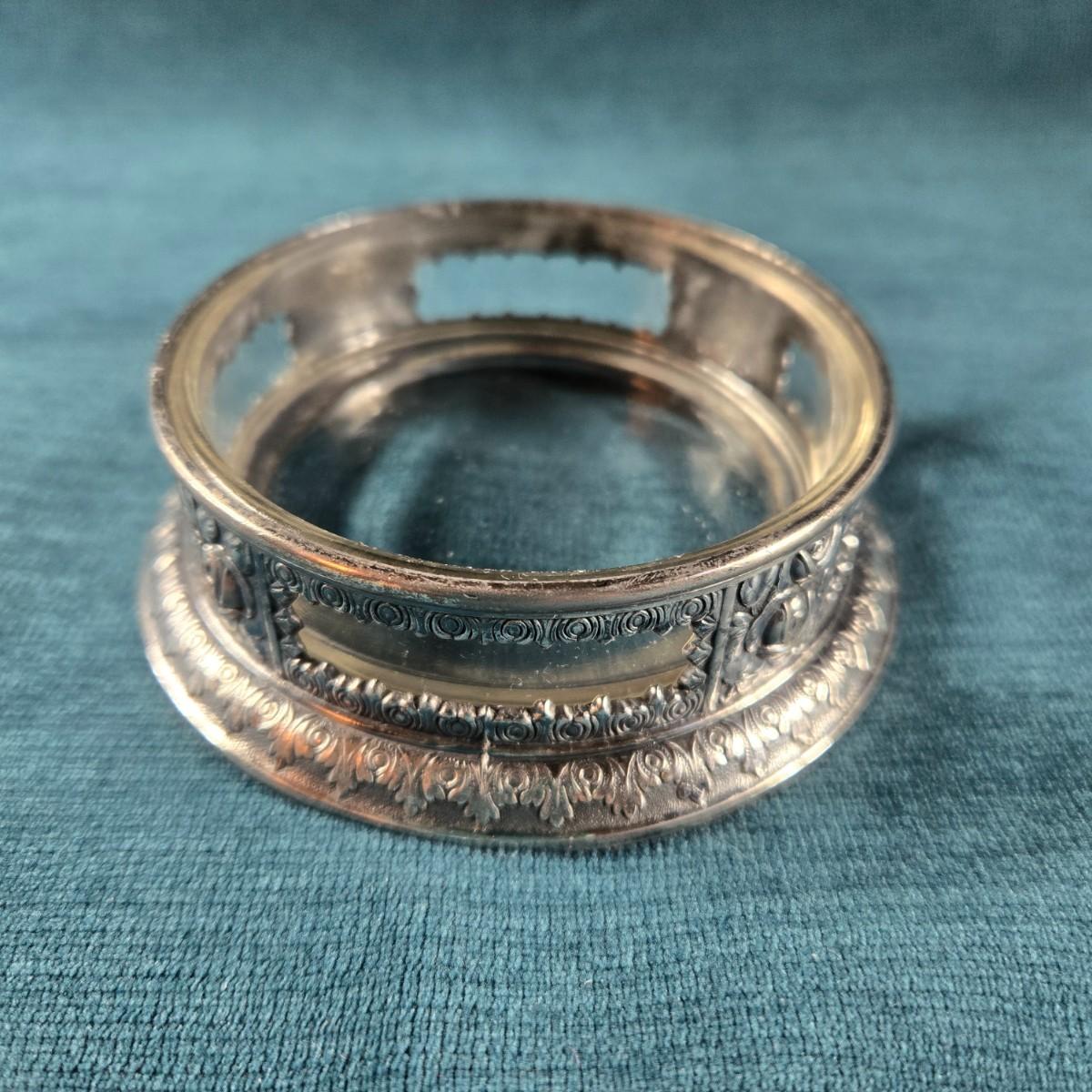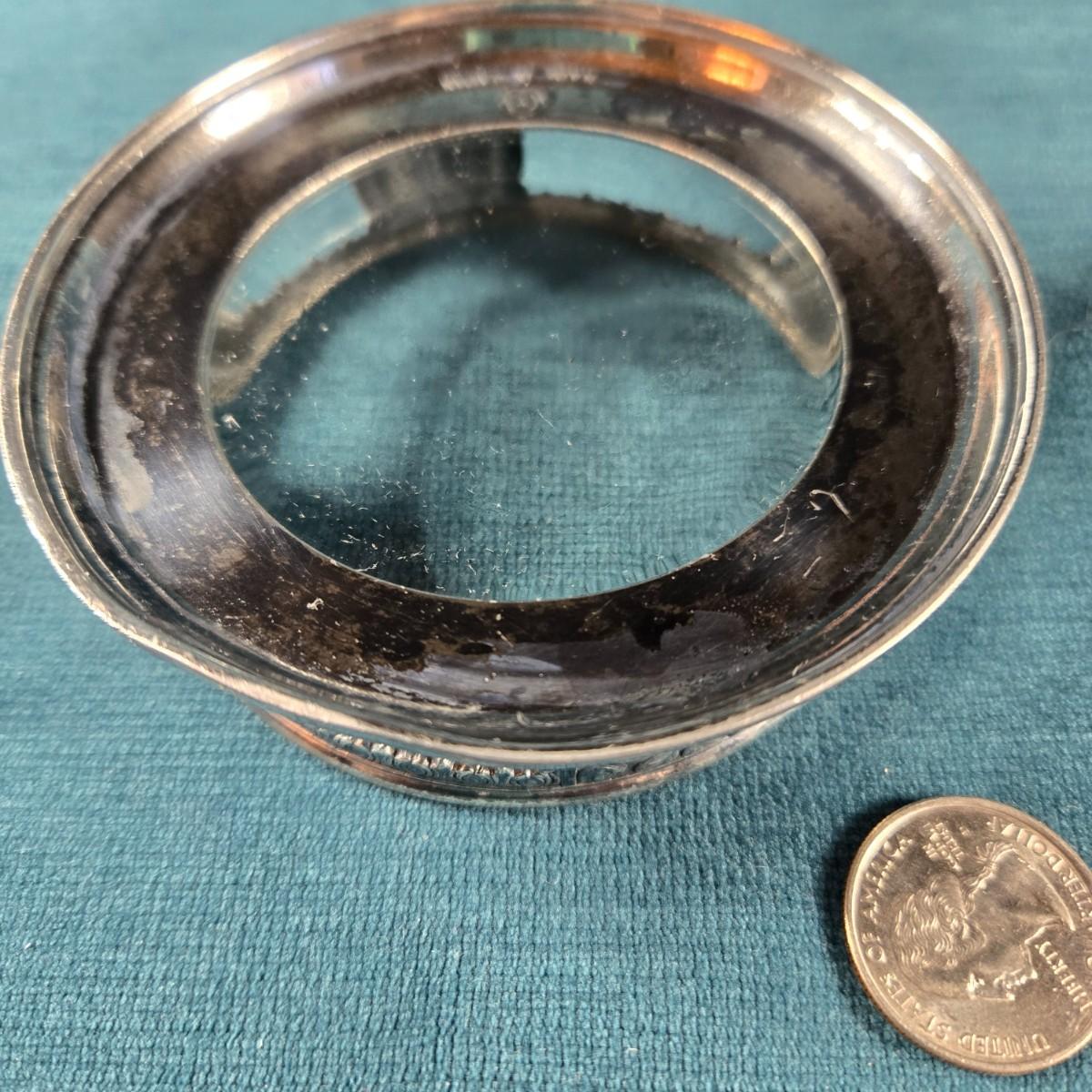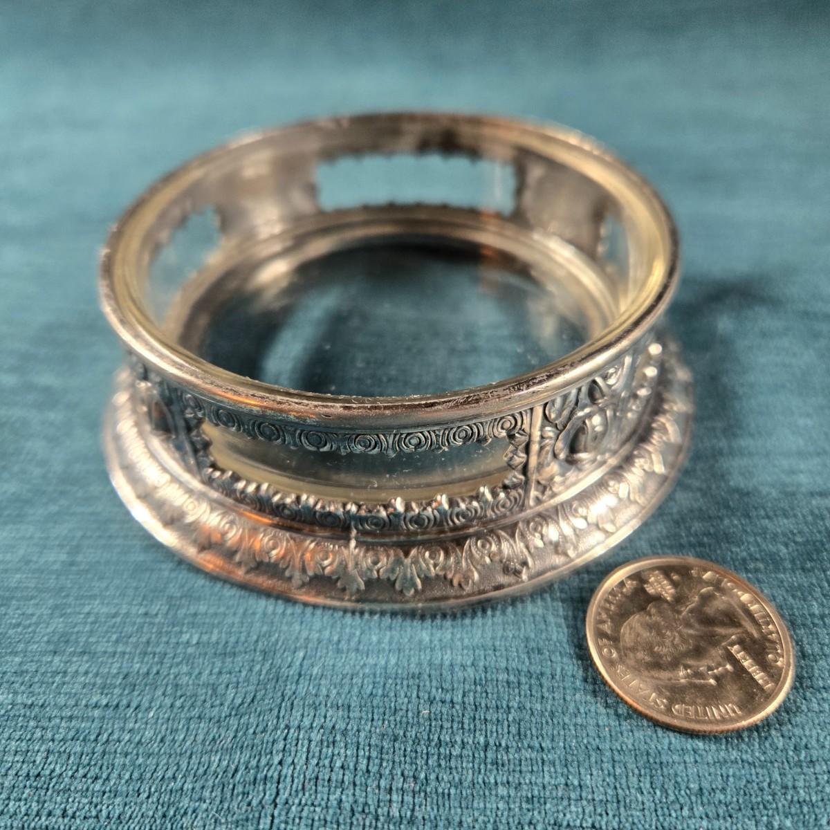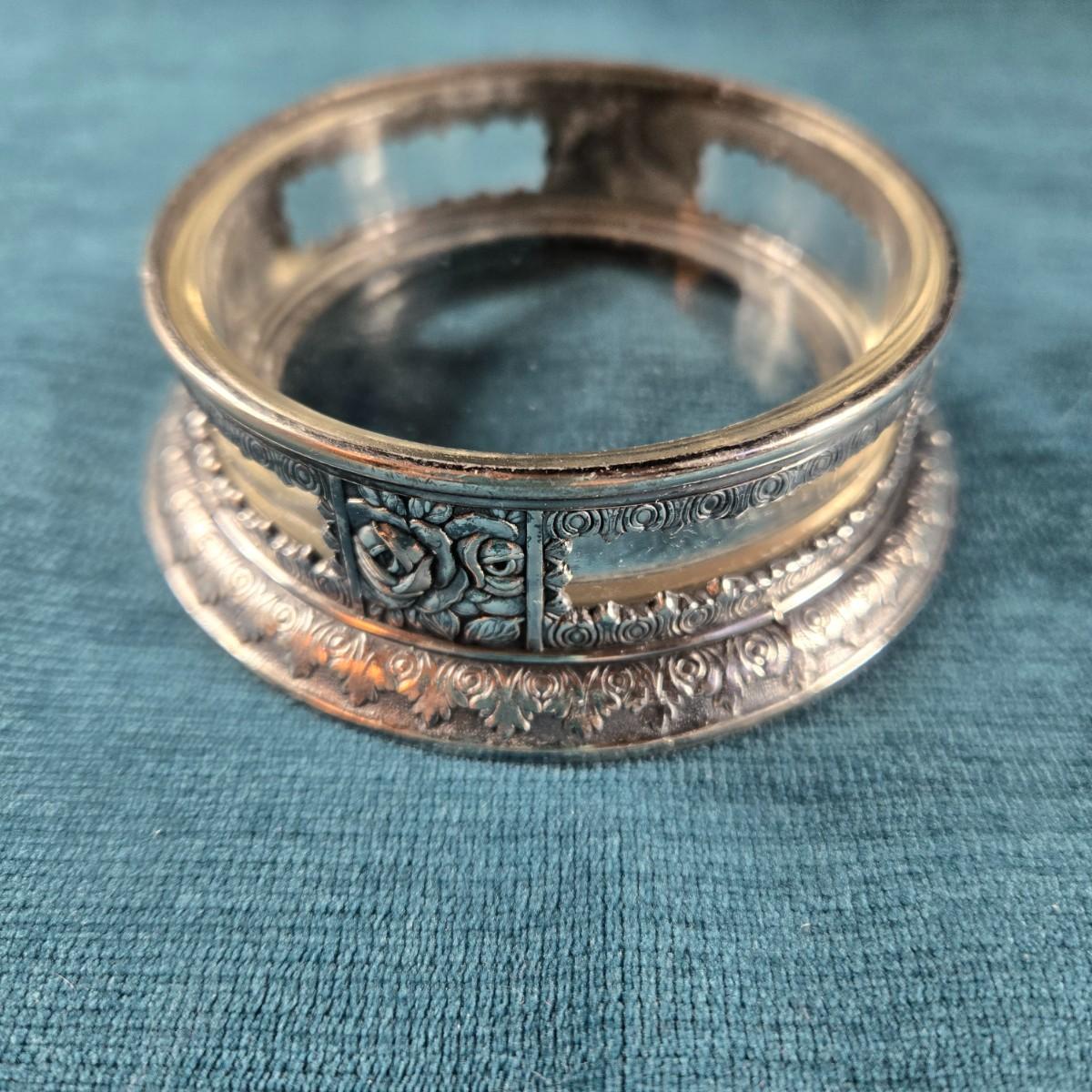 This auction lot is for a Vintage Trinket Bowl. This is an antique silverplated, ornate dresser or desk bowl. It has a glass bottom and states on backside Made in Japan. It is about 4-inches in diameter and 1-inch tall. Very pretty. Would look great on your desk for paper clips or on your dresser for jewelry.