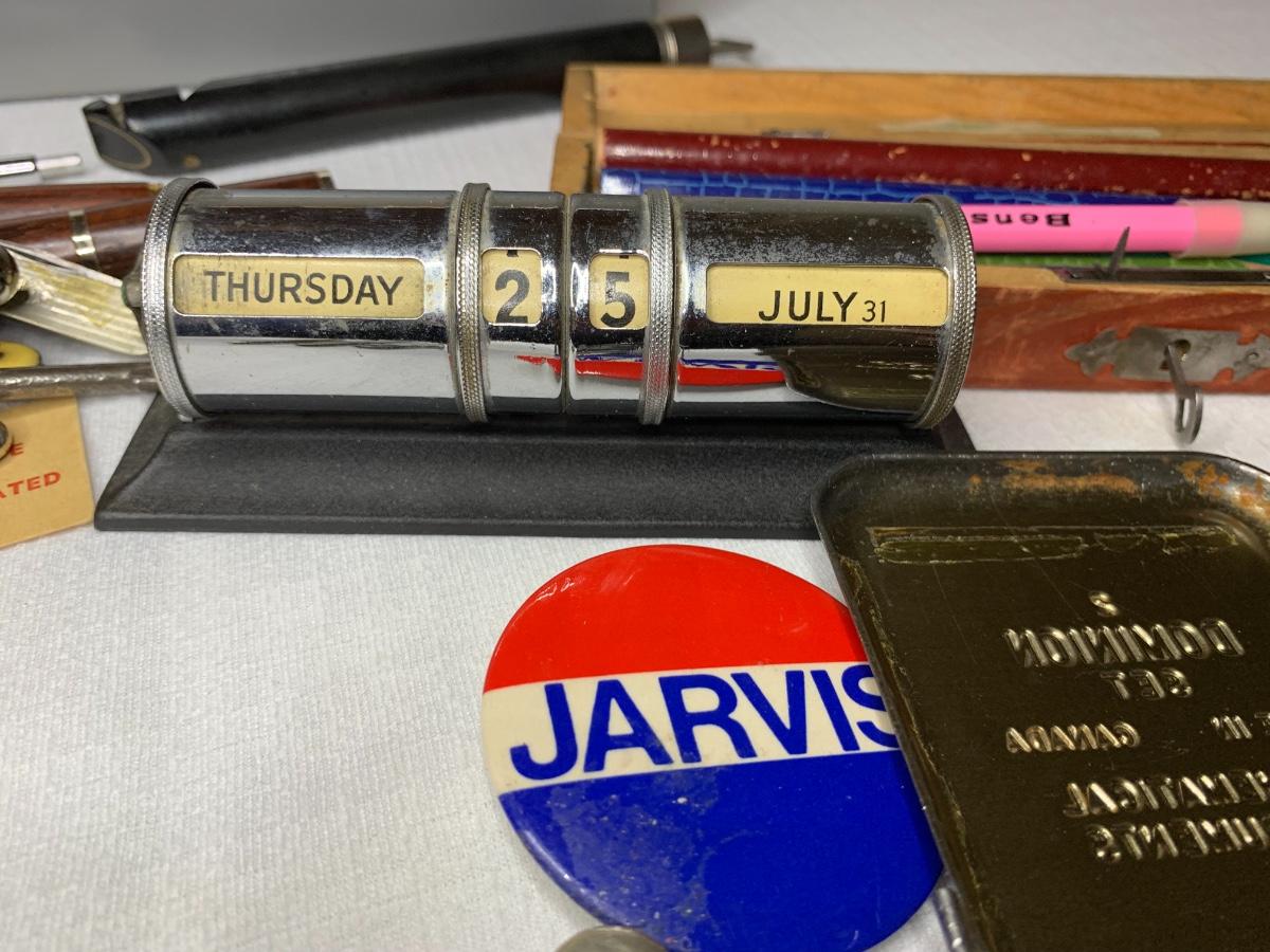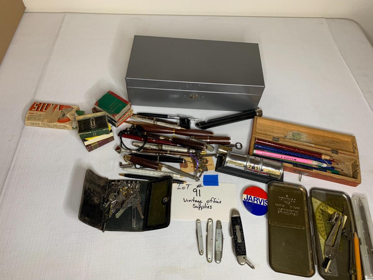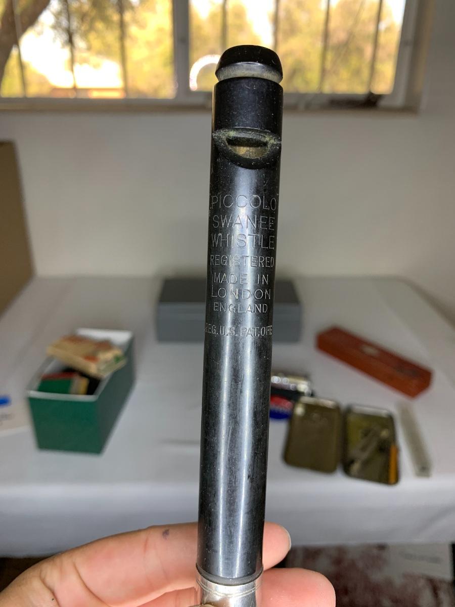 Antique Piccolo Swanee slide whistle, metal and wood storage boxes, vintage pens, compass, locks and keys, desk calendar, letter openers, pocket knives, office supplies and more!