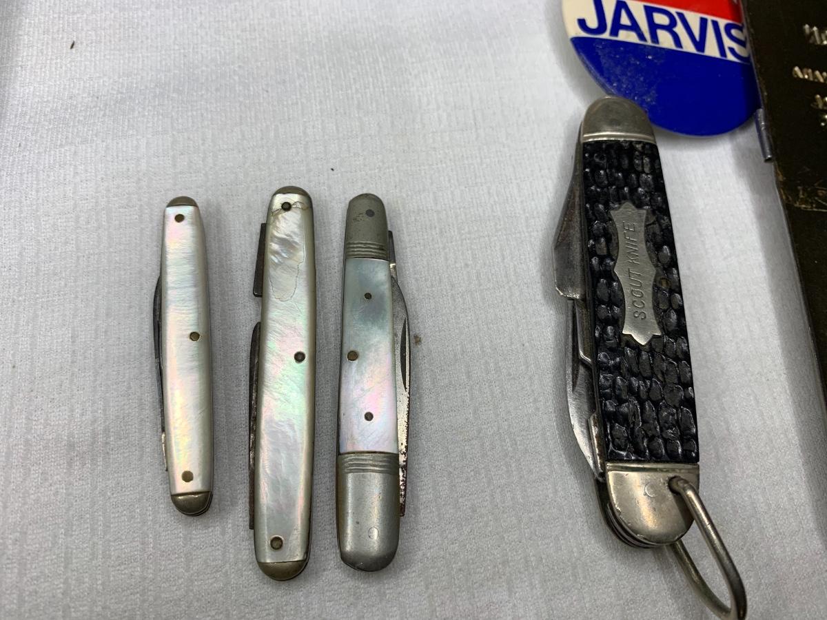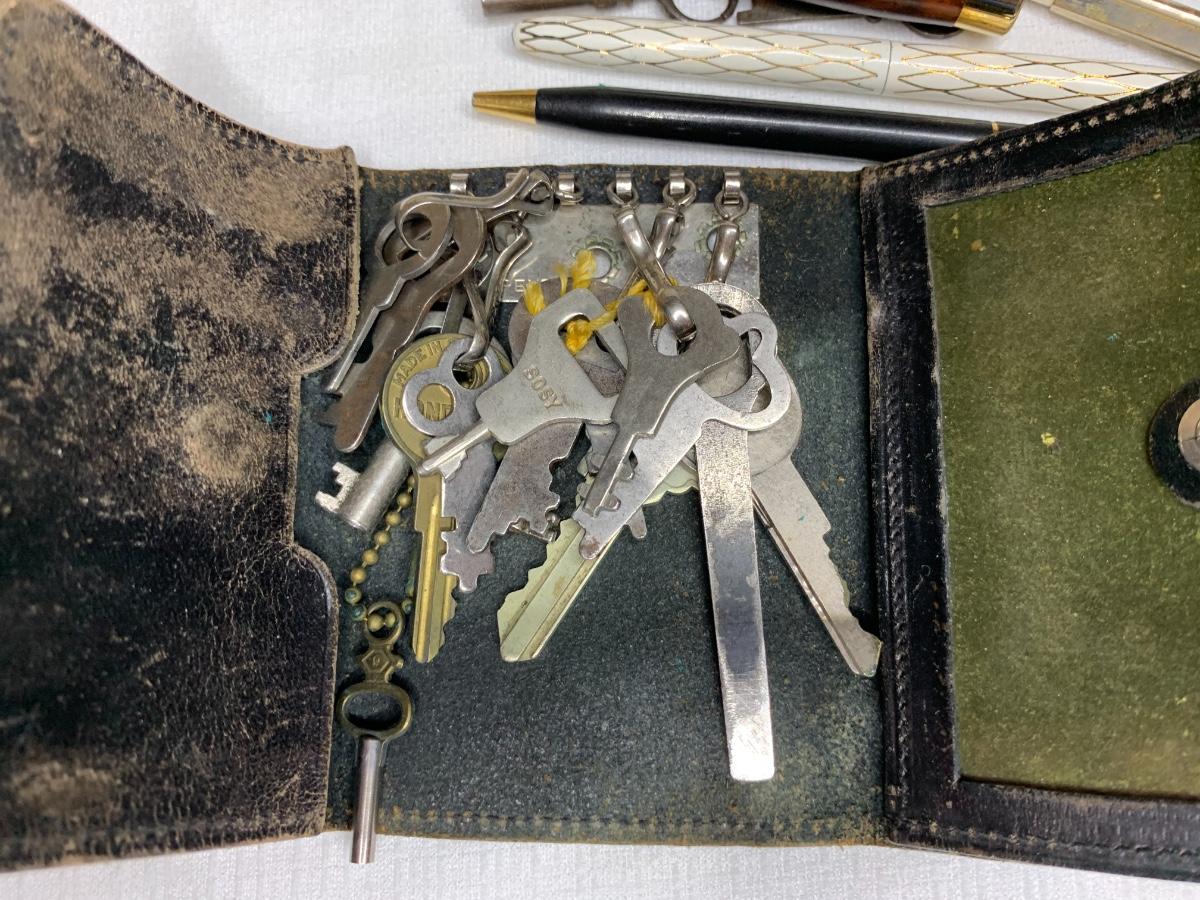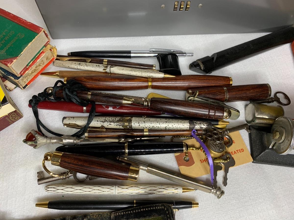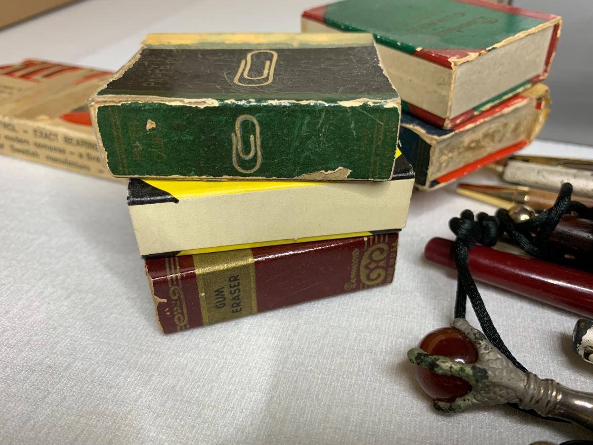 Antique Piccolo Swanee slide whistle, metal and wood storage boxes, vintage pens, compass, locks and keys, desk calendar, letter openers, pocket knives, office supplies and more!