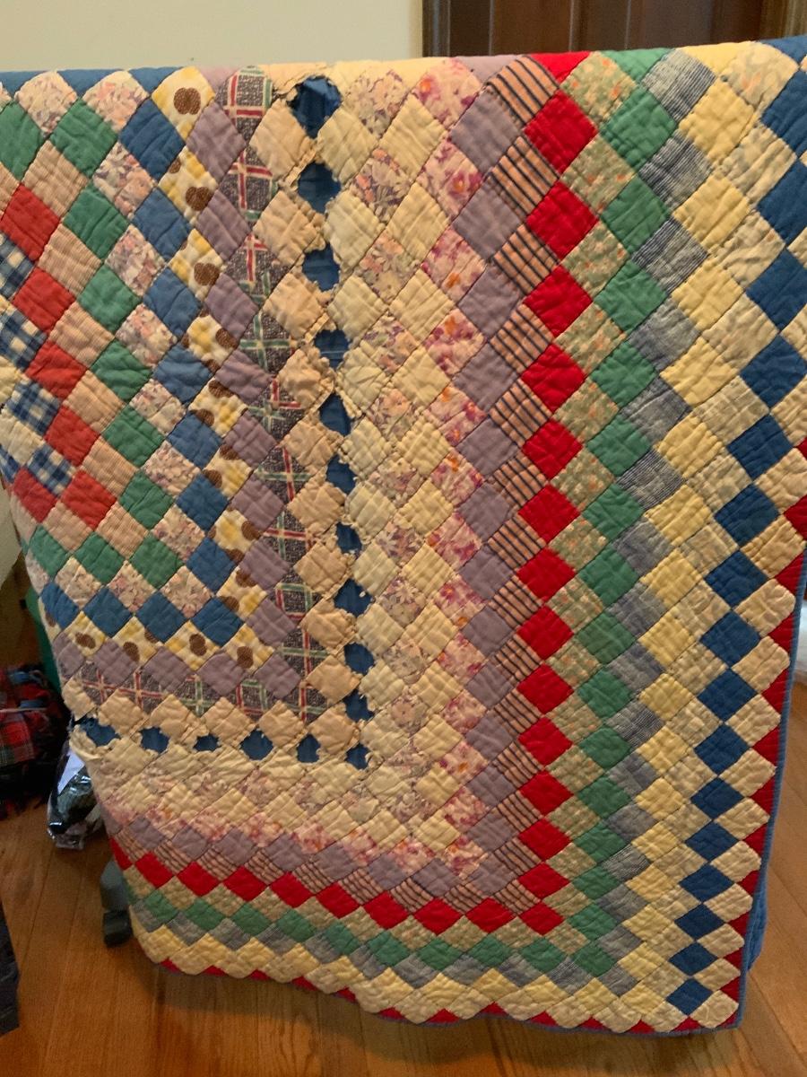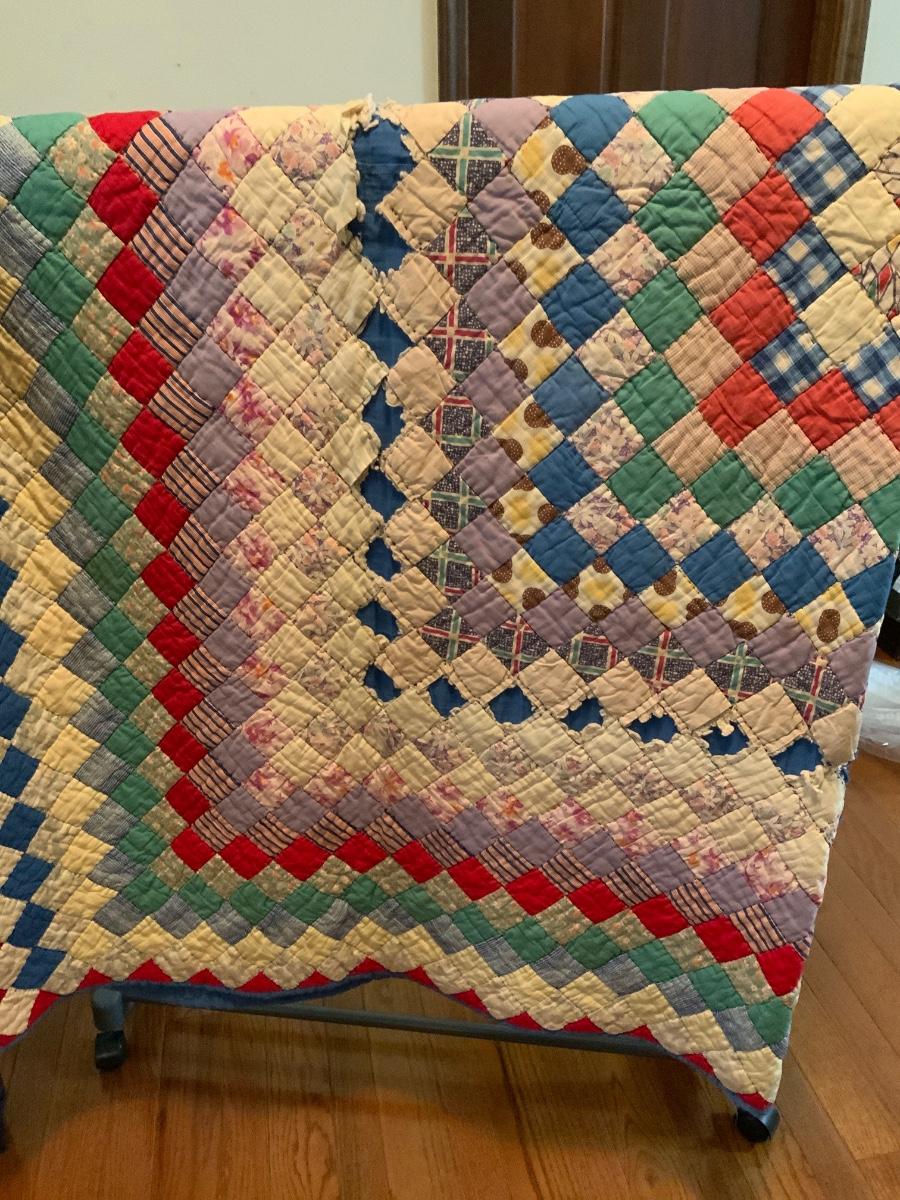 this vintage trip around the world quilt measures approximately 62” x 62”. this quilt would make a good cutters quilt as there are many missing pieces, tears, stains.
