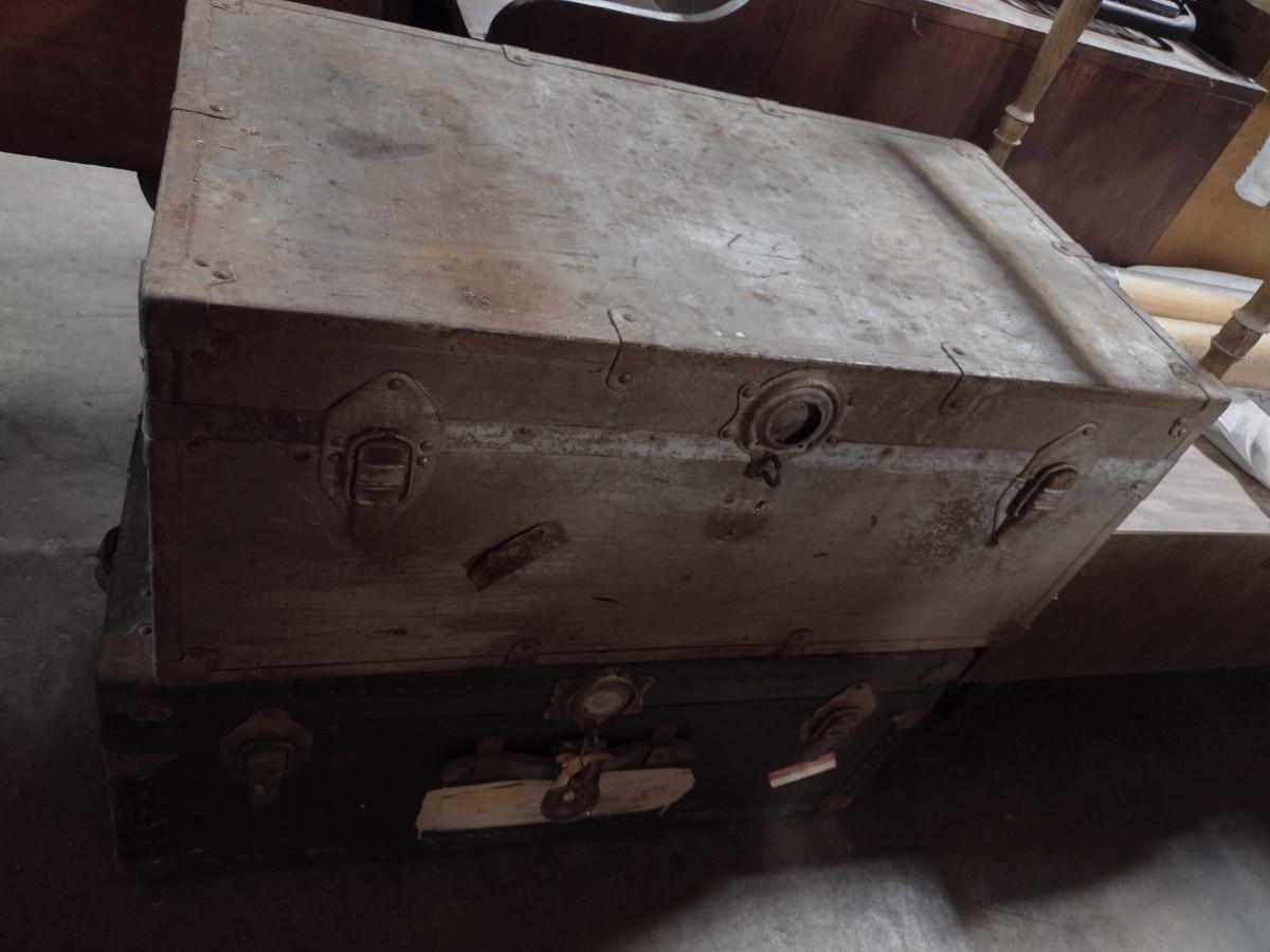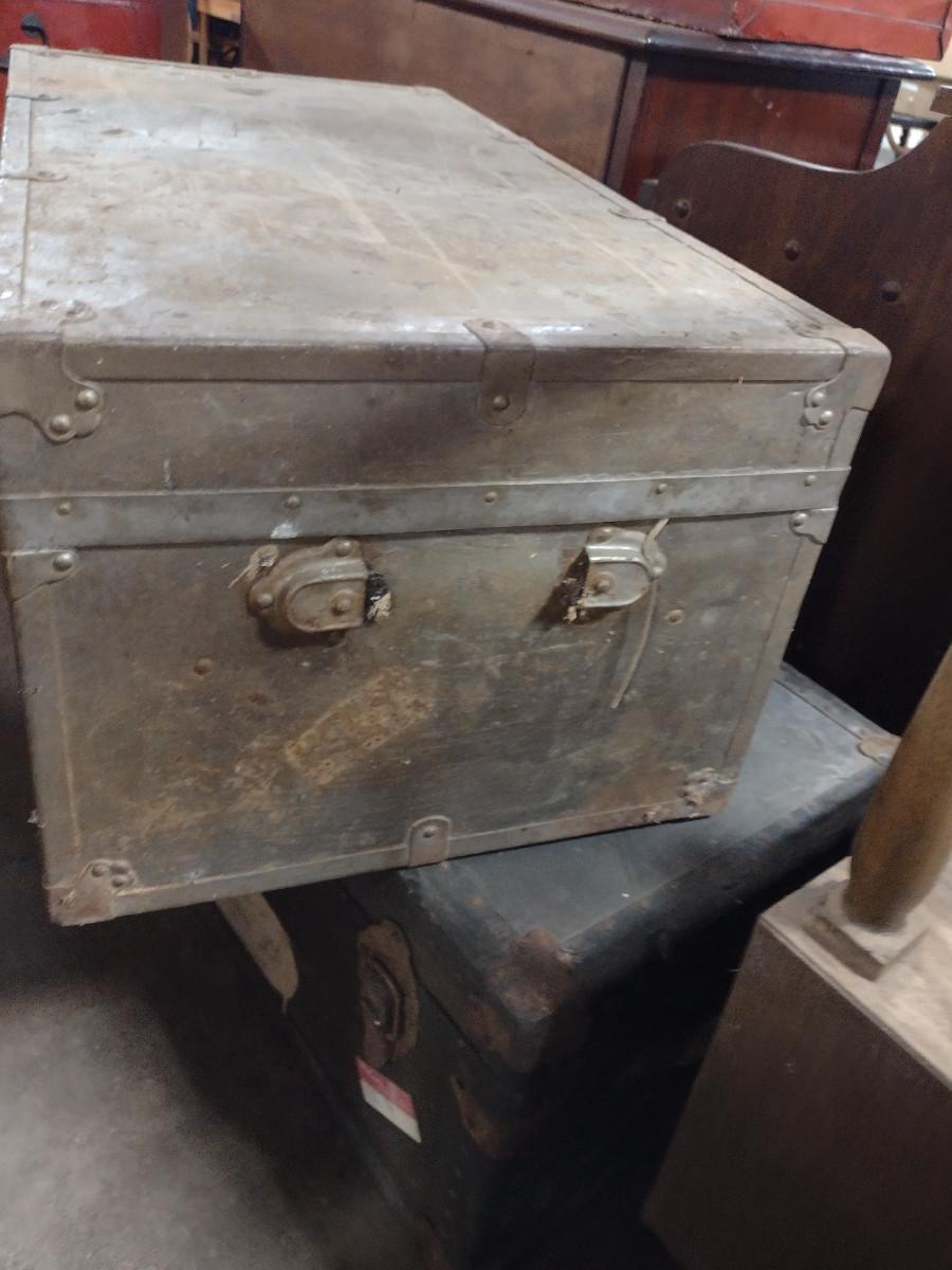 Vintage Trunk. Item is light colored top trunk in picture #1. Missing handles on sides.