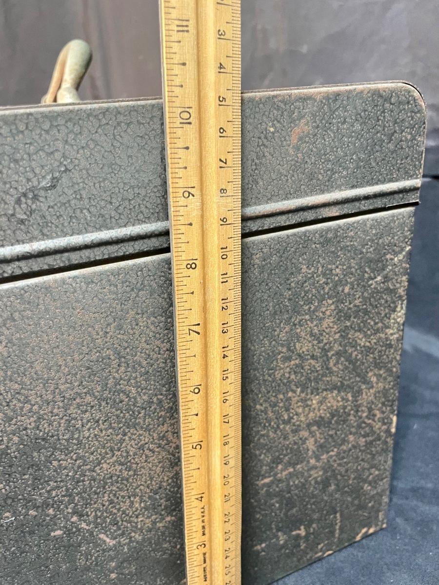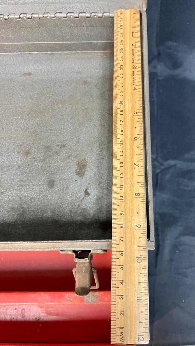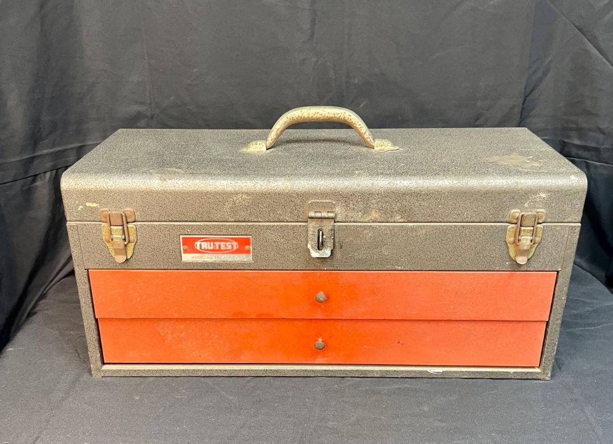 Vintage Tru-Test Steel Tool Box with 2 Drawers. Model 902 TT. Approx. size; 10" tall, 9.5" front-to-back, 22" wide. Good used condition, very little surface rust. Box is true, no visible damage, but drawers do not pull out as smoothly as they should (may need to be lubricated).