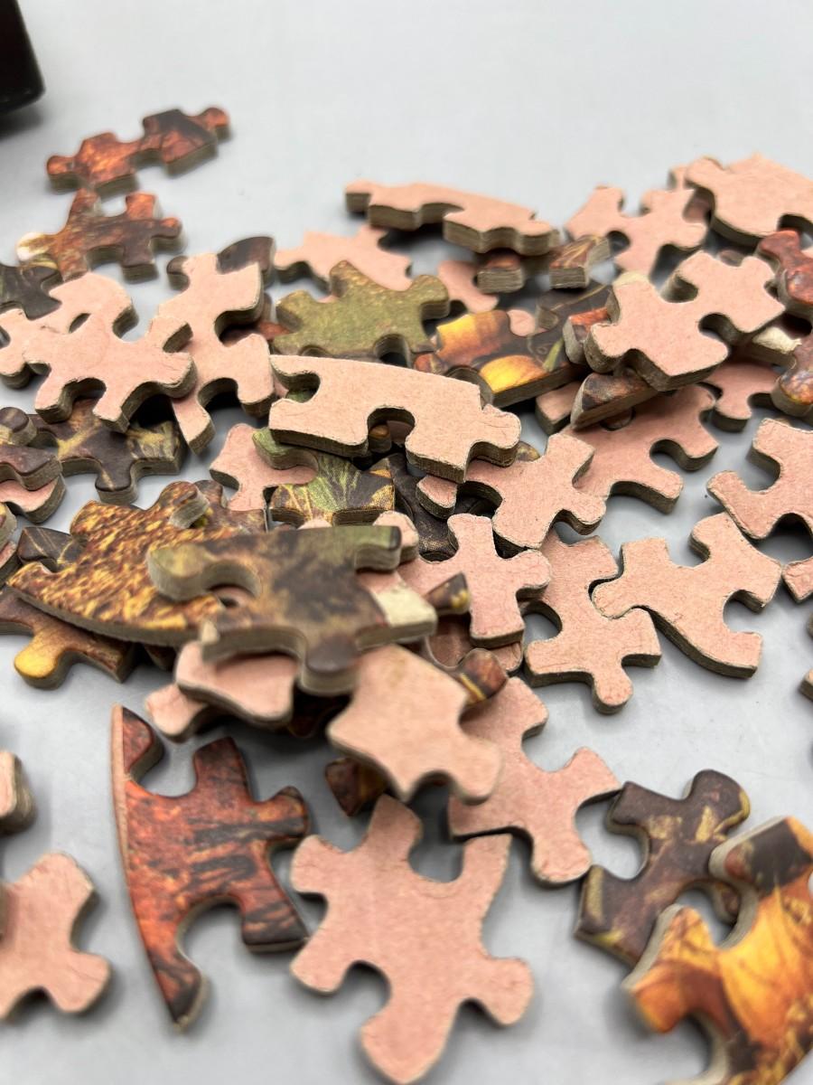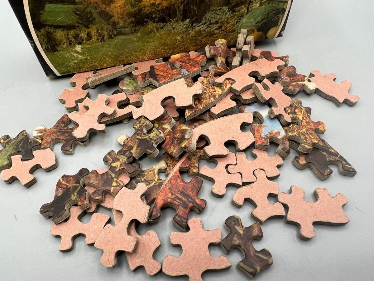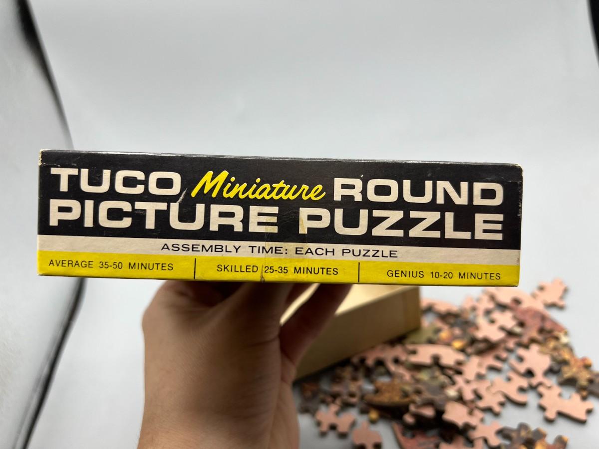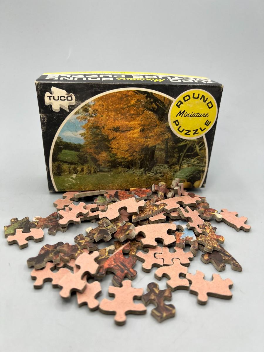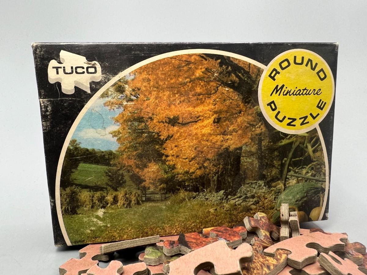 Vintage TUCO Round Miniature Puzzle Autumn Leaves Forest Landscape. Looks to be in good condition. Did not count pieces for completeness.