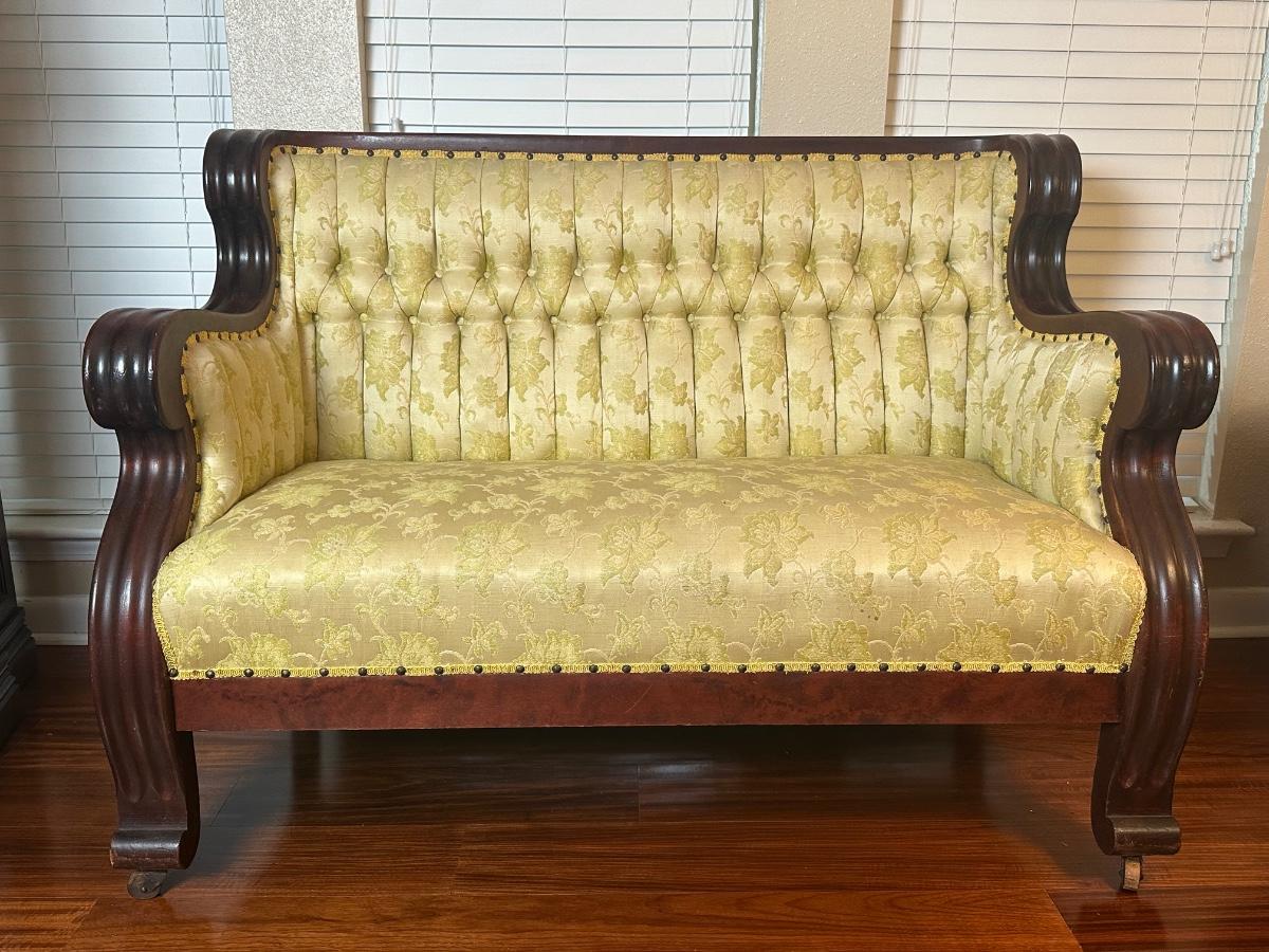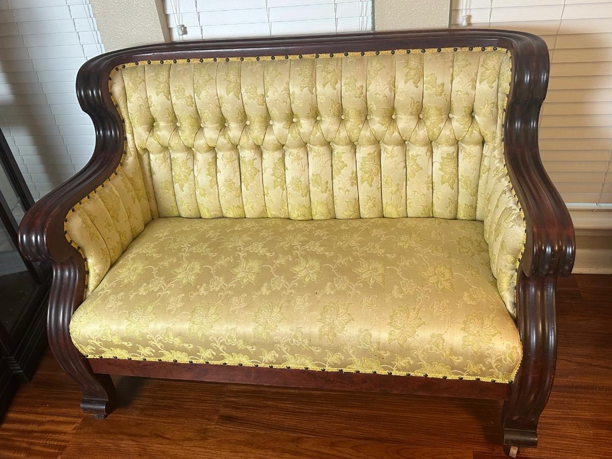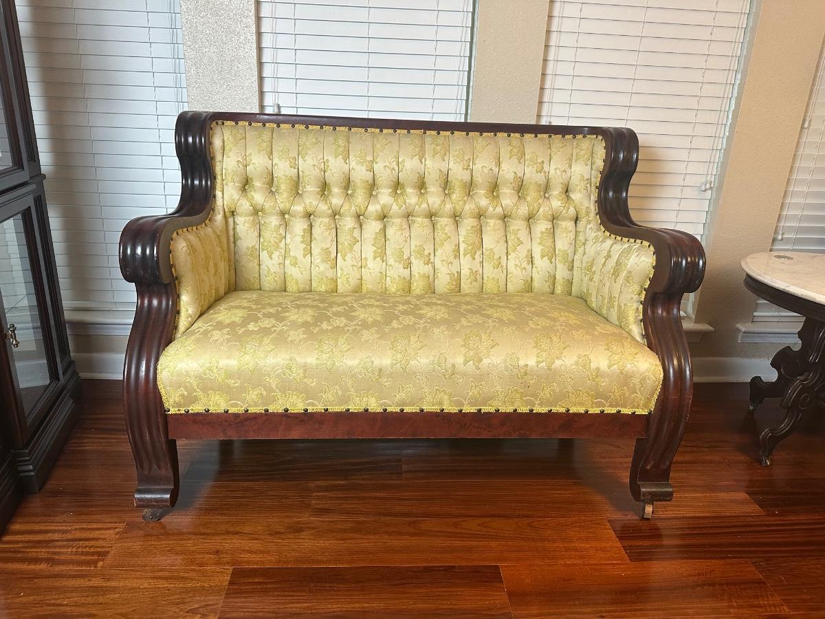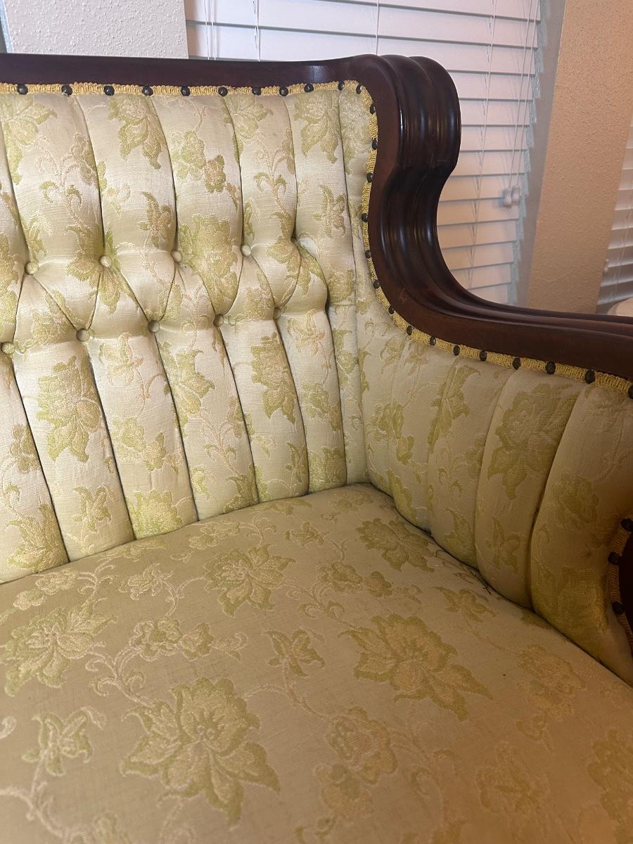 Vintage Tufted Settee / Loveseat with Carved Wood Arms