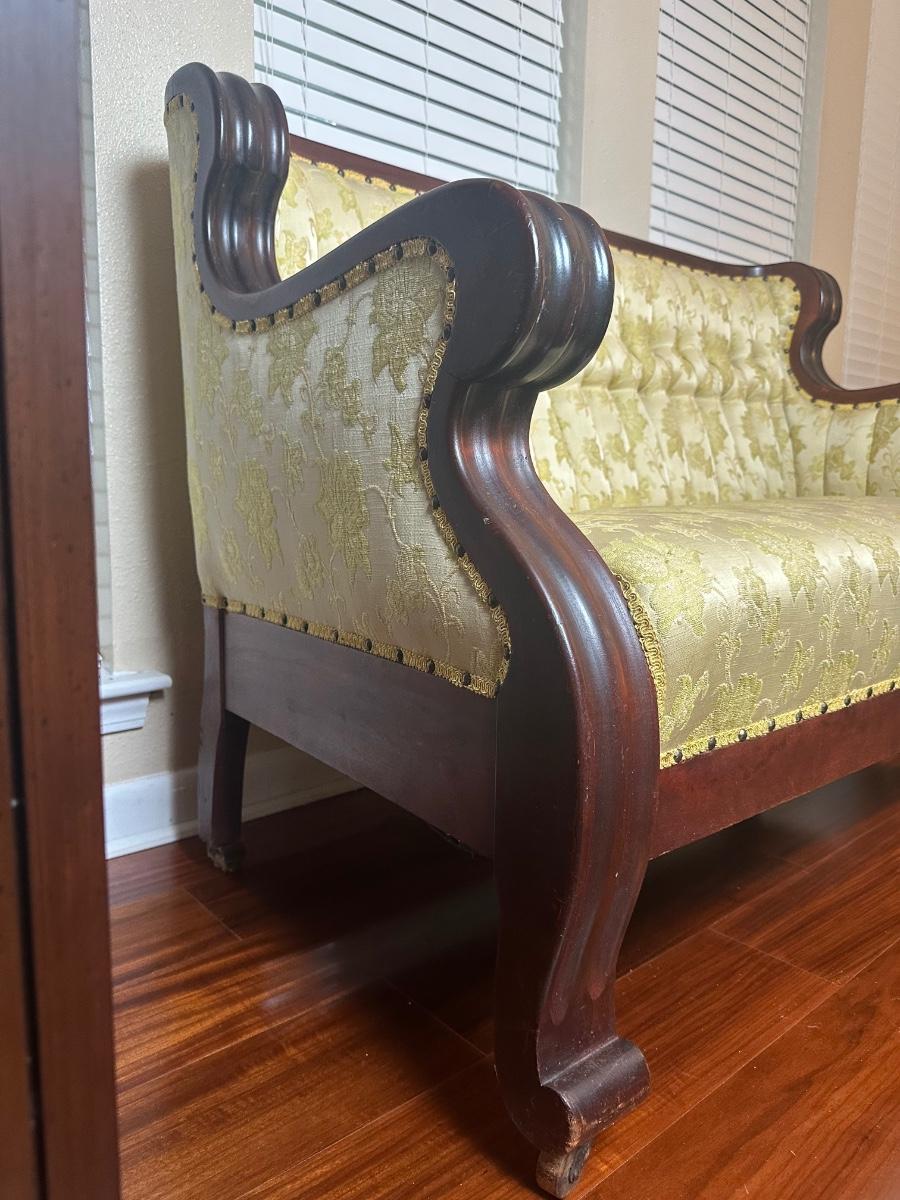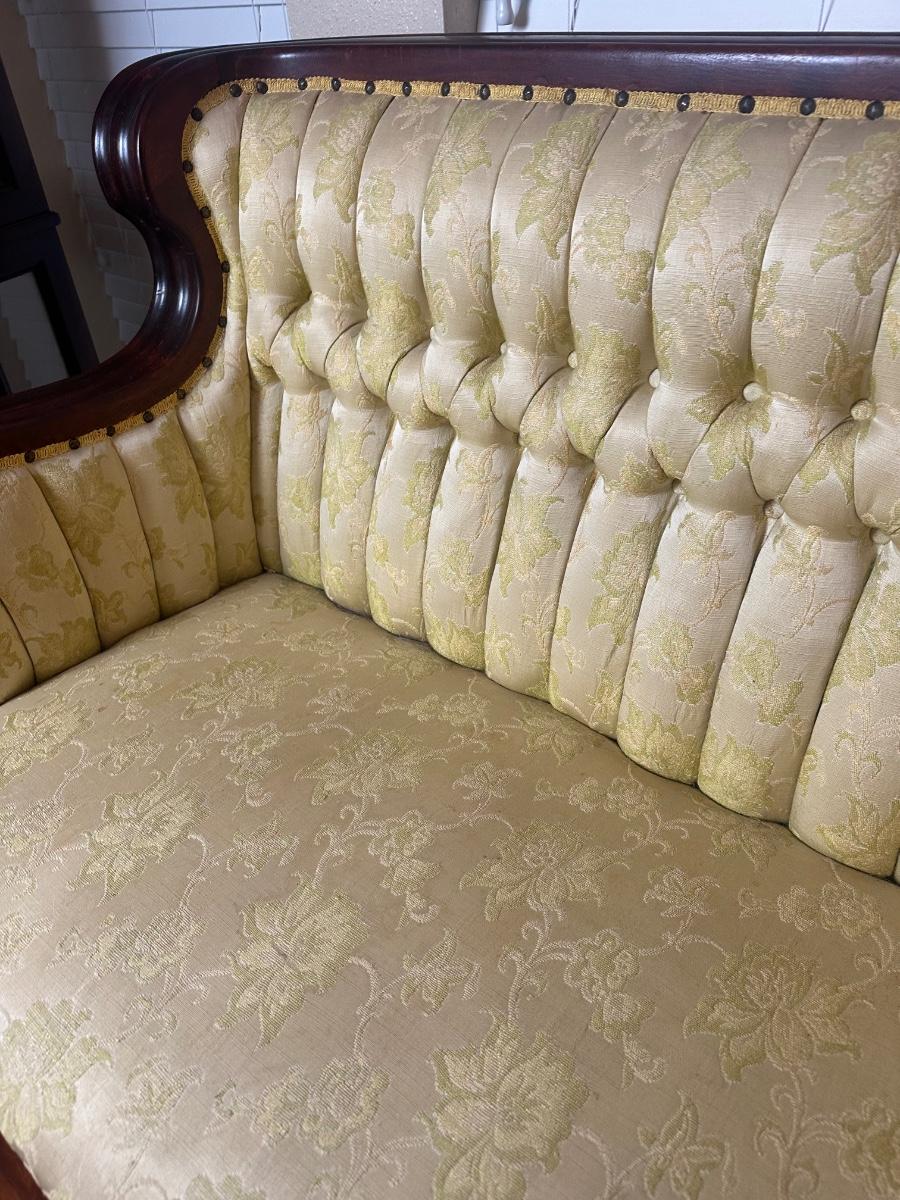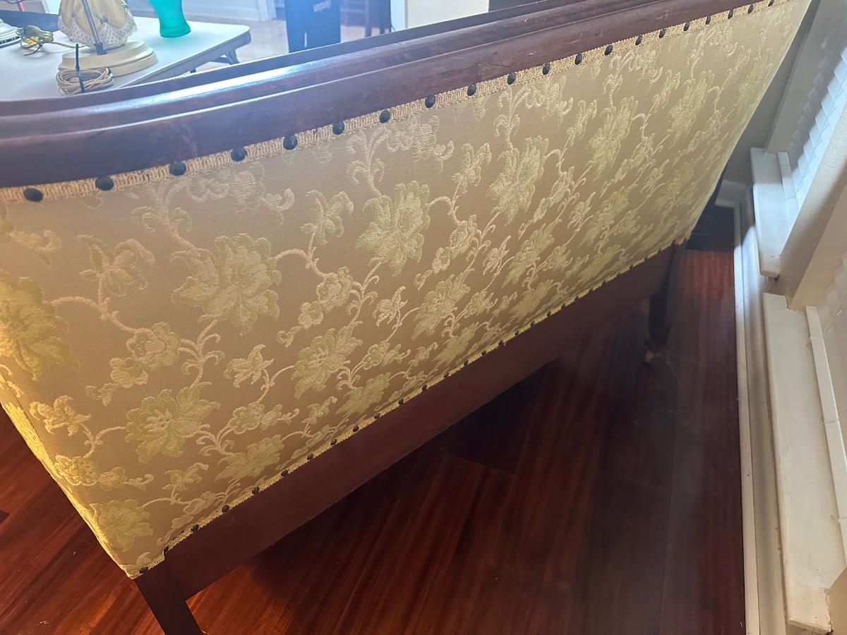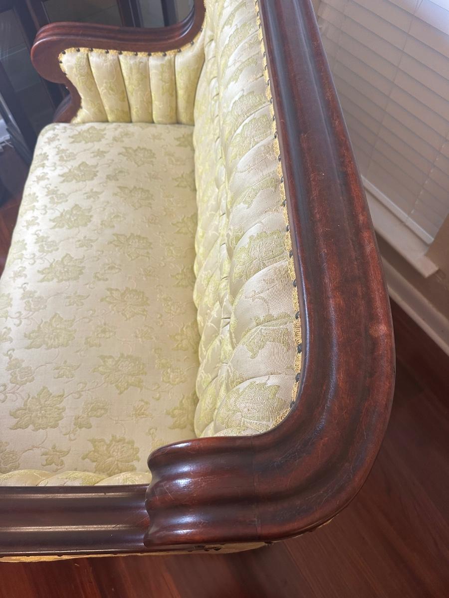 Vintage Tufted Settee / Loveseat with Carved Wood Arms