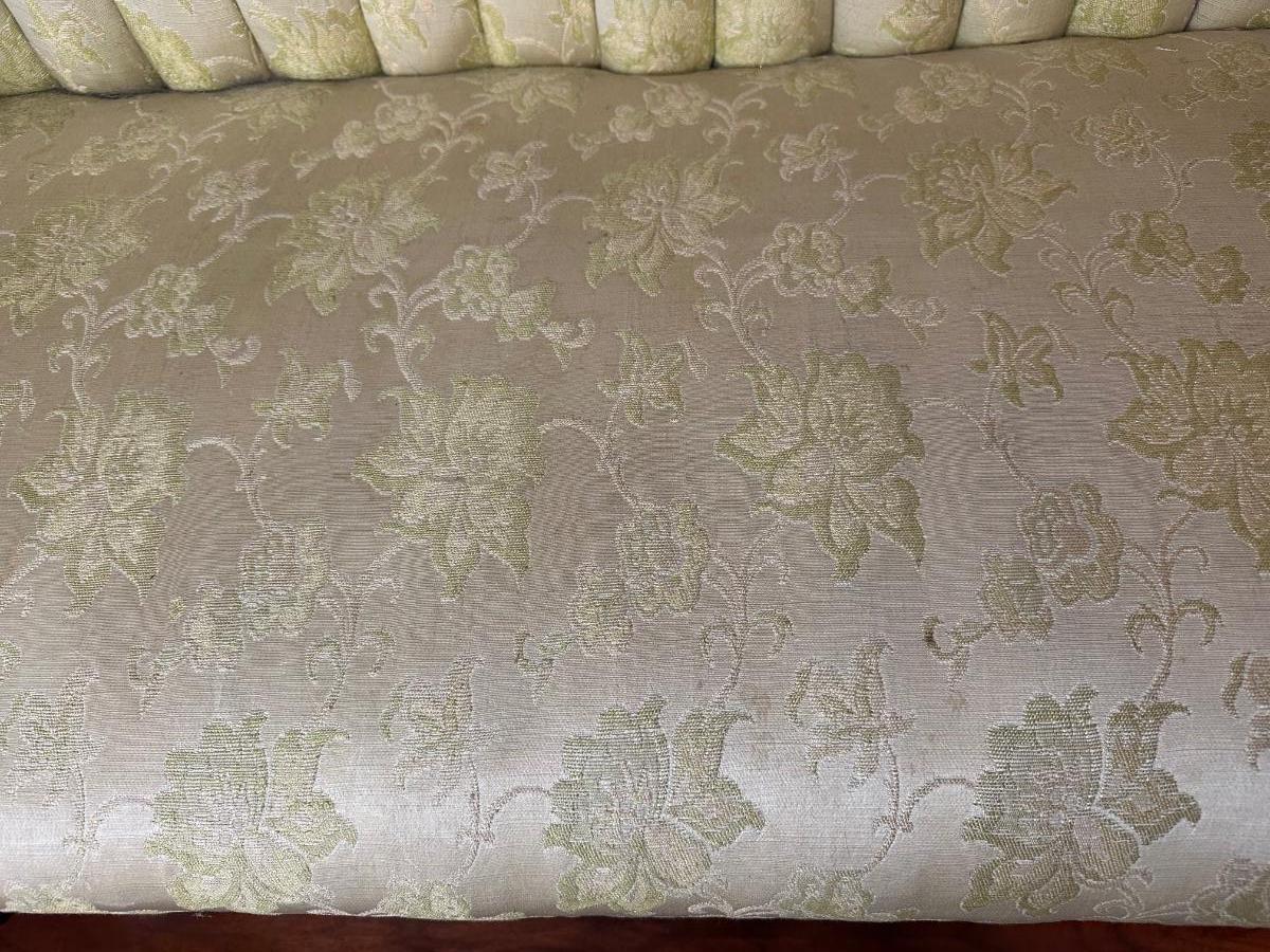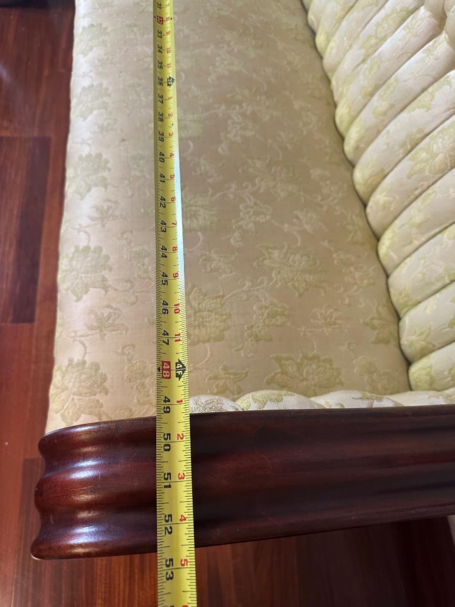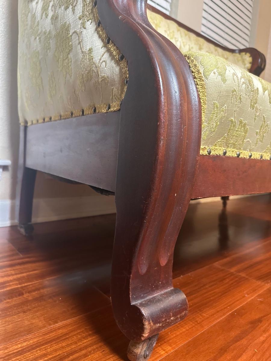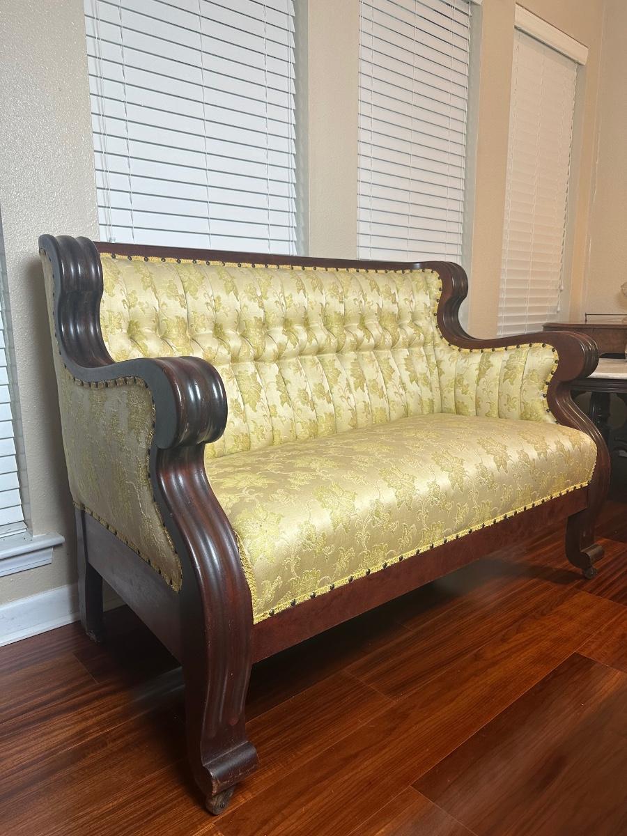 Vintage Tufted Settee / Loveseat with Carved Wood Arms