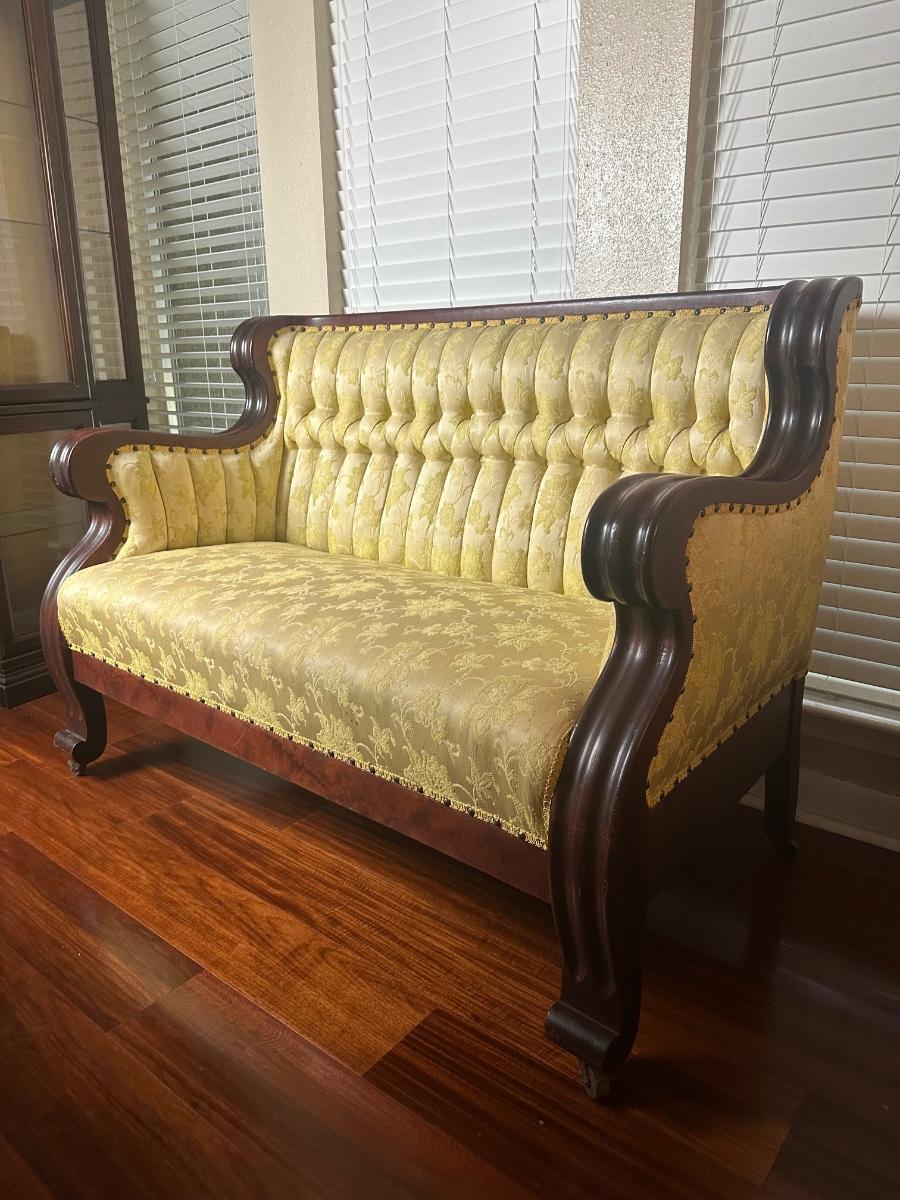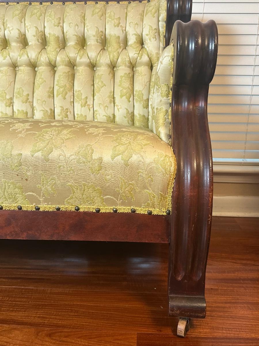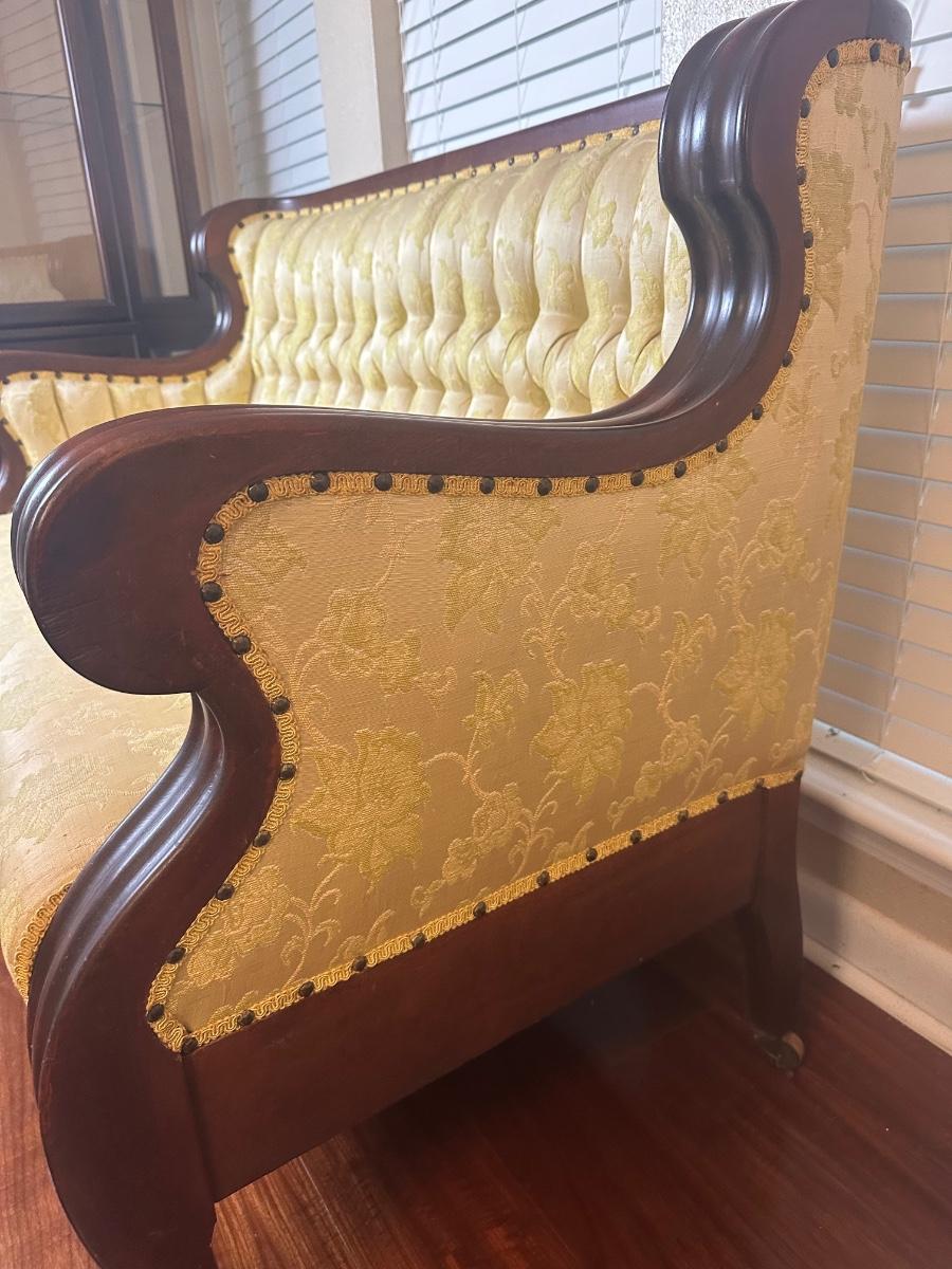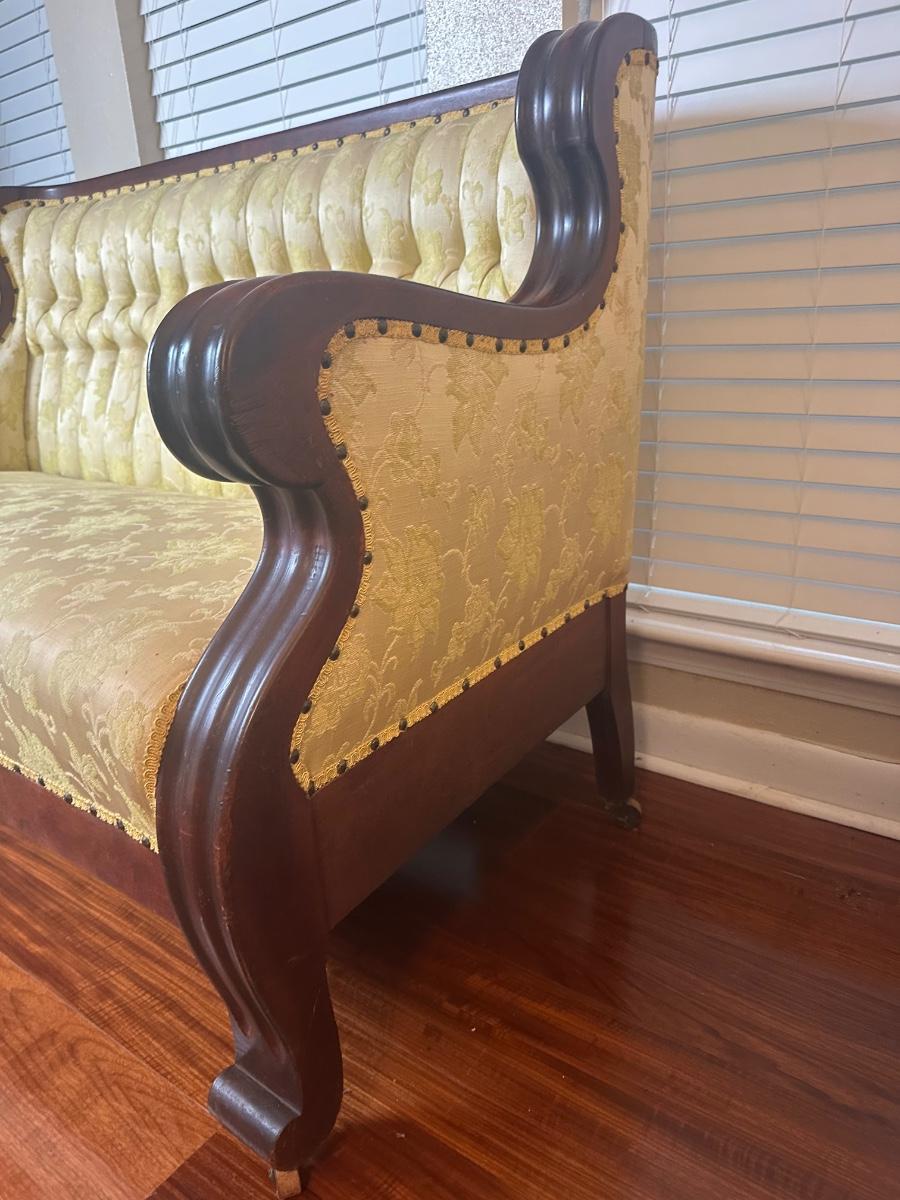 Vintage tufted settee with carved wood arms, yellow floral damask upholstery, nailhead trim, and front casters. Upholstery and wood show light wear consistent with age. Structurally solid.