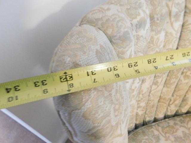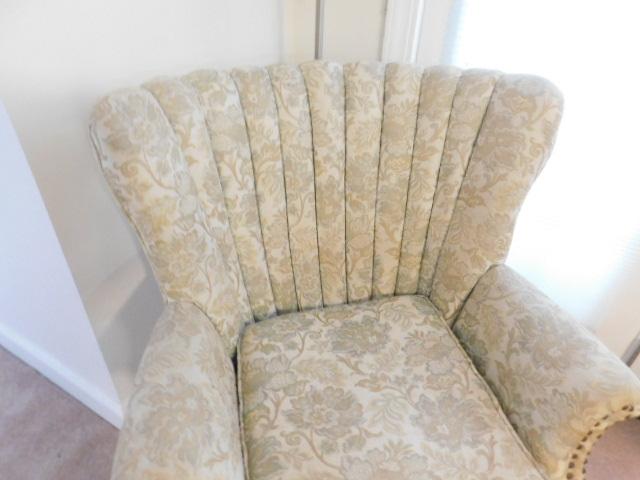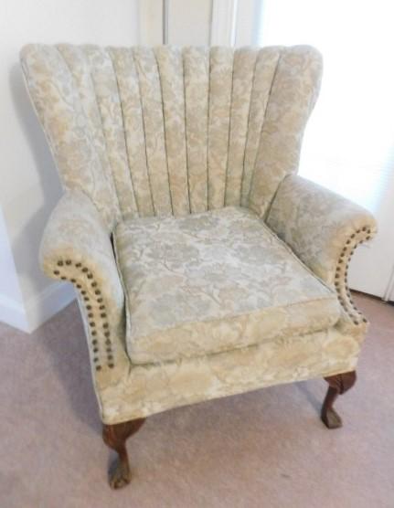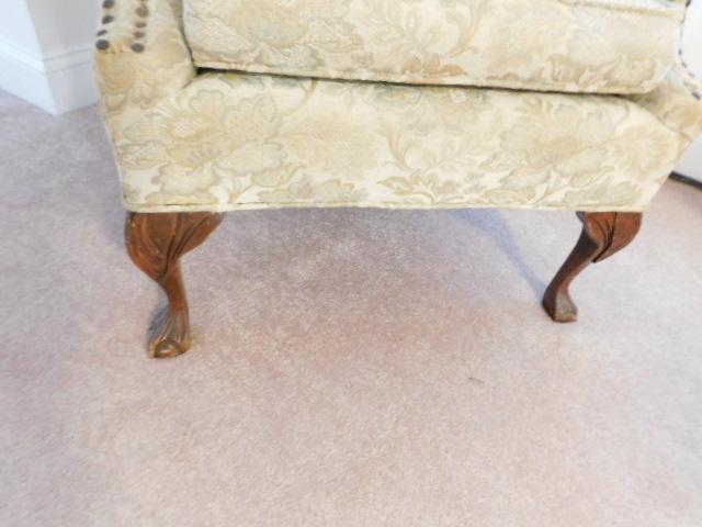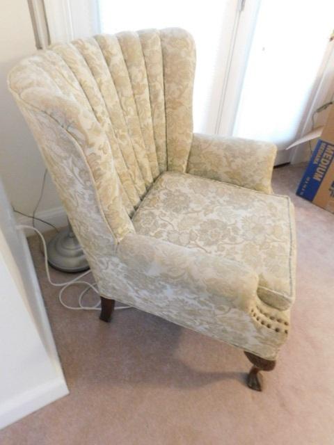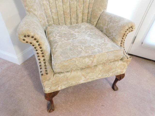 Vintage Tufted Wide Back Chair with Brass Tack Accents and Ball and Claw Feet this is a downstairs item