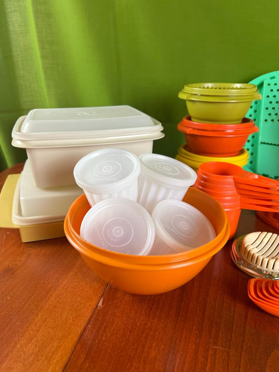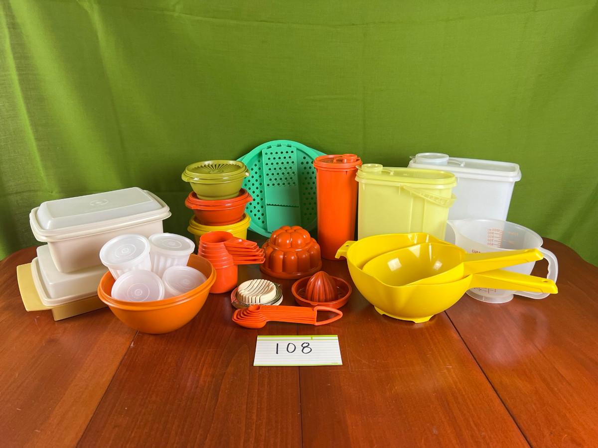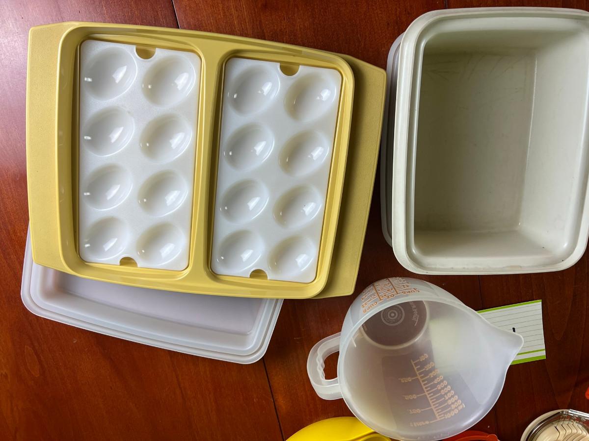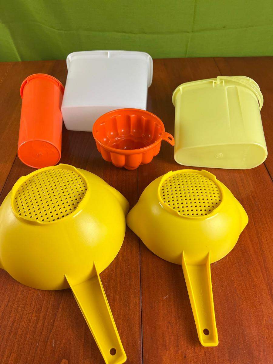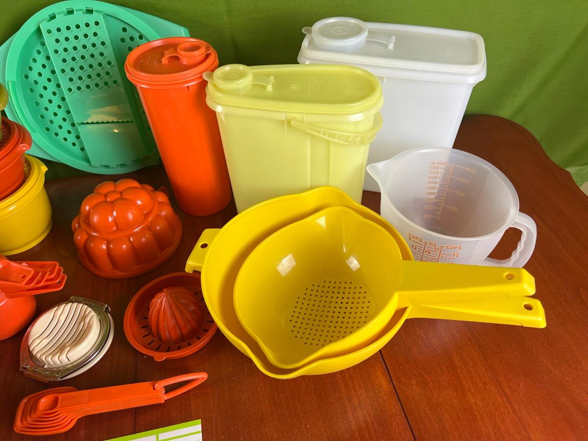Deviled egg carrier (holds 16 eggs), Pitcher with lid yellow, pitcher with lid white, colanders x2 yellow, tumbler with lid, 3 bowls with lids, 4 small jello molds, juicer, egg slicer, green grater bowl and more.