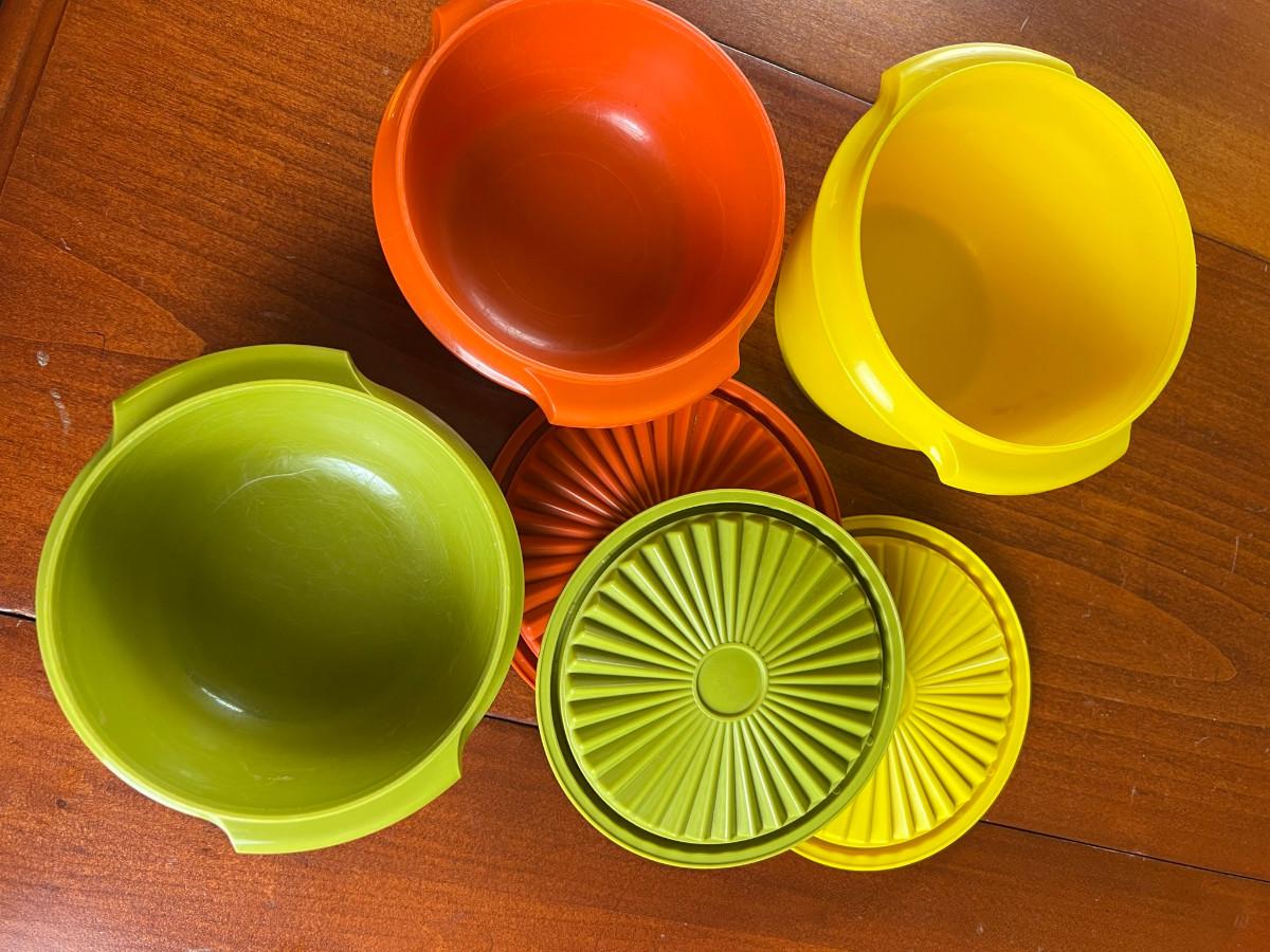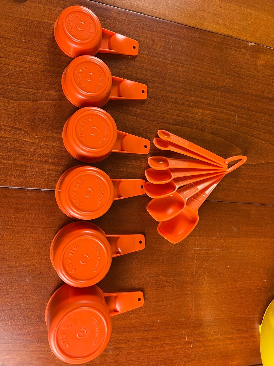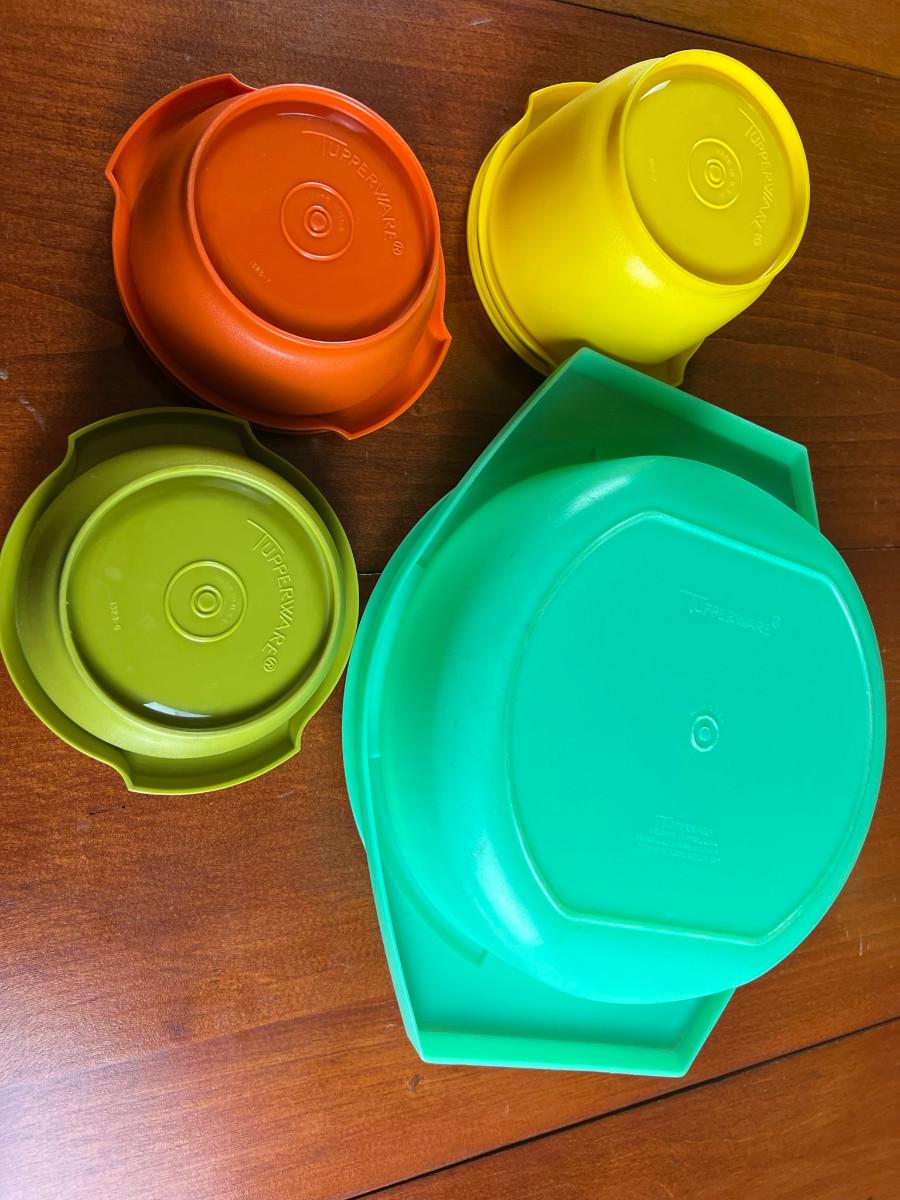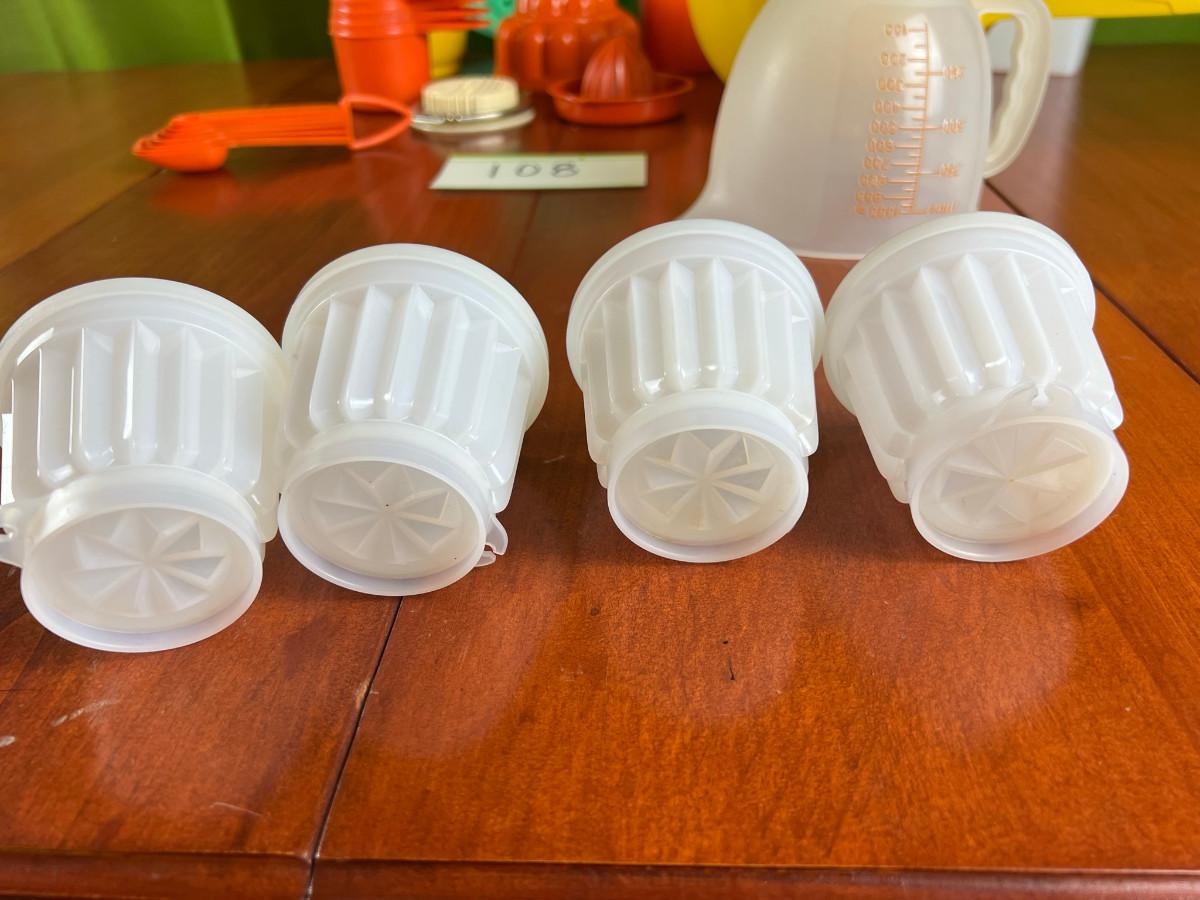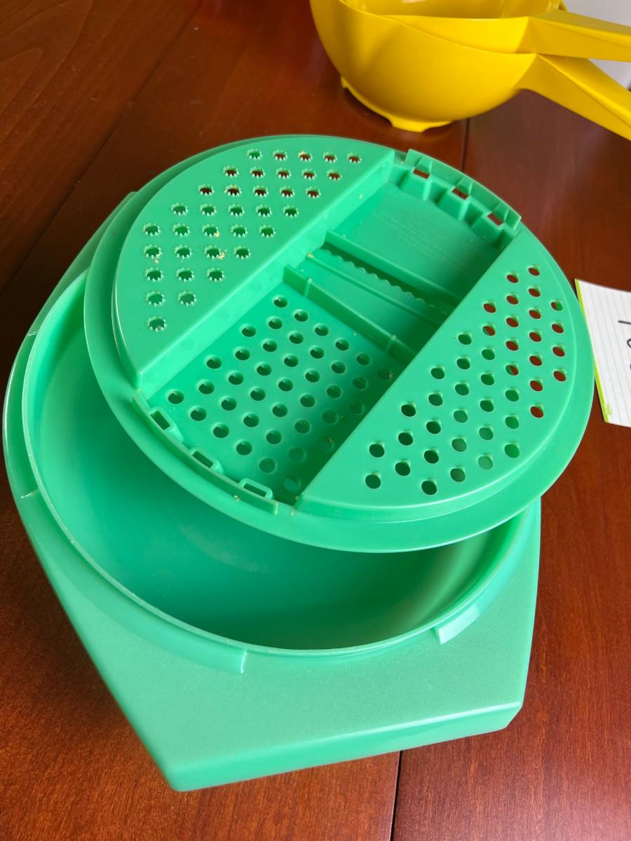 Deviled egg carrier (holds 16 eggs), Pitcher with lid yellow, pitcher with lid white, colanders x2 yellow, tumbler with lid, 3 bowls with lids, 4 small jello molds, juicer, egg slicer, green grater bowl and more.