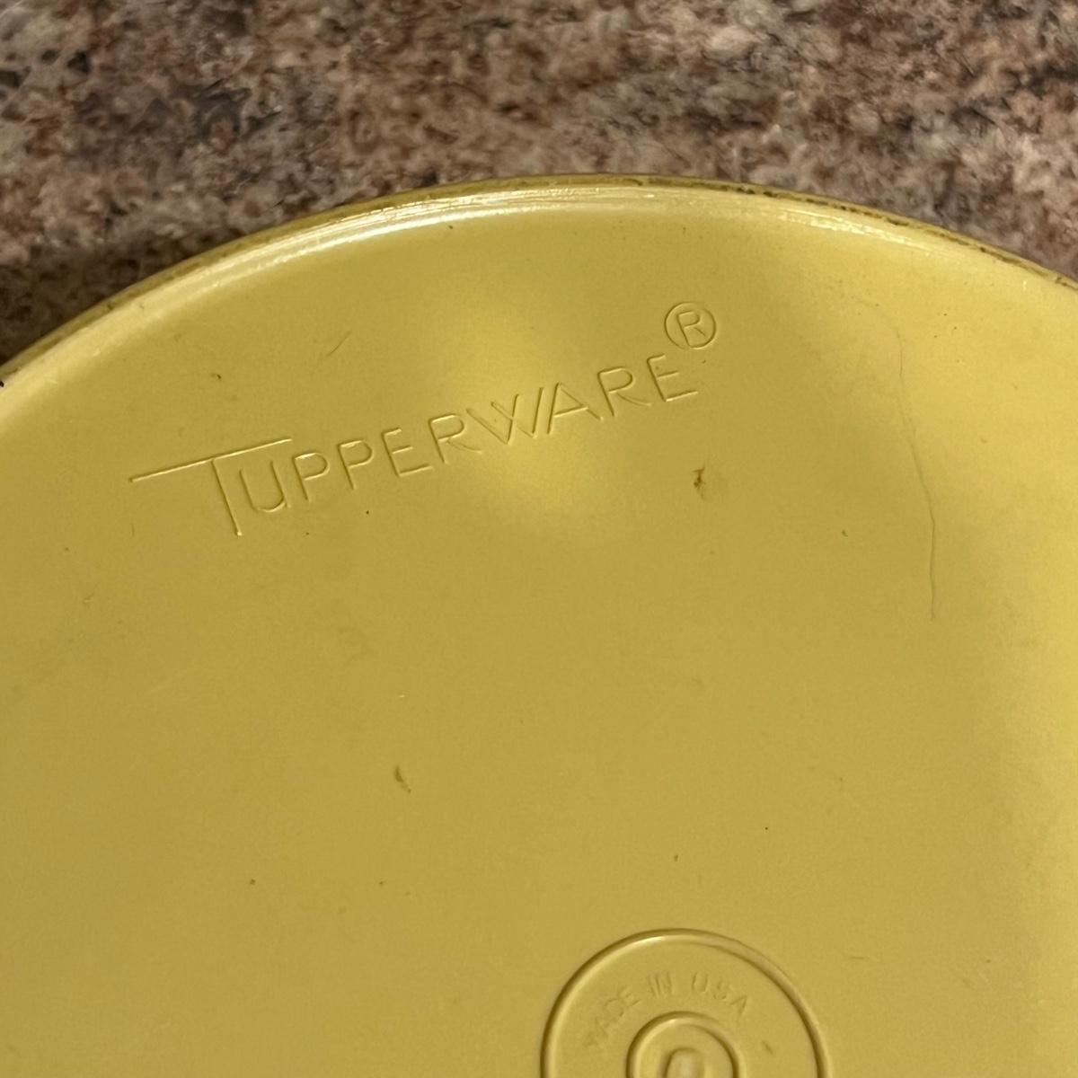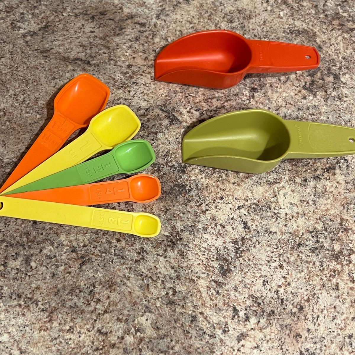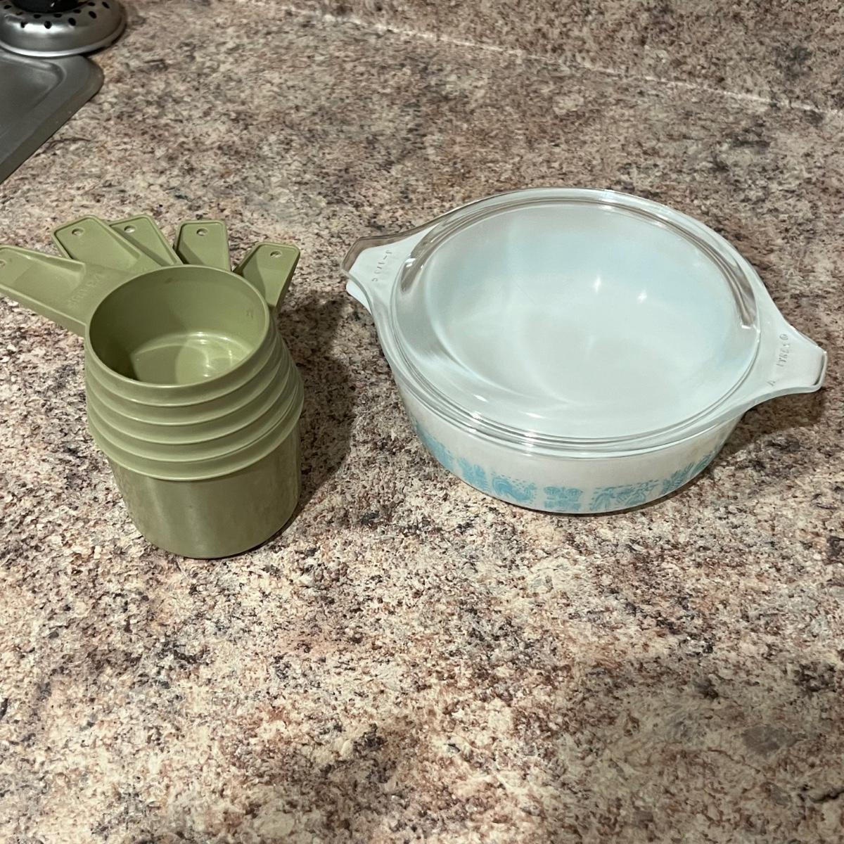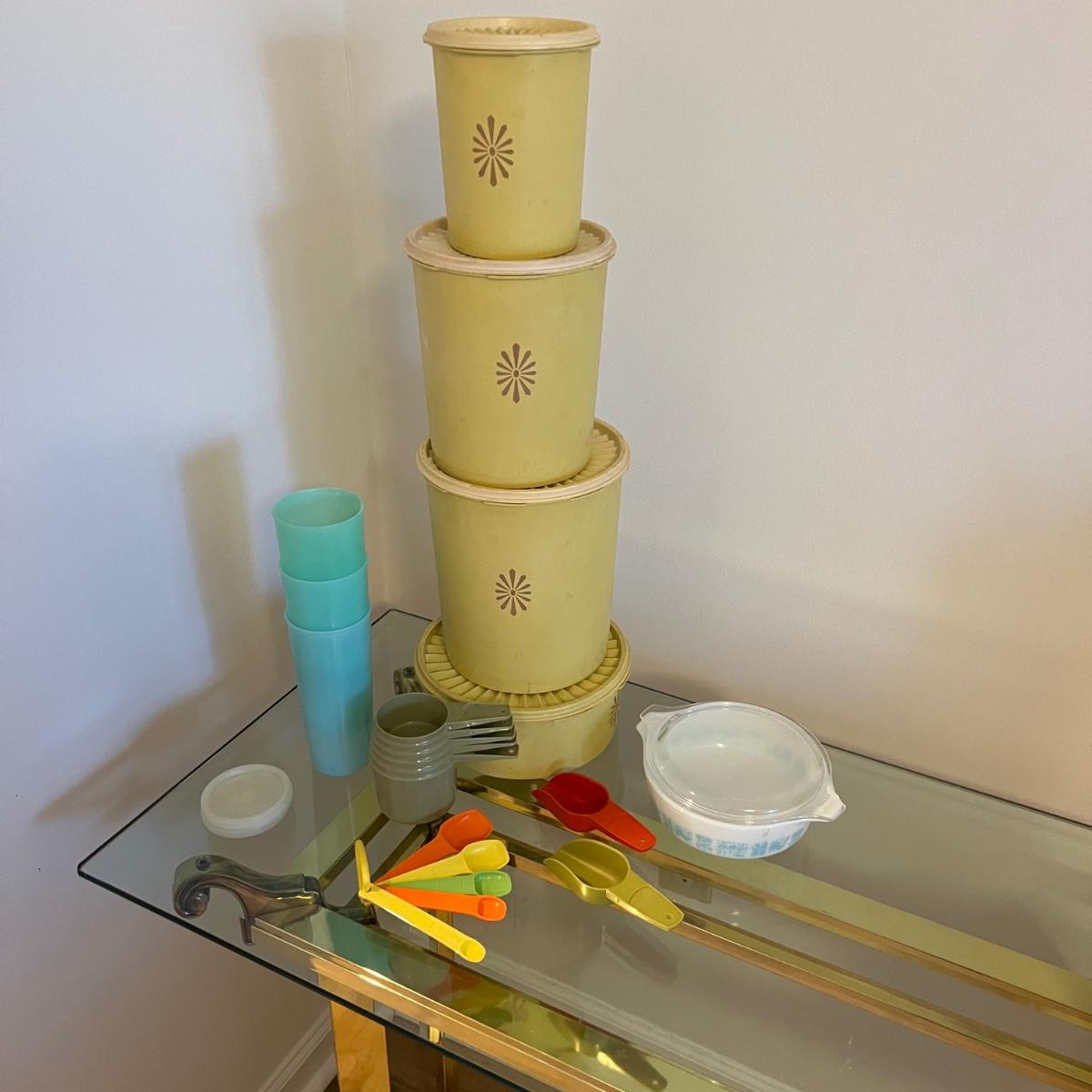 An assortment of vintage Tupperware, measuring spools, measuring cups, cups with lids, scoops and a Pyrex dish. The tallest Tupperware is 7.25”D x 8.25”H.