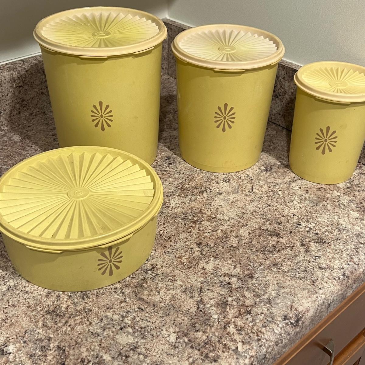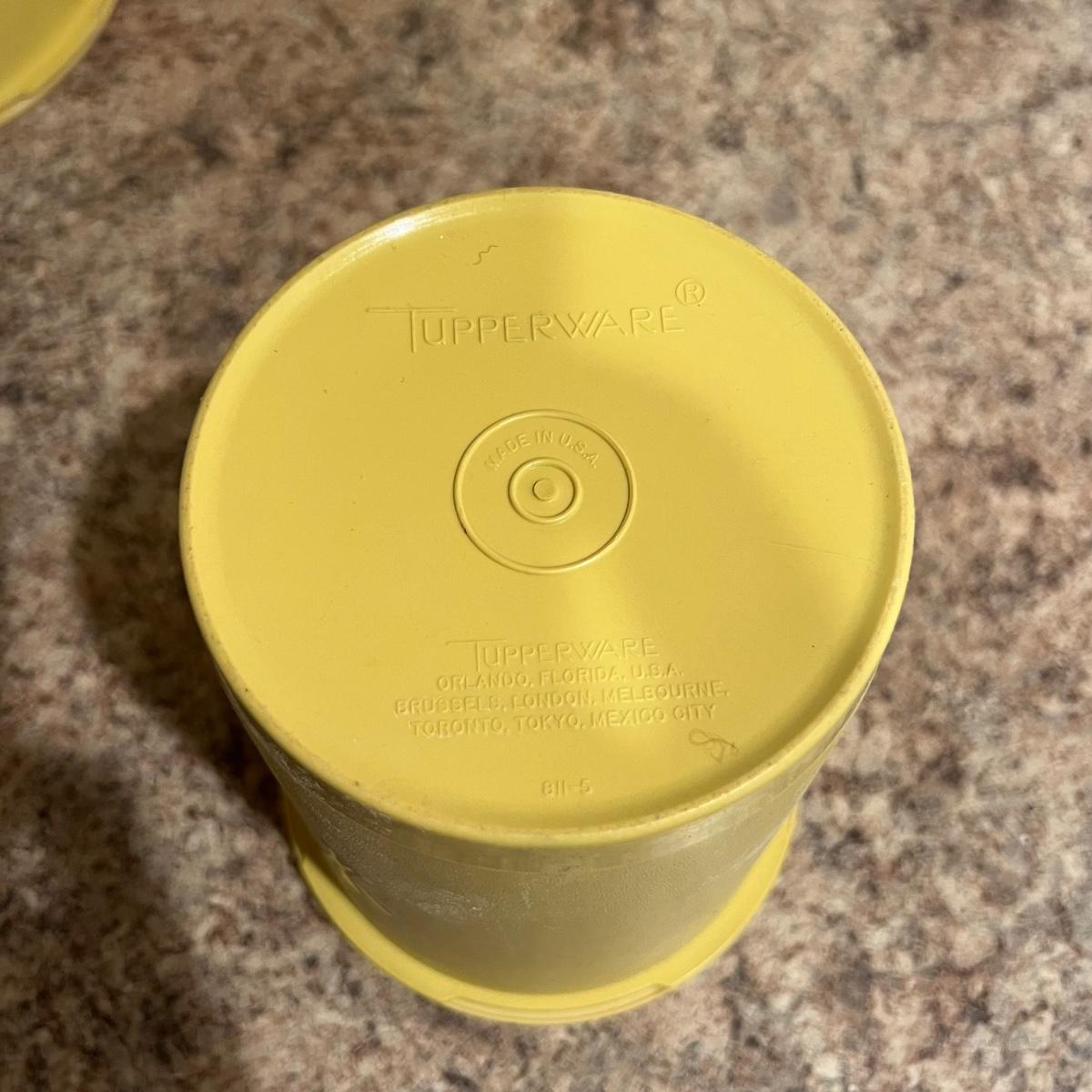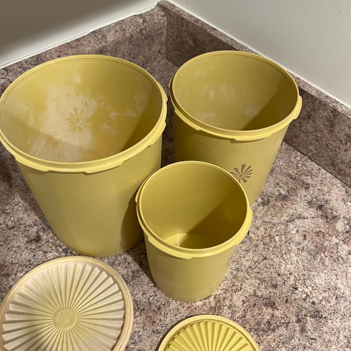 An assortment of vintage Tupperware, measuring spools, measuring cups, cups with lids, scoops and a Pyrex dish. The tallest Tupperware is 7.25”D x 8.25”H.