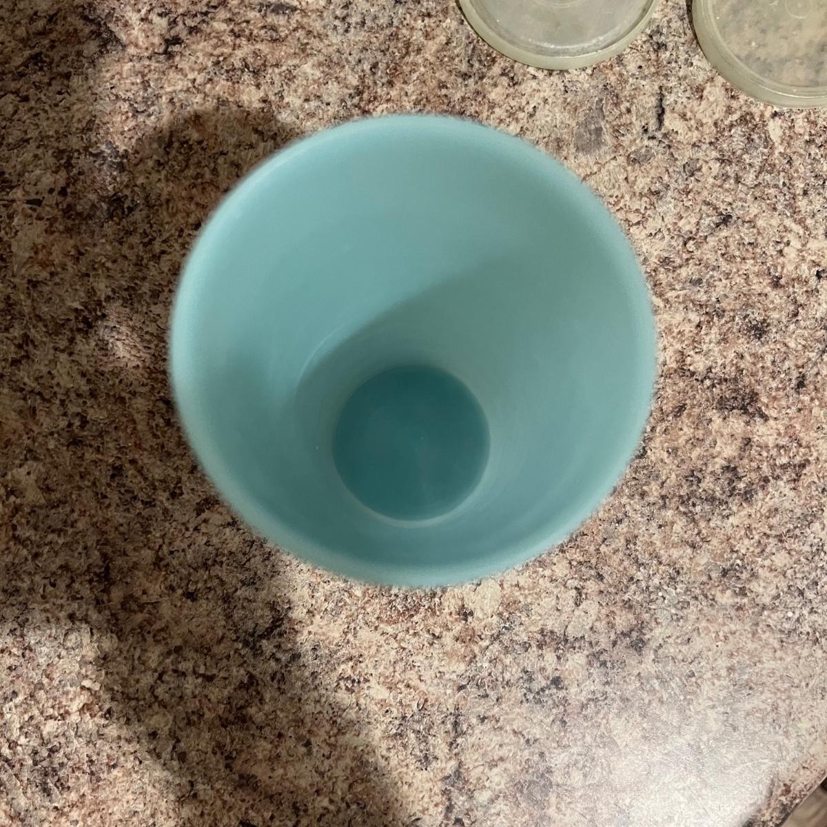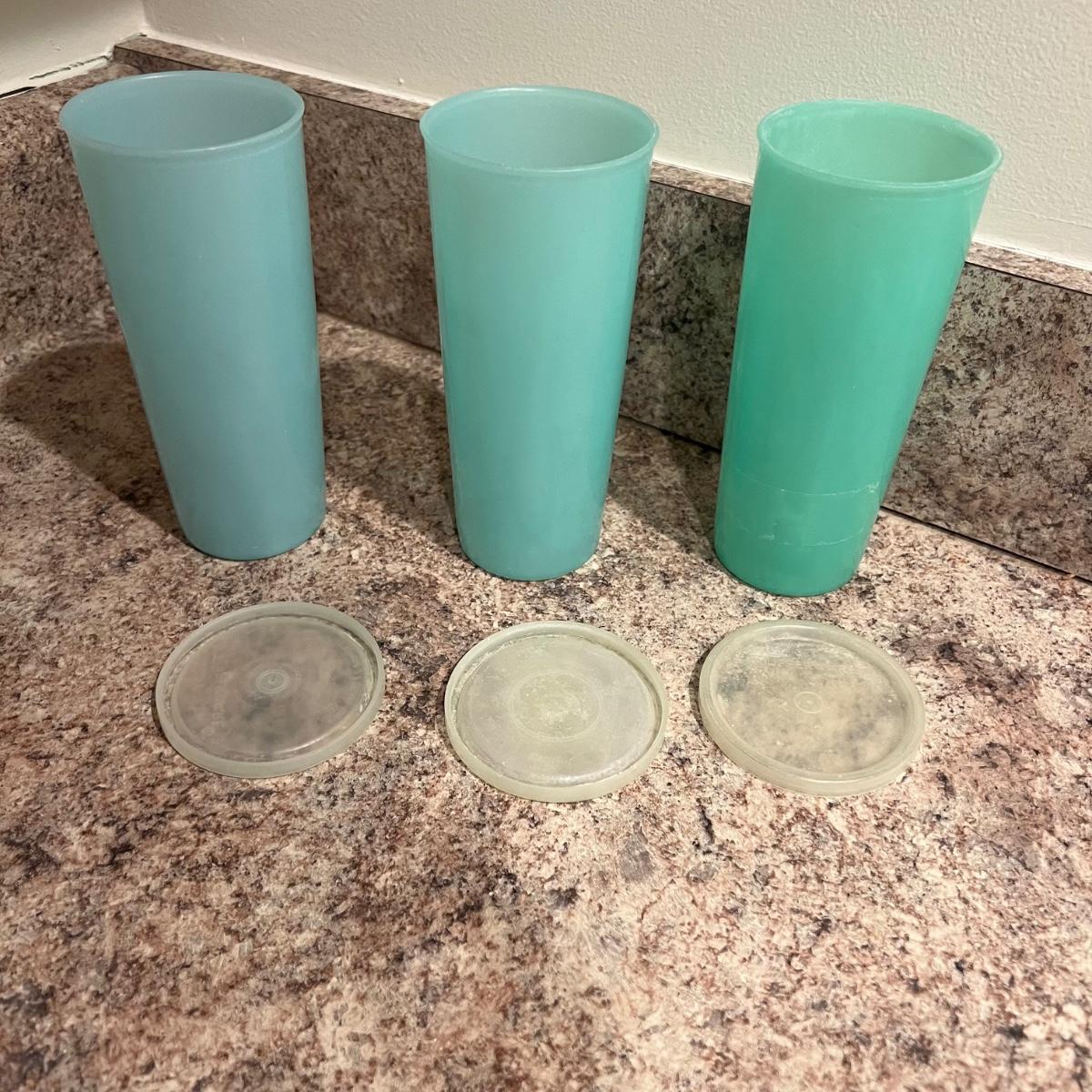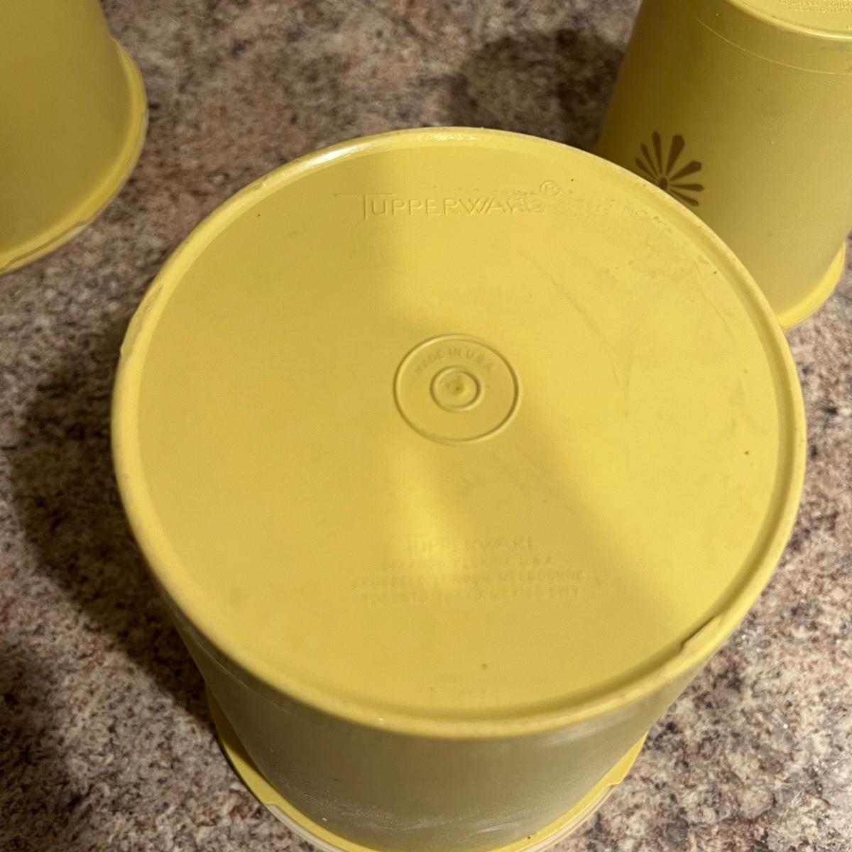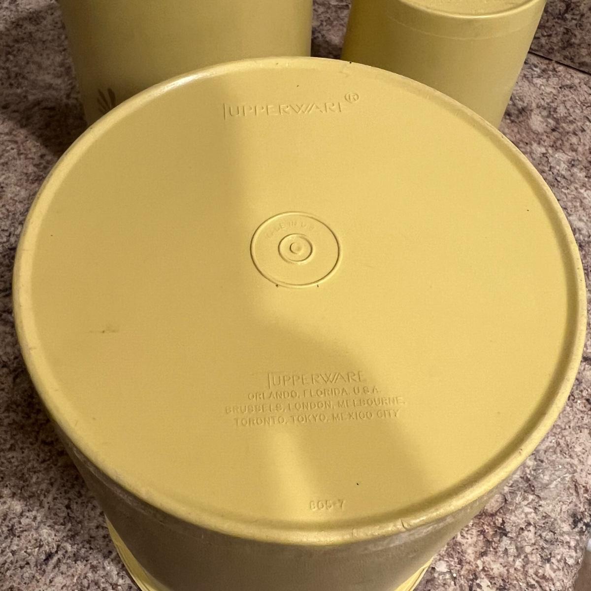 An assortment of vintage Tupperware, measuring spools, measuring cups, cups with lids, scoops and a Pyrex dish. The tallest Tupperware is 7.25”D x 8.25”H.