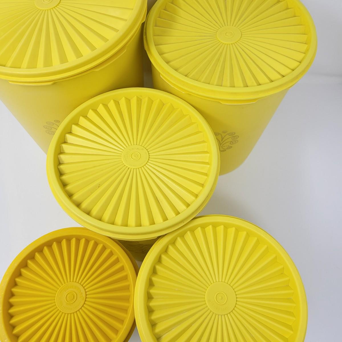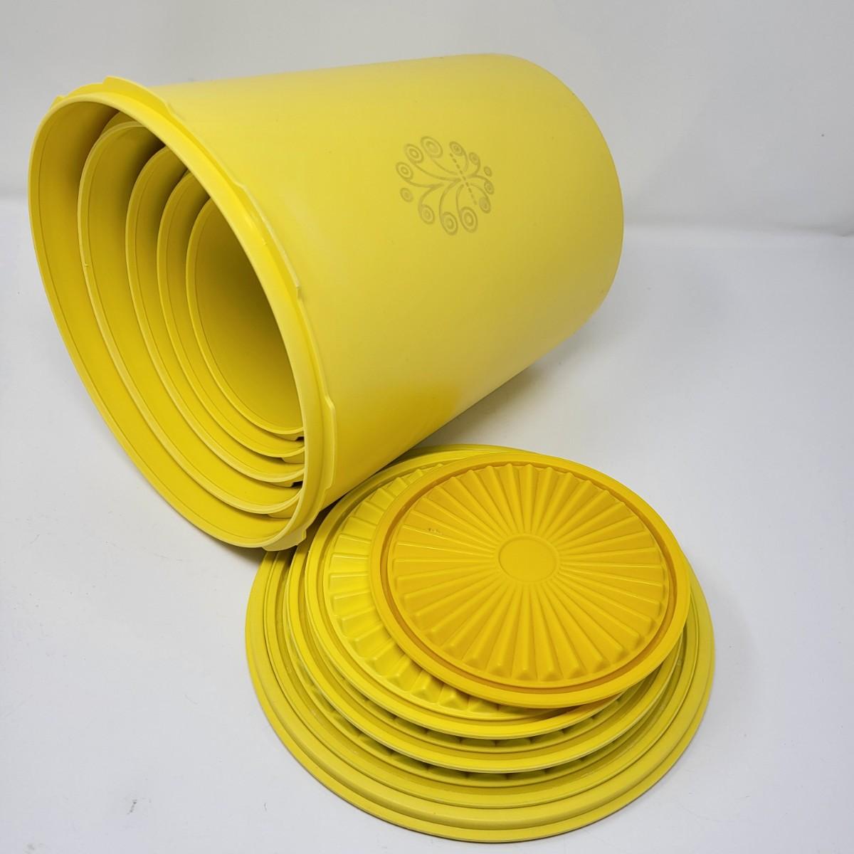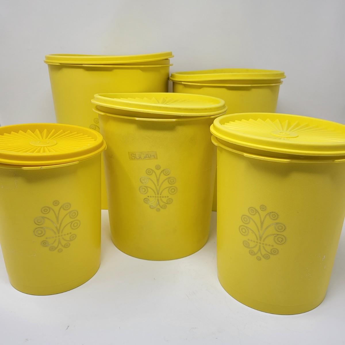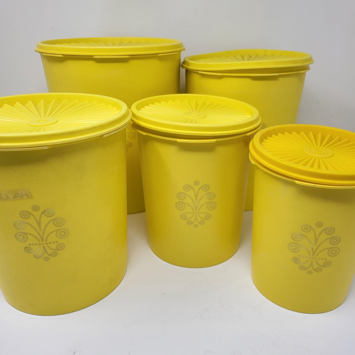 Set of five vintage yellow Tpperware brand plastic canisters. Smallest is 6" and ranges up to the largest at 9.5" tall. All have lids. Included is various lidded bowls, mugs (some with lids) and green lidded canister single.
