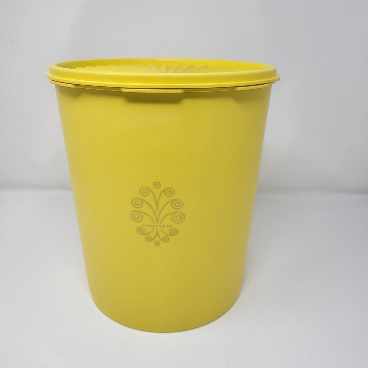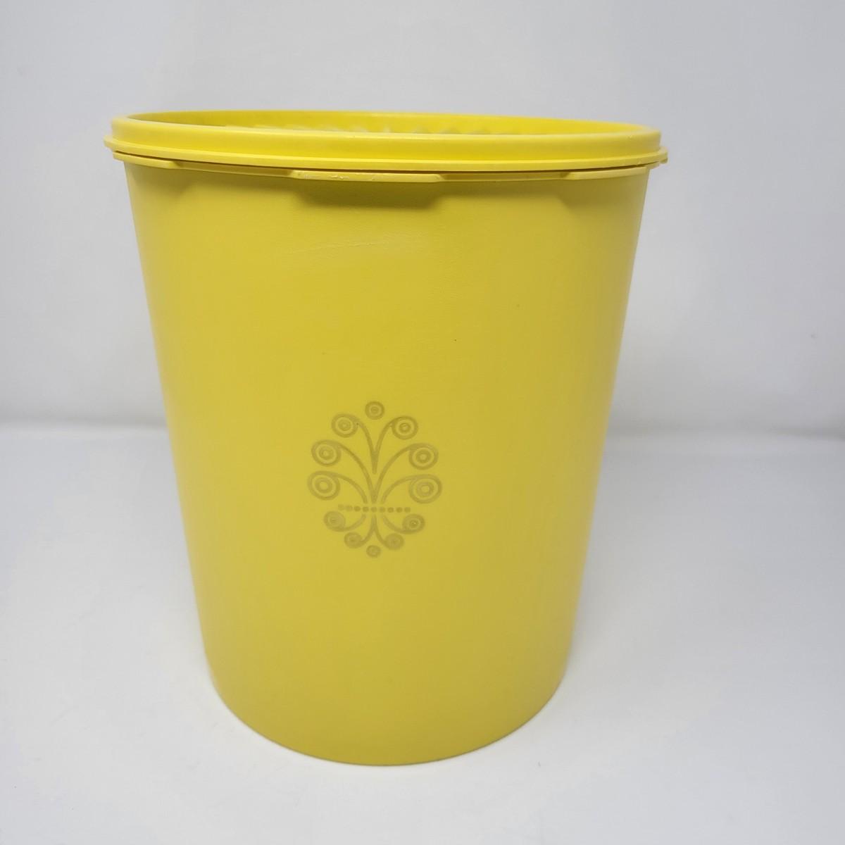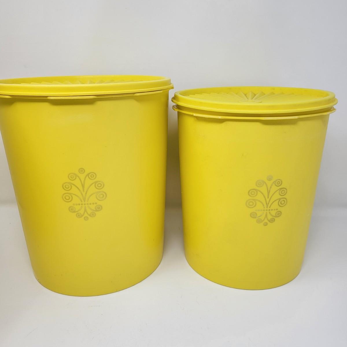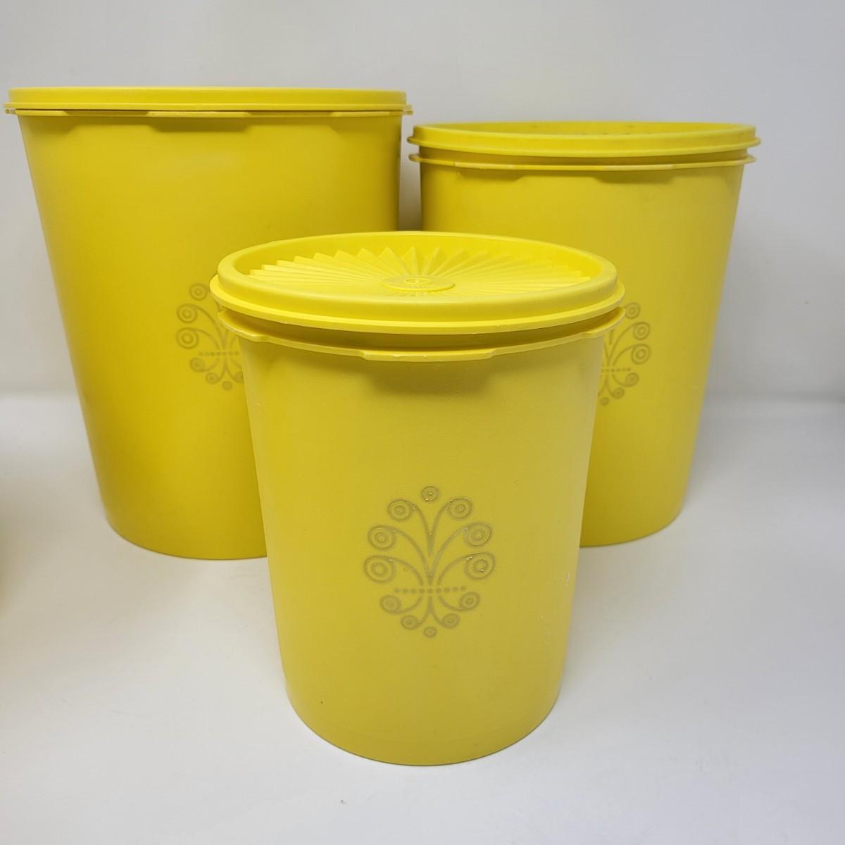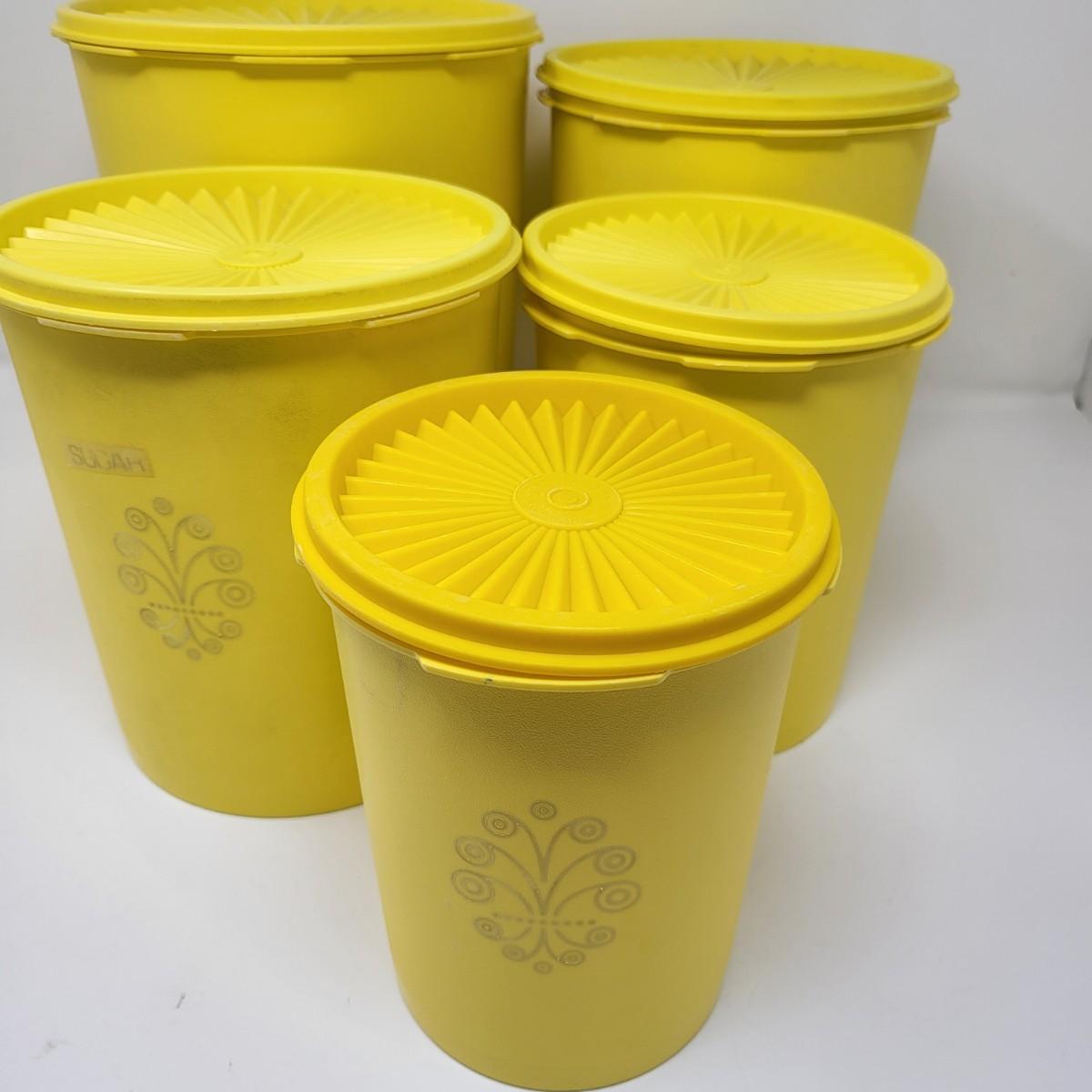 Set of five vintage yellow Tpperware brand plastic canisters. Smallest is 6" and ranges up to the largest at 9.5" tall. All have lids. Included is various lidded bowls, mugs (some with lids) and green lidded canister single.